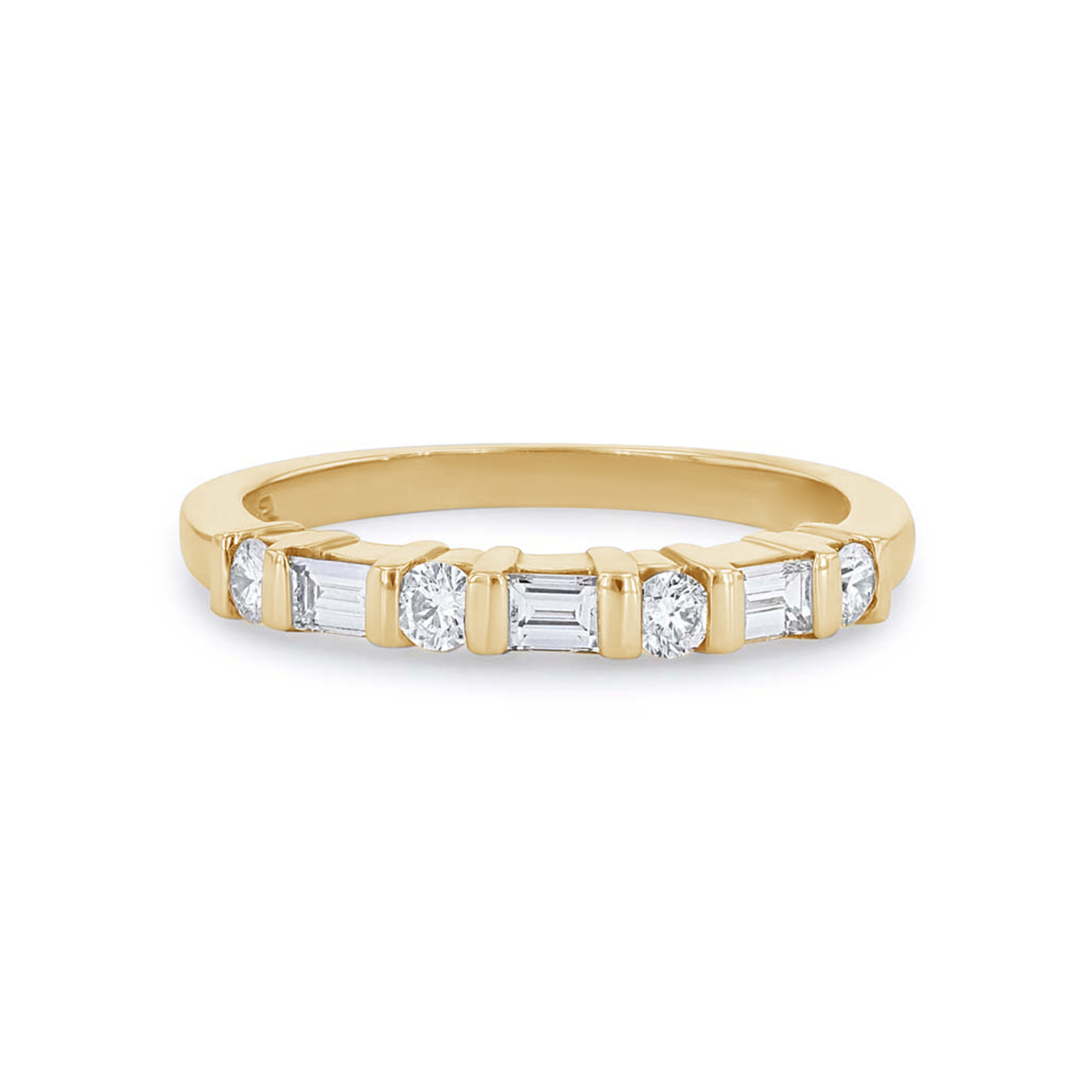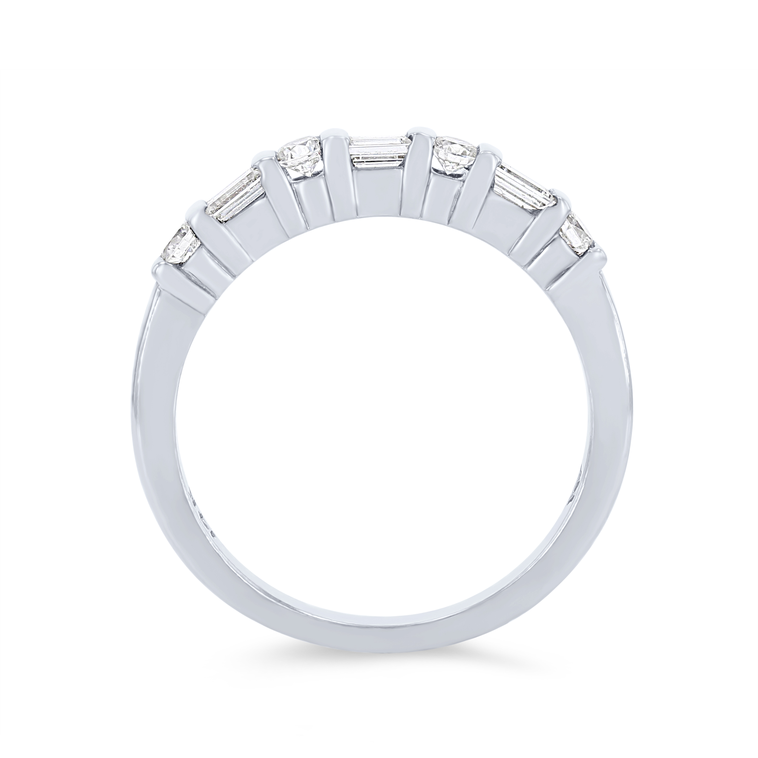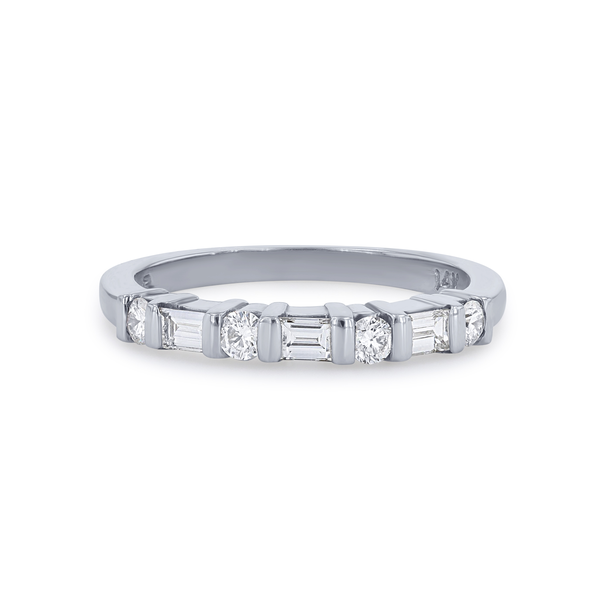 Separated by bars and alternating are round brilliant cut and baguette cut diamonds totaling 0.45 carats.