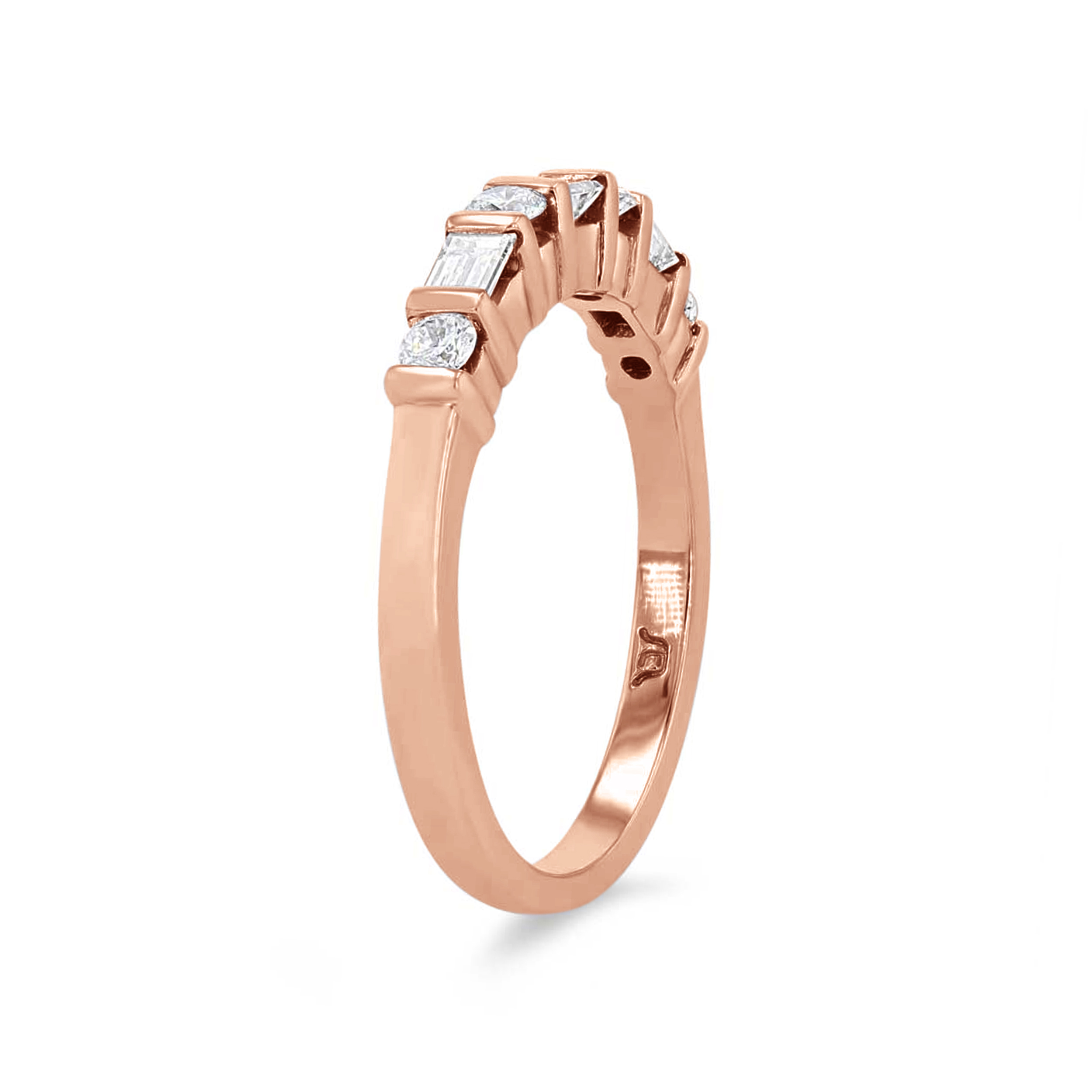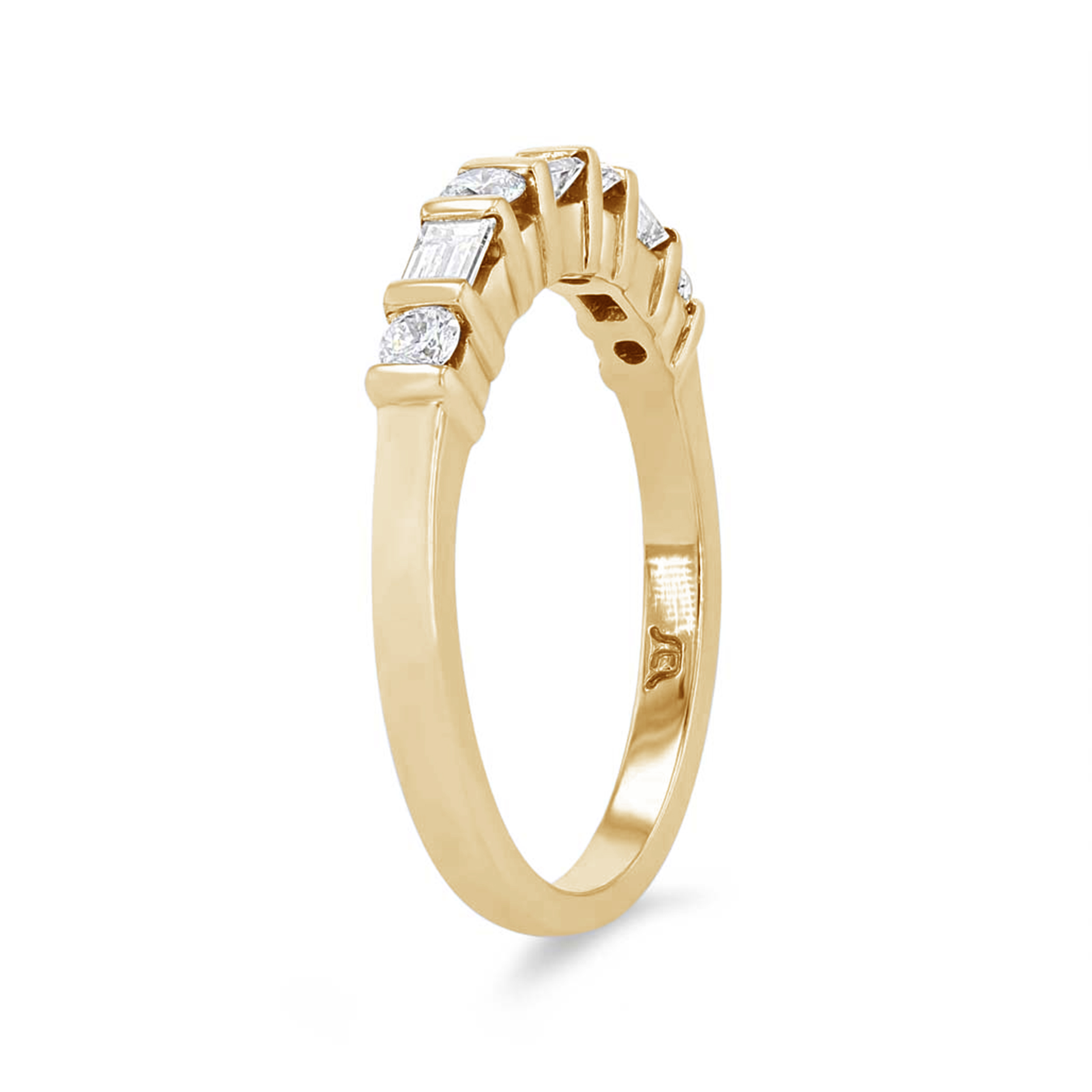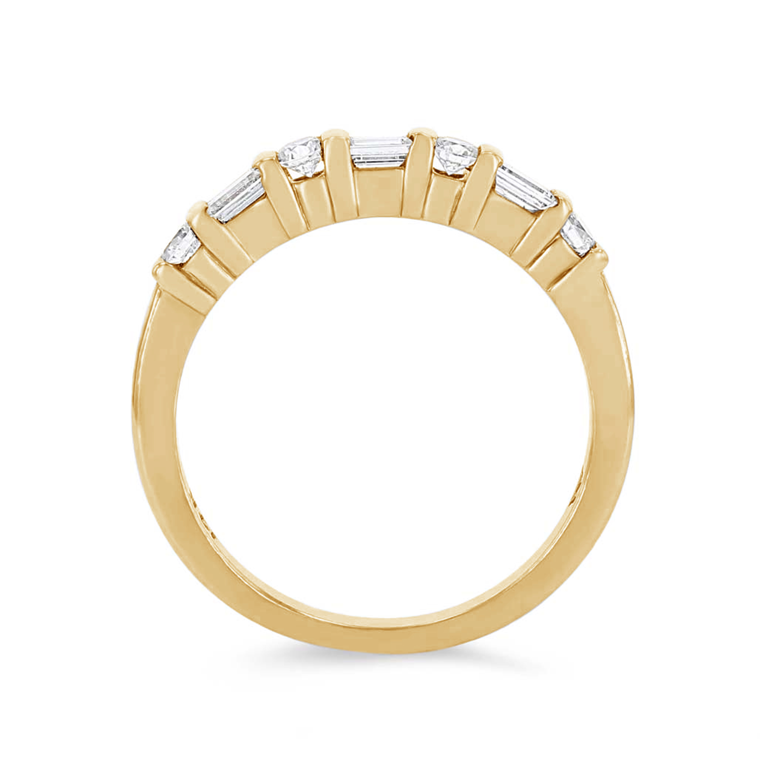 Separated by bars and alternating are round brilliant cut and baguette cut diamonds totaling 0.45 carats.