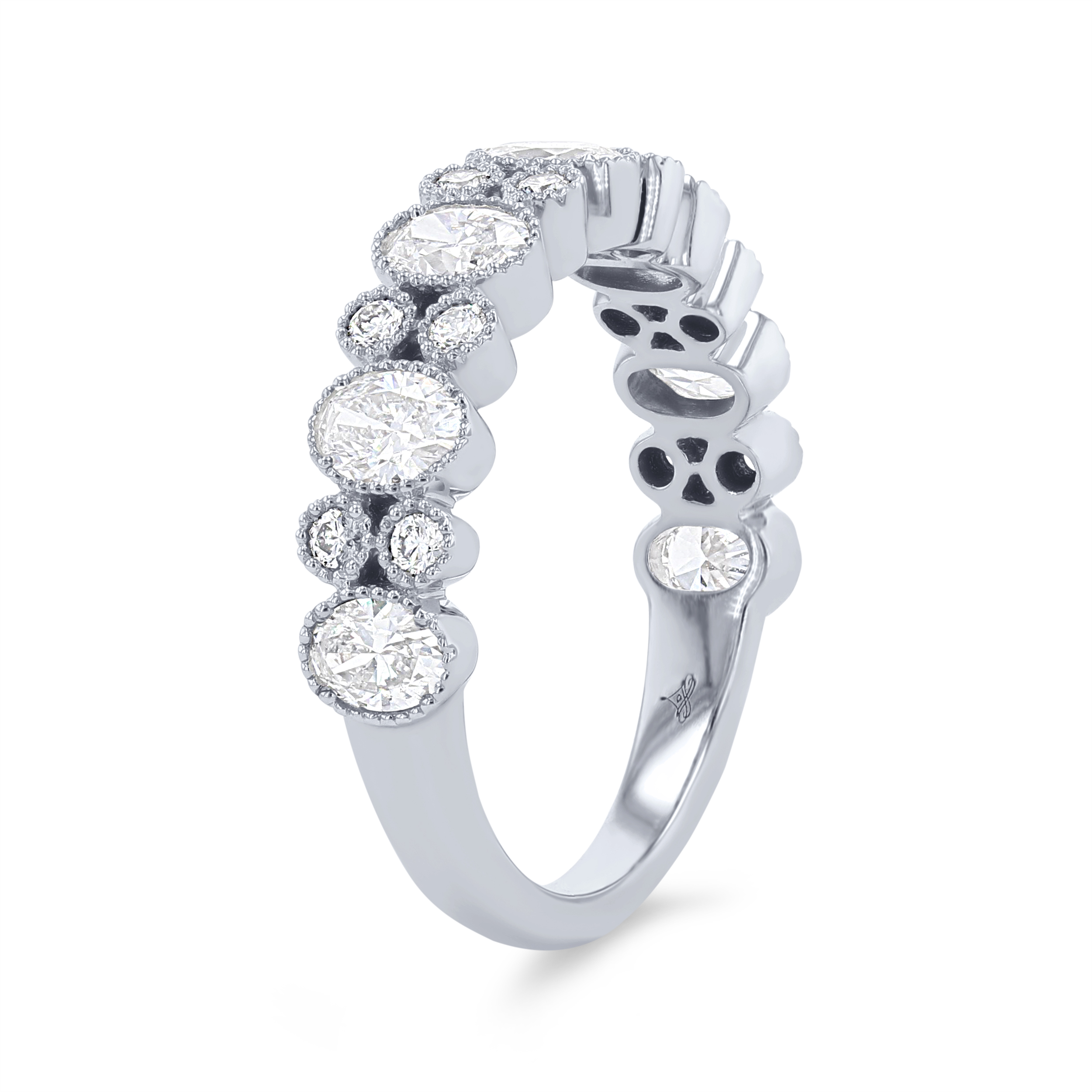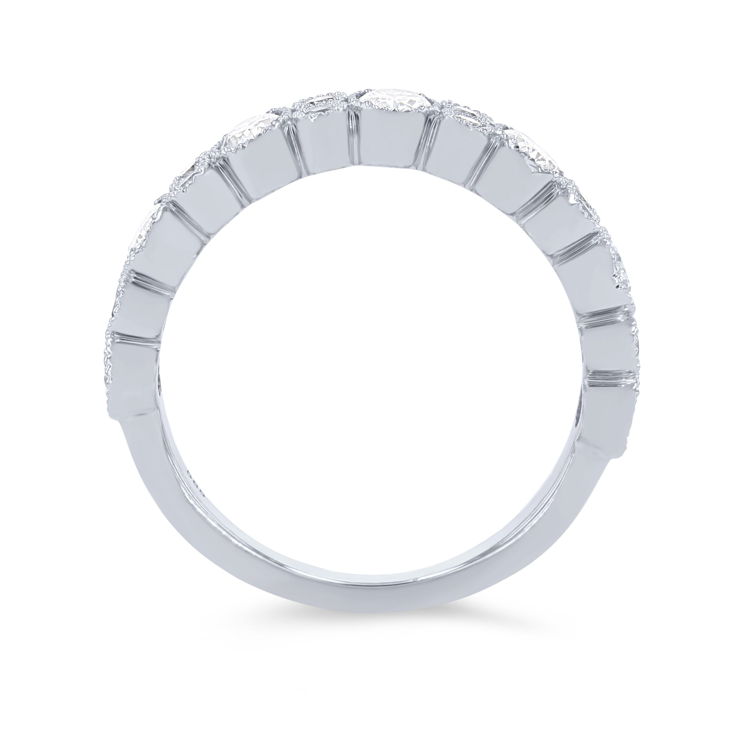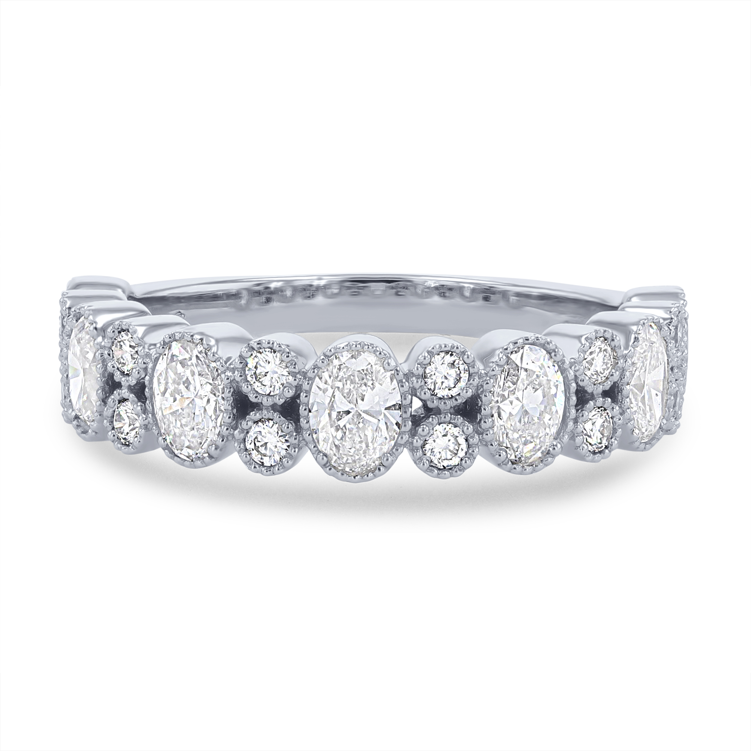 Product Description Beautiful oval cut diamonds totaling 1.02 carats alternate between round brilliant cut diamonds totaling 0.18 carats. The milgrain detail creates a unique vintage look. Other Details Gemstone Type: Diamond Total Setting Diamond Carat Weight: 1.2TW Wedding Band Type: Bezel Metal Color: Yellow Gold Disable Reason: None Metal Color: Platinum Ring Type: Fashion Metal Color: Rose Gold Diamond: Vintage Type: Ladies Wedding Band Metal Color: White Gold