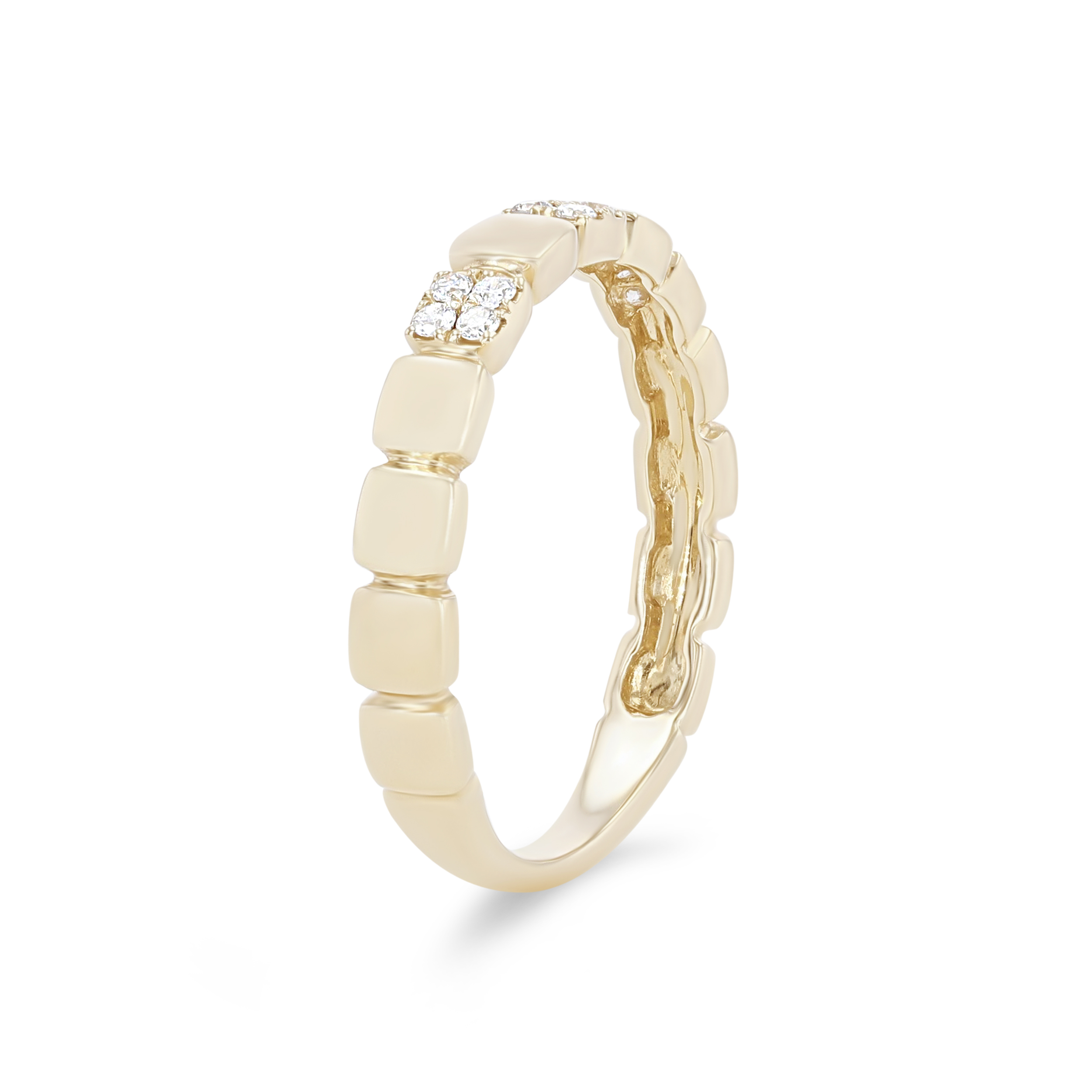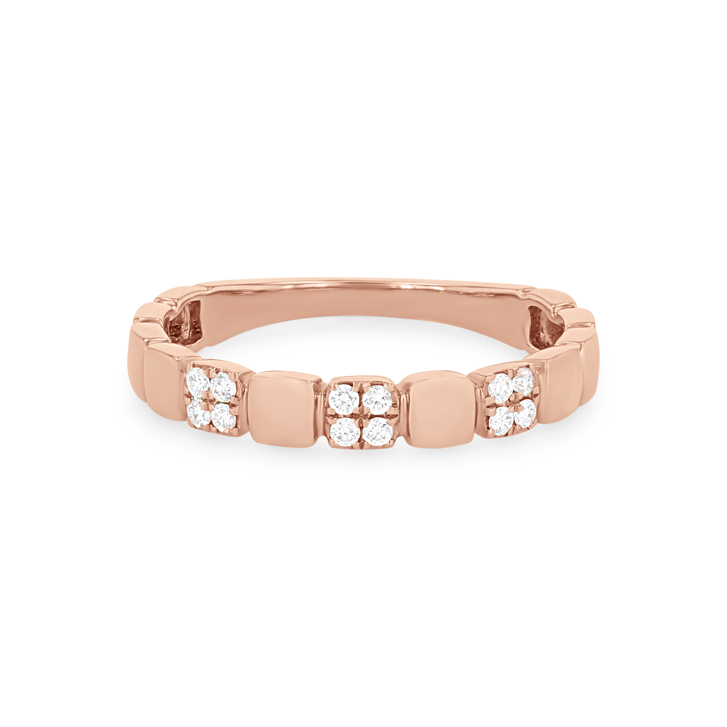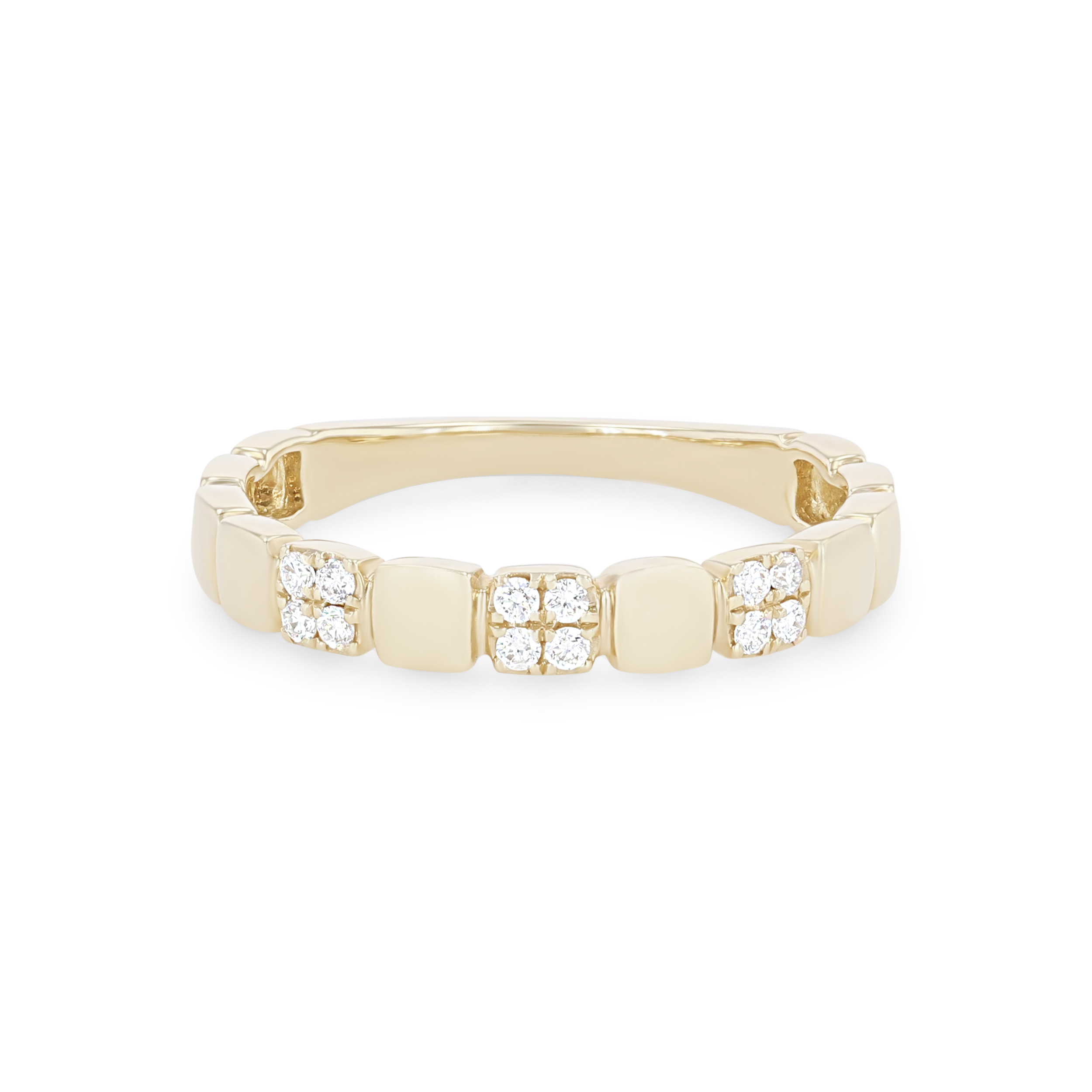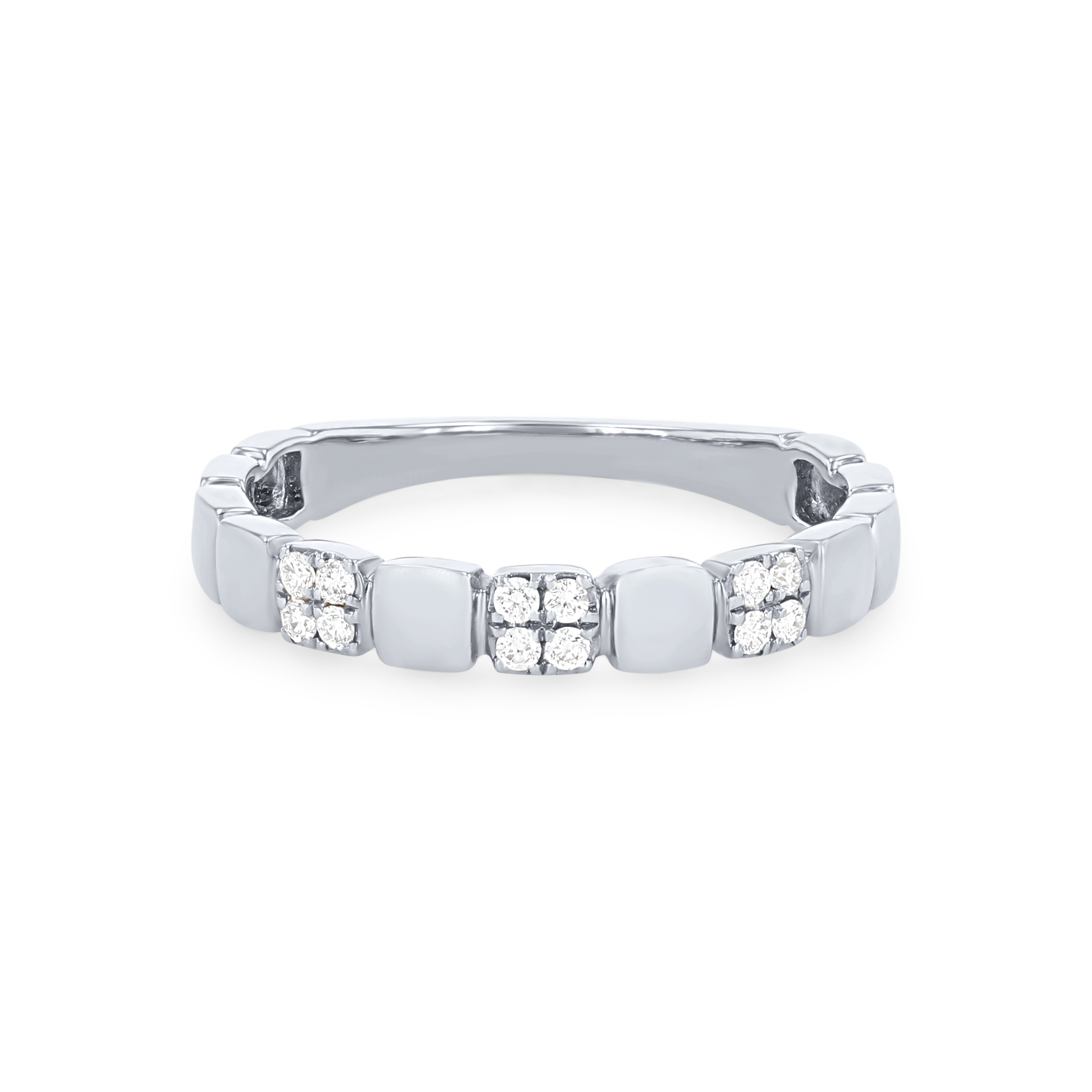 Product Description A trend-worthy addition to any set, this wedding band features high-polished plain squares alternating with round brilliant cut diamonds totaling 0.12 carats. Other Details Wedding Band Type: Stackable Disable Reason: None Metal Color: Yellow Gold Metal Color: Rose Gold Type: Ladies Wedding Band Gemstone Type: Diamond Total Setting Diamond Carat Weight: 0.12TW Metal Color: White Gold Style: Contemporary