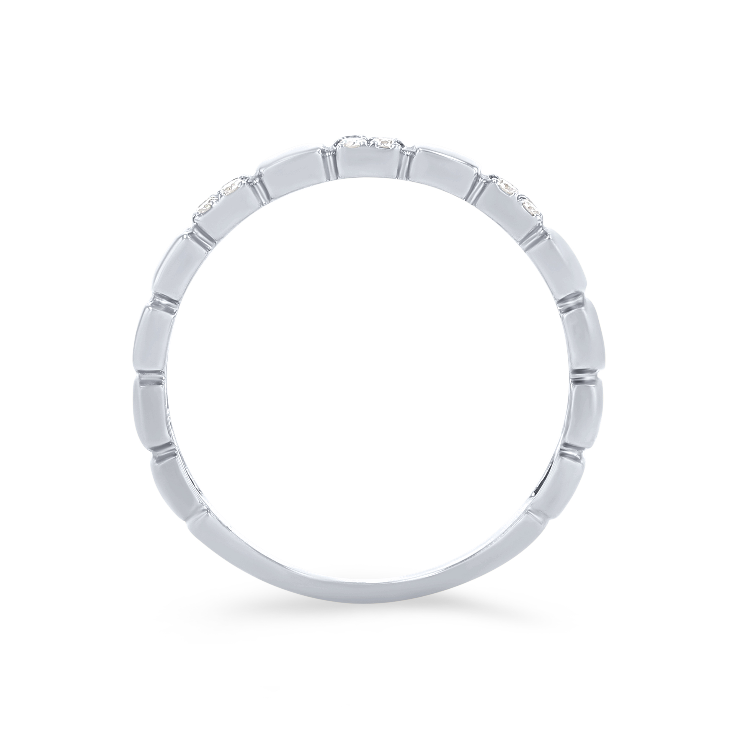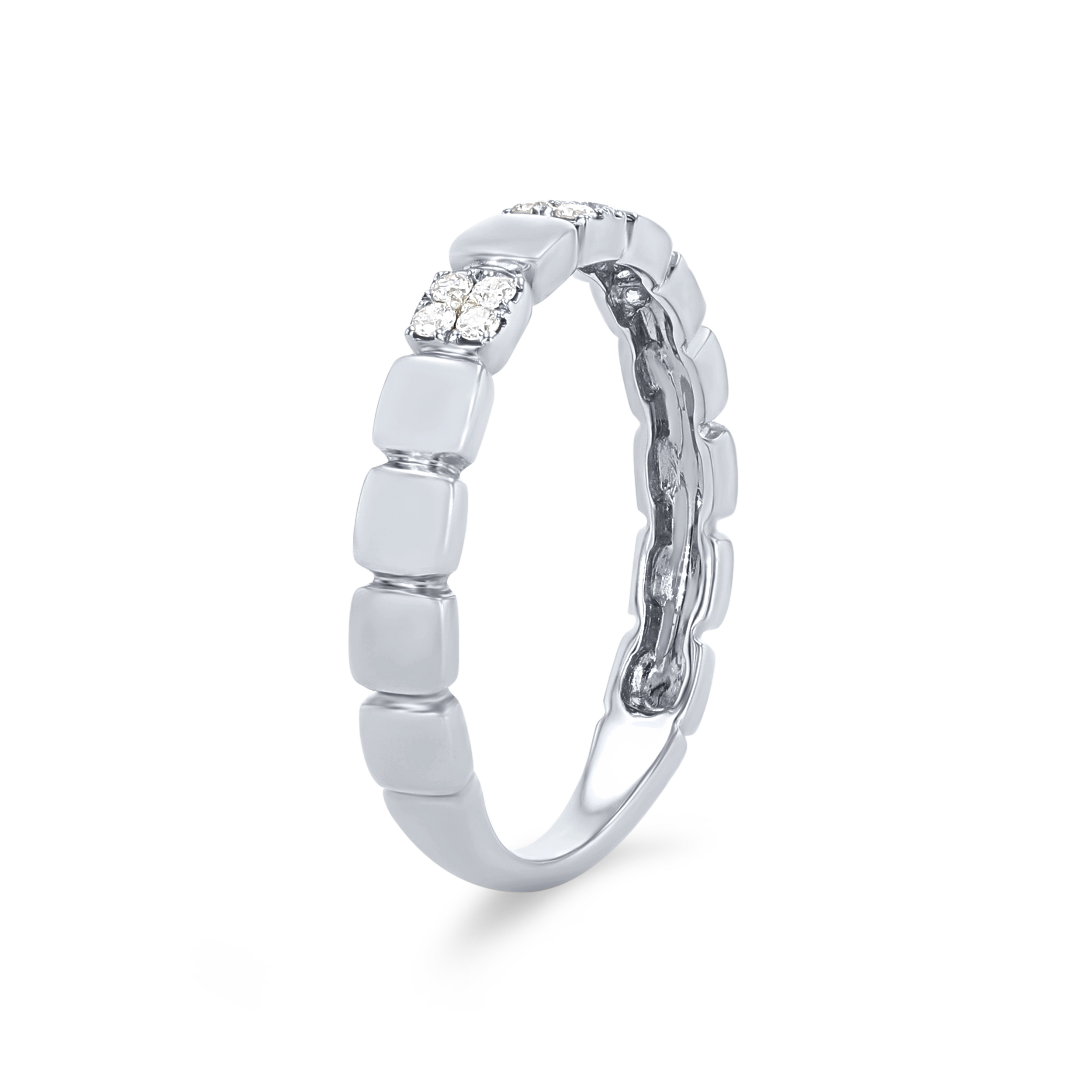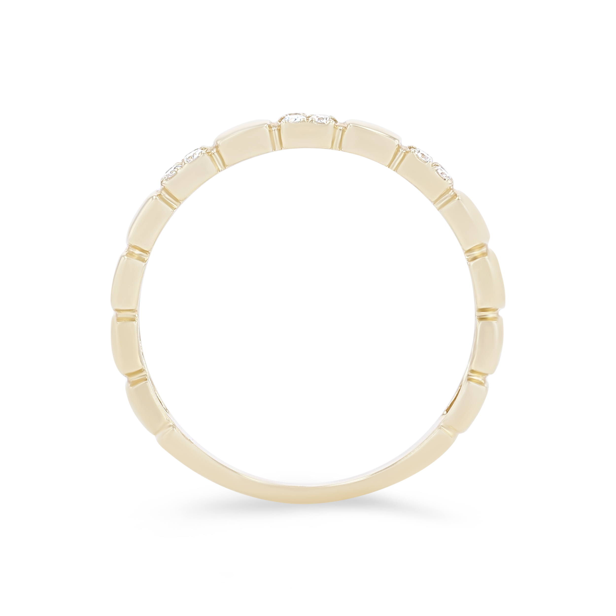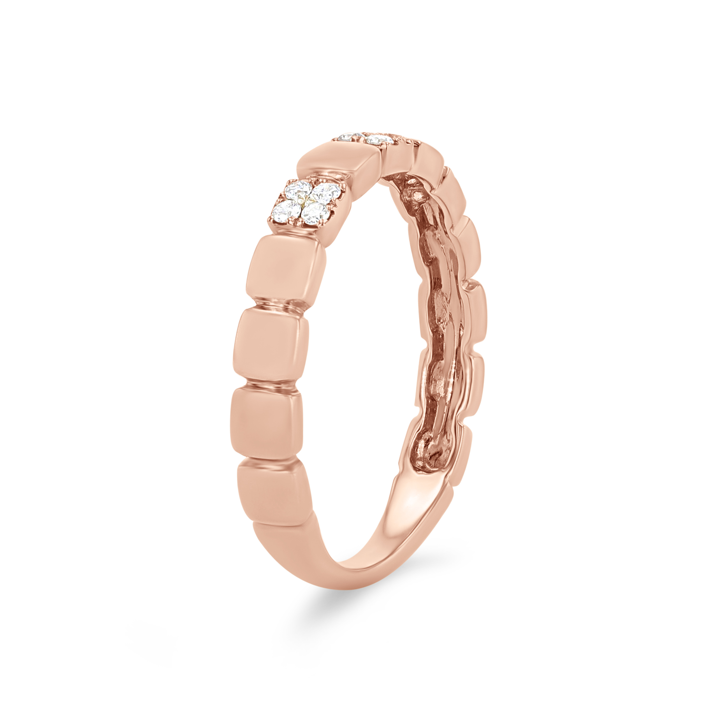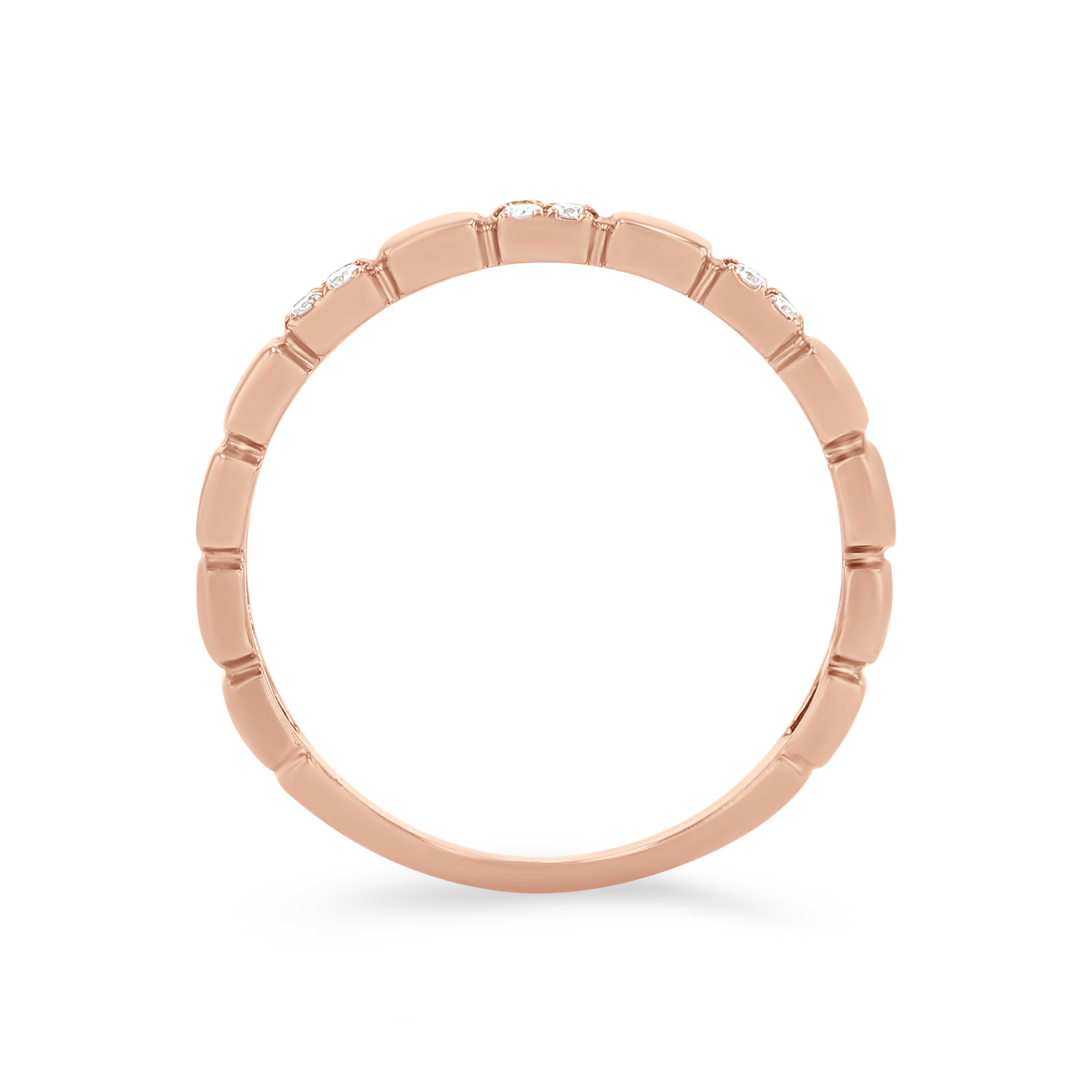 Product Description A trend-worthy addition to any set, this wedding band features high-polished plain squares alternating with round brilliant cut diamonds totaling 0.12 carats. Other Details Wedding Band Type: Stackable Disable Reason: None Metal Color: Yellow Gold Metal Color: Rose Gold Type: Ladies Wedding Band Gemstone Type: Diamond Total Setting Diamond Carat Weight: 0.12TW Metal Color: White Gold Style: Contemporary