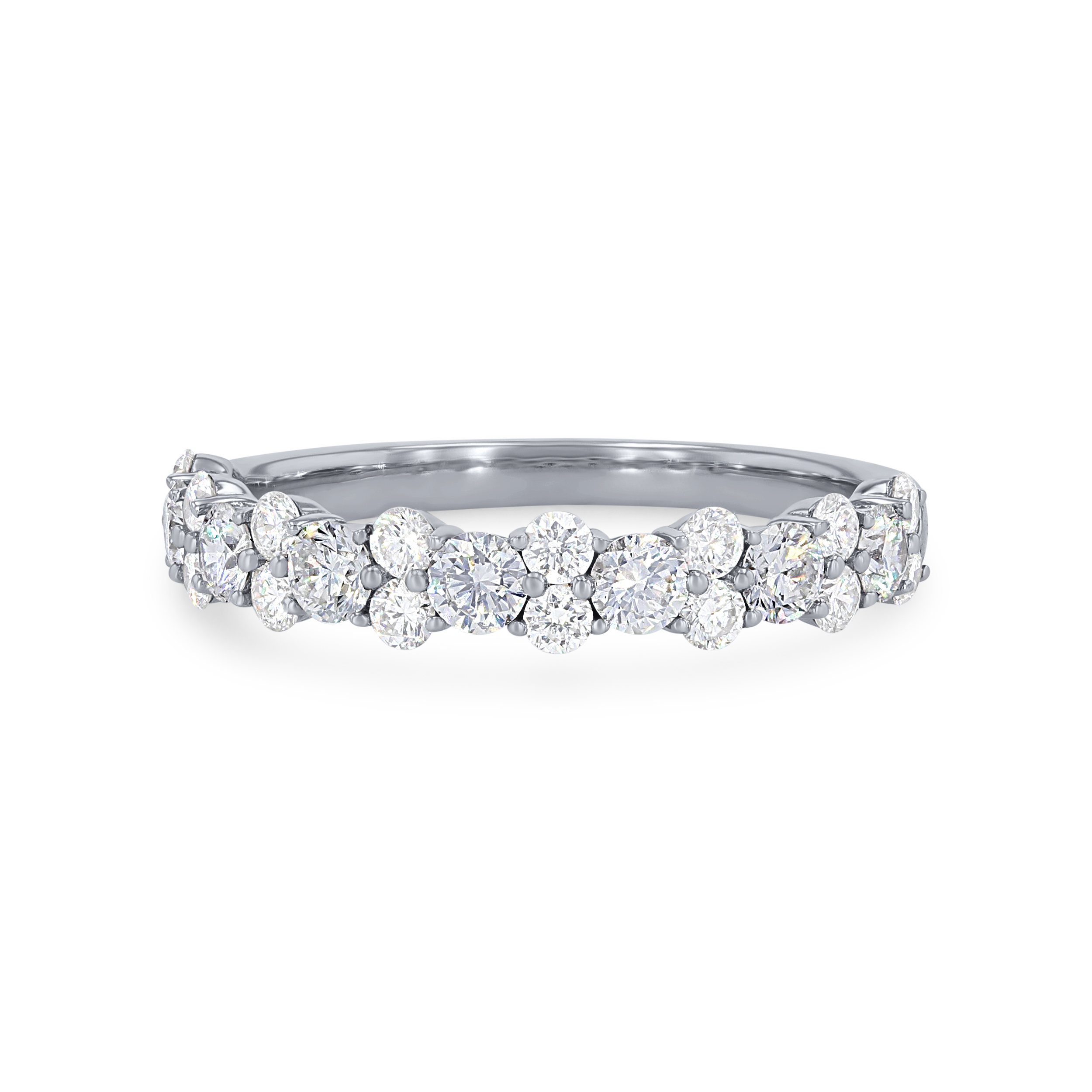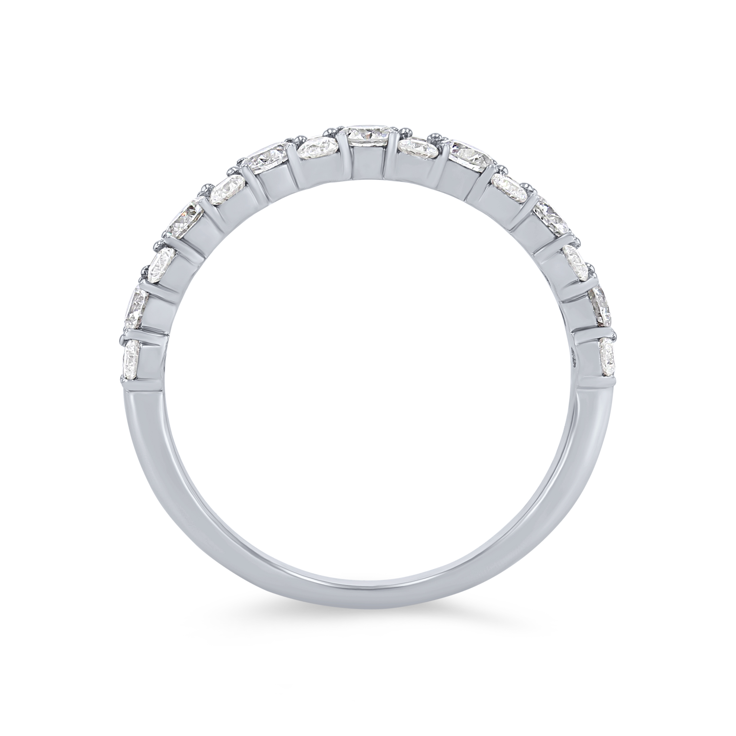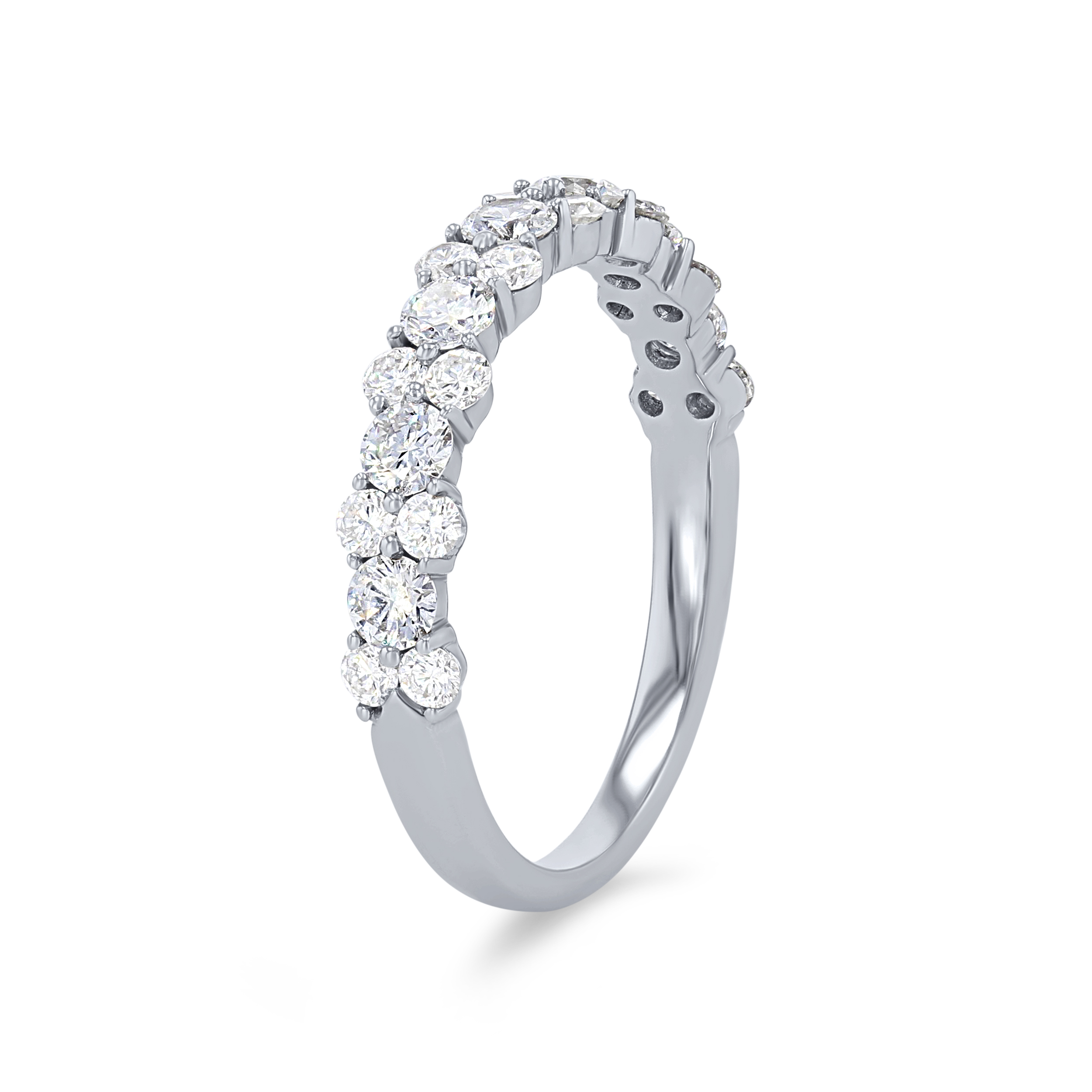 This stunning wedding band showcases 0.93 carats of round brilliant cut diamonds, alternating between one and two stacked together.