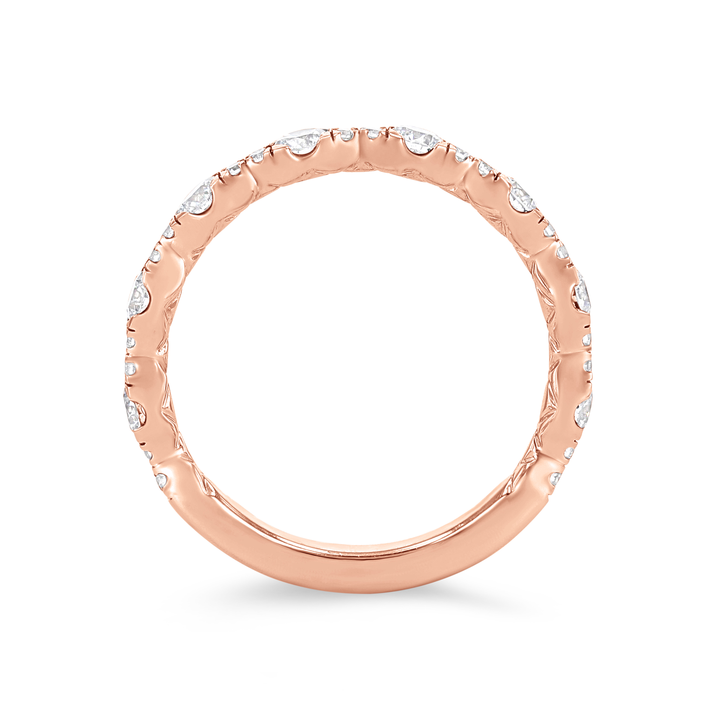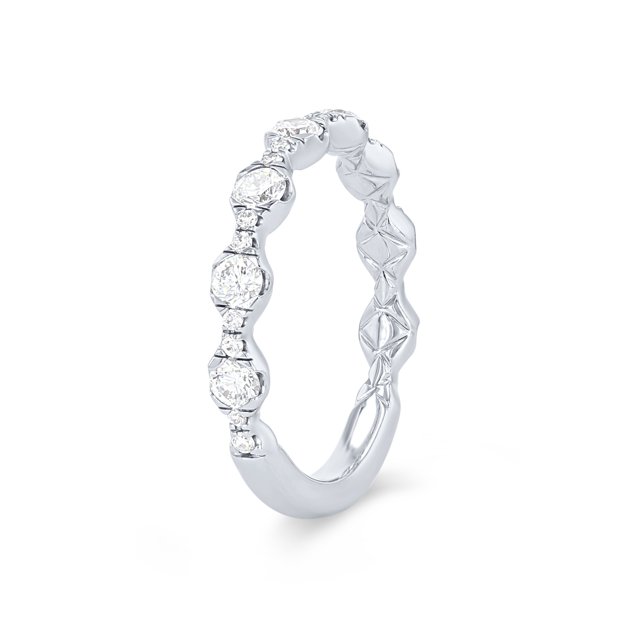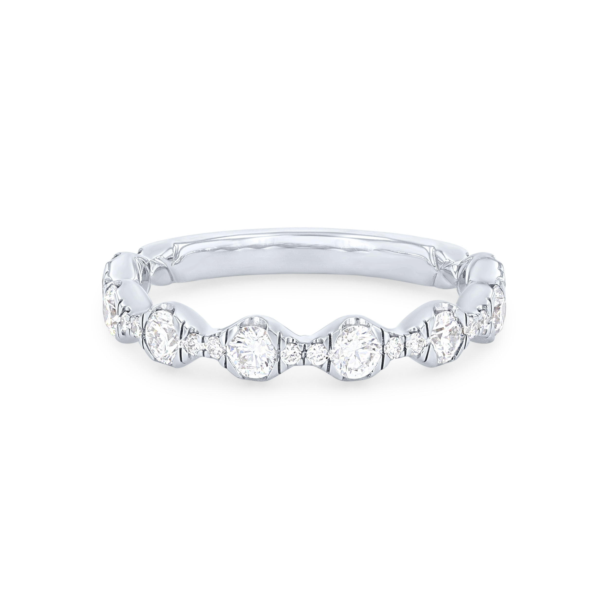 Product Description Round brilliant cut diamonds graduating in size are set beautifully in this contemporary wedding band, totaling 0.75 carats. Other Details Type: Ladies Wedding Band Metal Color: Rose Gold Metal Color: Yellow Gold Diamond: Stackable Gemstone Type: Diamond Total Setting Diamond Carat Weight: 0.75TW Wedding Band Type: Prong Set Metal Color: Platinum Metal Color: White Gold Disable Reason: None Style: Contemporary