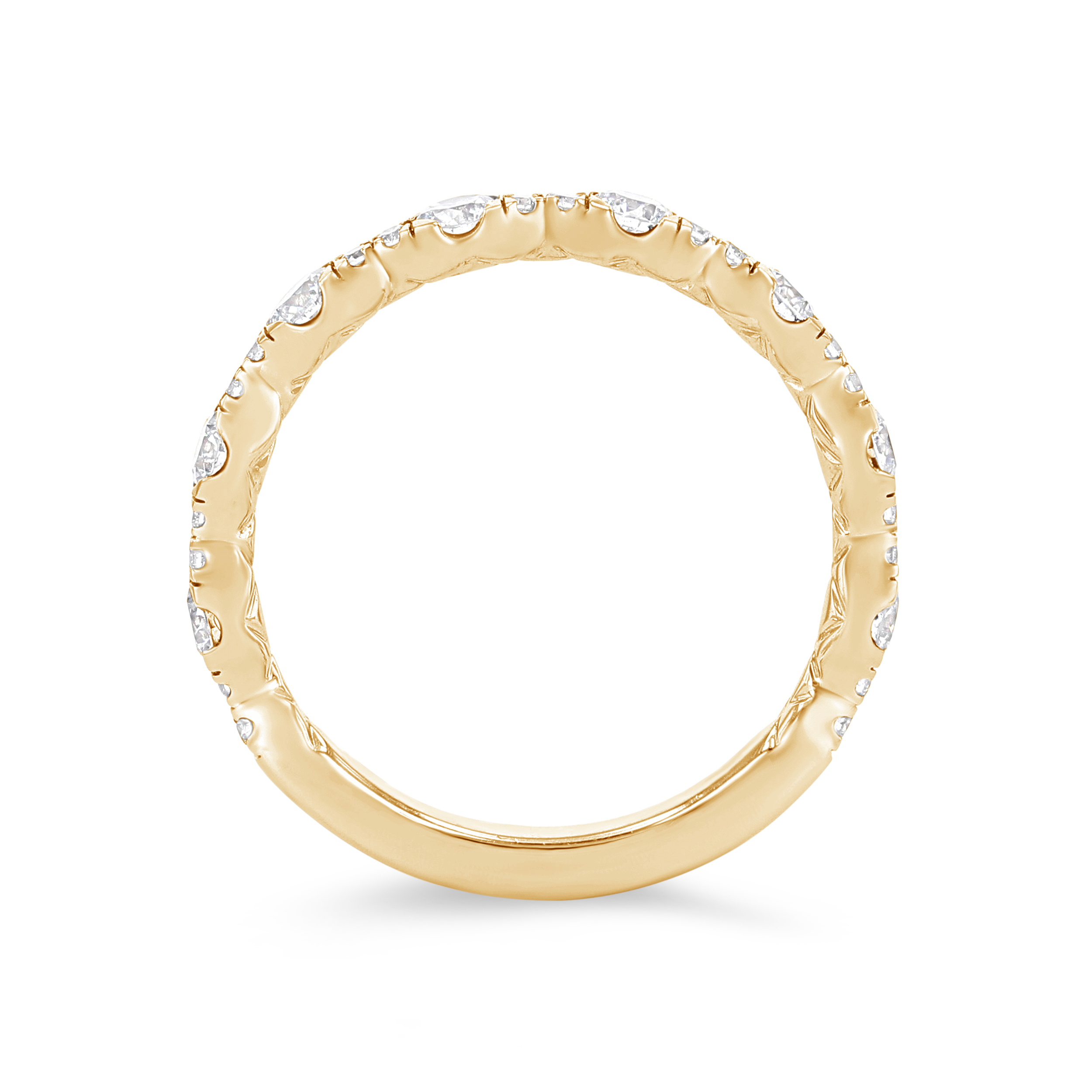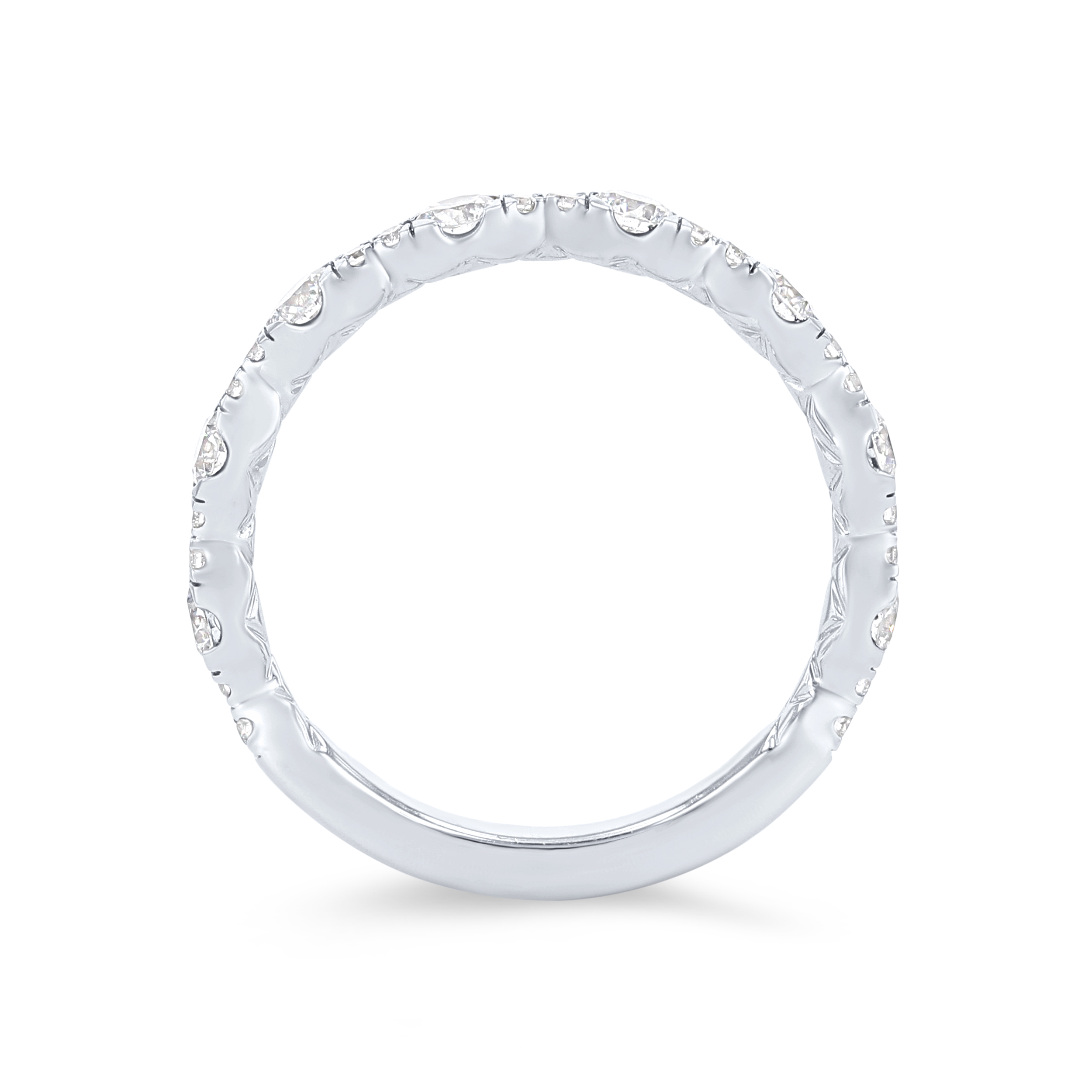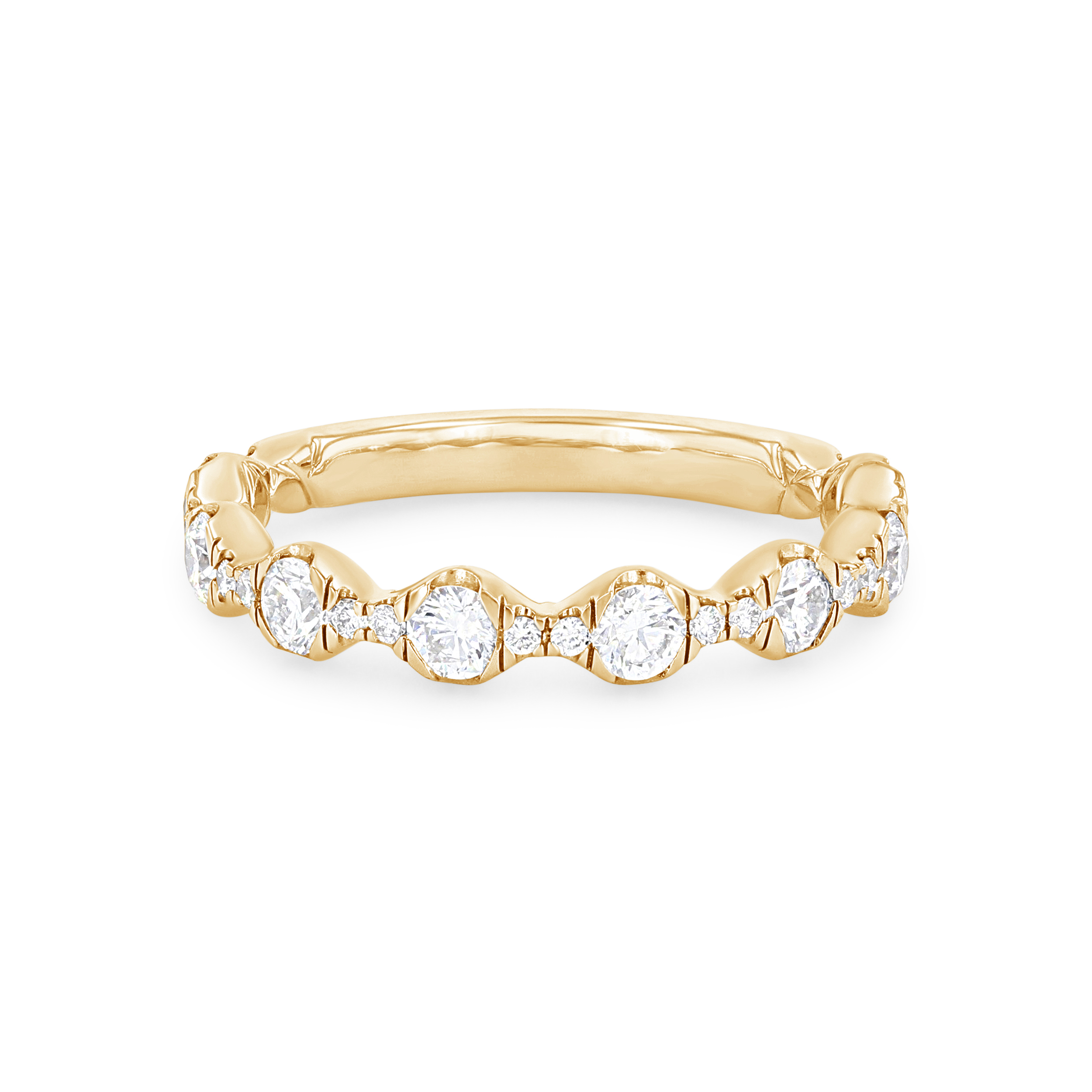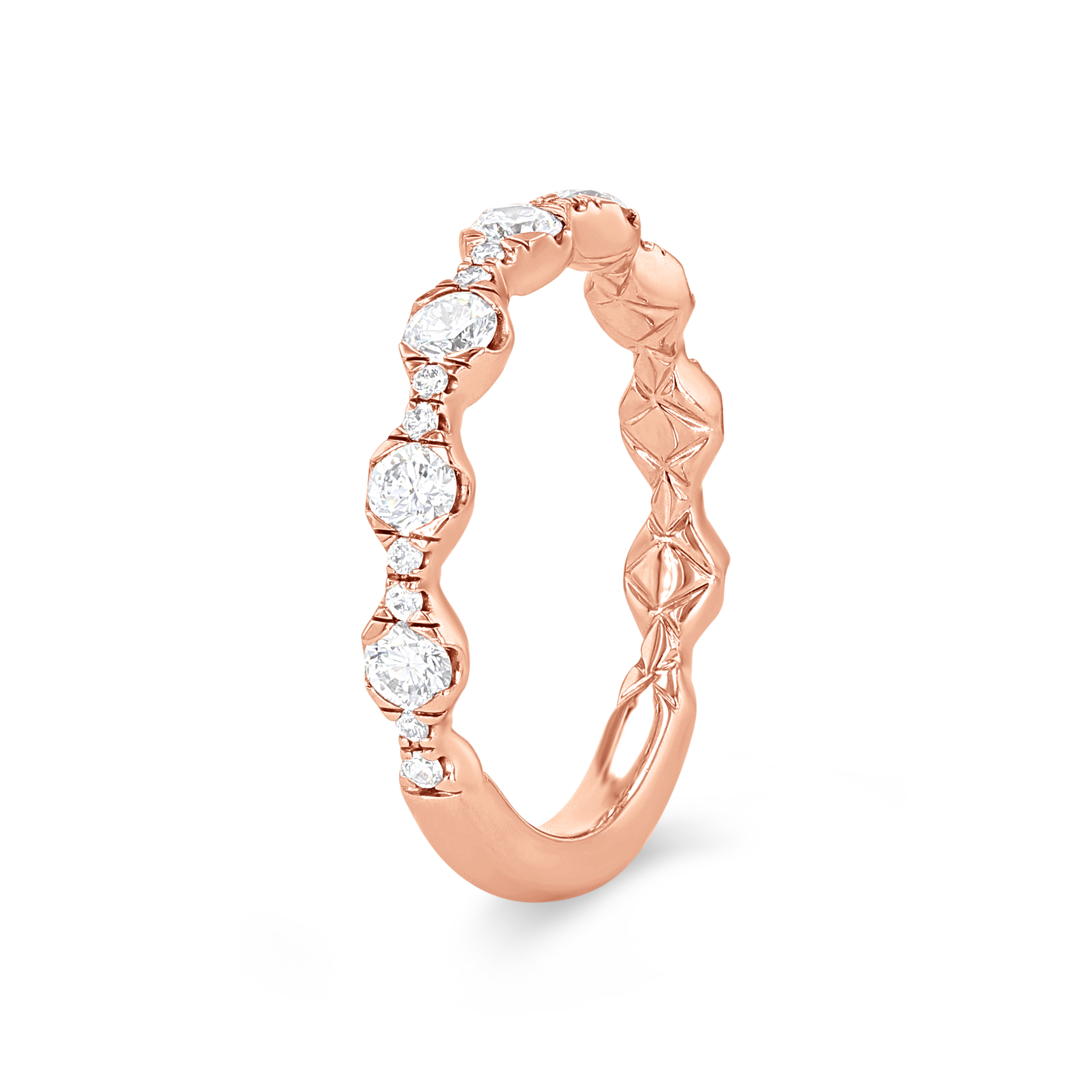 Product Description Round brilliant cut diamonds graduating in size are set beautifully in this contemporary wedding band, totaling 0.75 carats. Other Details Type: Ladies Wedding Band Metal Color: Rose Gold Metal Color: Yellow Gold Diamond: Stackable Gemstone Type: Diamond Total Setting Diamond Carat Weight: 0.75TW Wedding Band Type: Prong Set Metal Color: Platinum Metal Color: White Gold Disable Reason: None Style: Contemporary