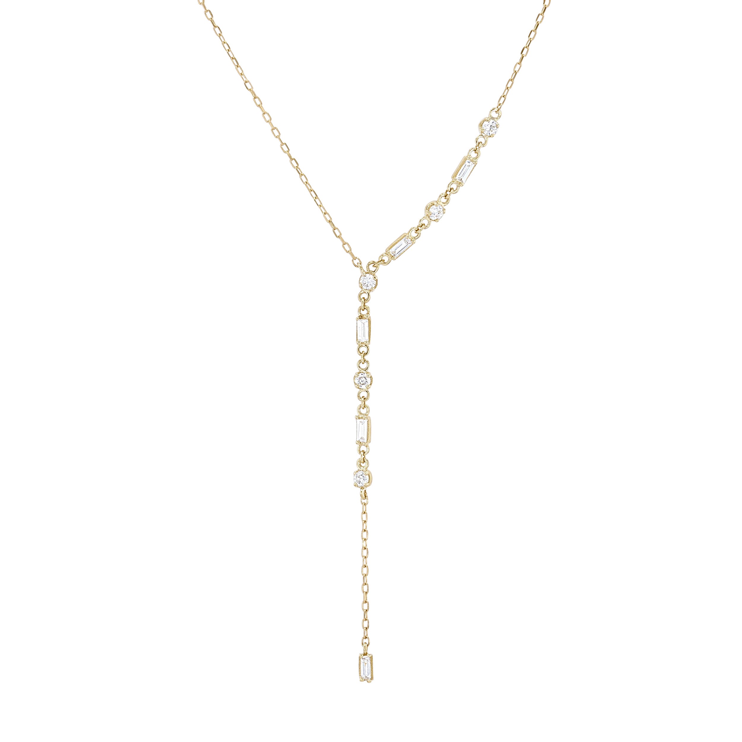 Product Description This beautiful modern "Y" necklace features baguette and round brilliant cut diamonds alternating down one side that total 0.36 carats. Other Details Metal Color: White Gold Style: Contemporary Type: Necklace Disable Reason: None Metal Color: Yellow Gold Length: 18 IN Total Setting Diamond Carat Weight: 0.36TW Necklace Type: Fashion Gemstone Type: Diamond Pendant Type: Y-Necklace