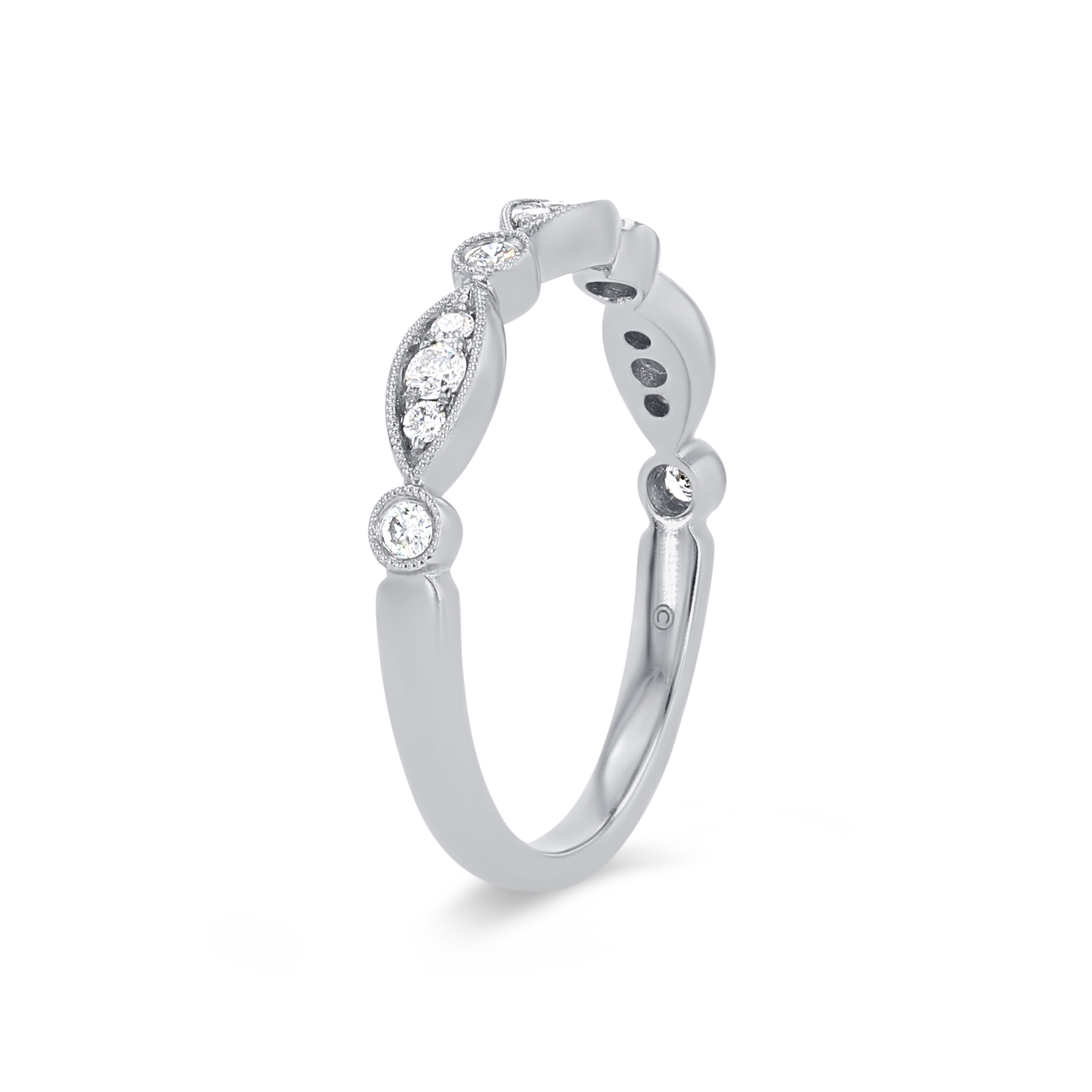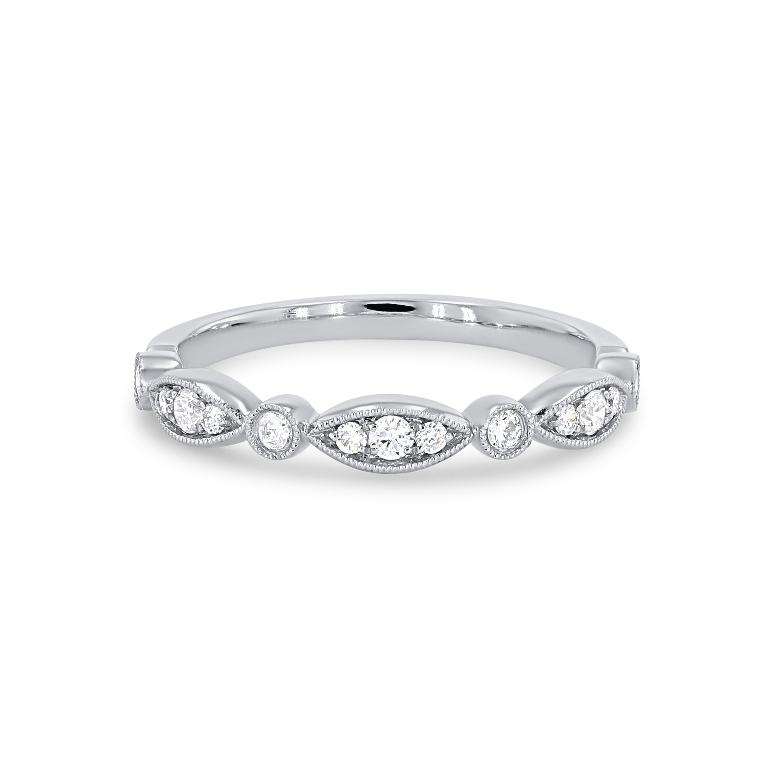 Product Description Round brilliant cut diamonds totaling 0.22 carats alternate in marquise-shaped frames and bezels, complete with milgrain edges. Other Details Metal Color: Yellow Gold Total Setting Diamond Carat Weight: 0.22TW Metal Color: White Gold Gemstone Type: Diamond Metal Color: Rose Gold Disable Reason: None Wedding Band Type: Bezel Metal Color: Platinum Style: Vintage Diamond: Stackable Type: Ladies Wedding Band
