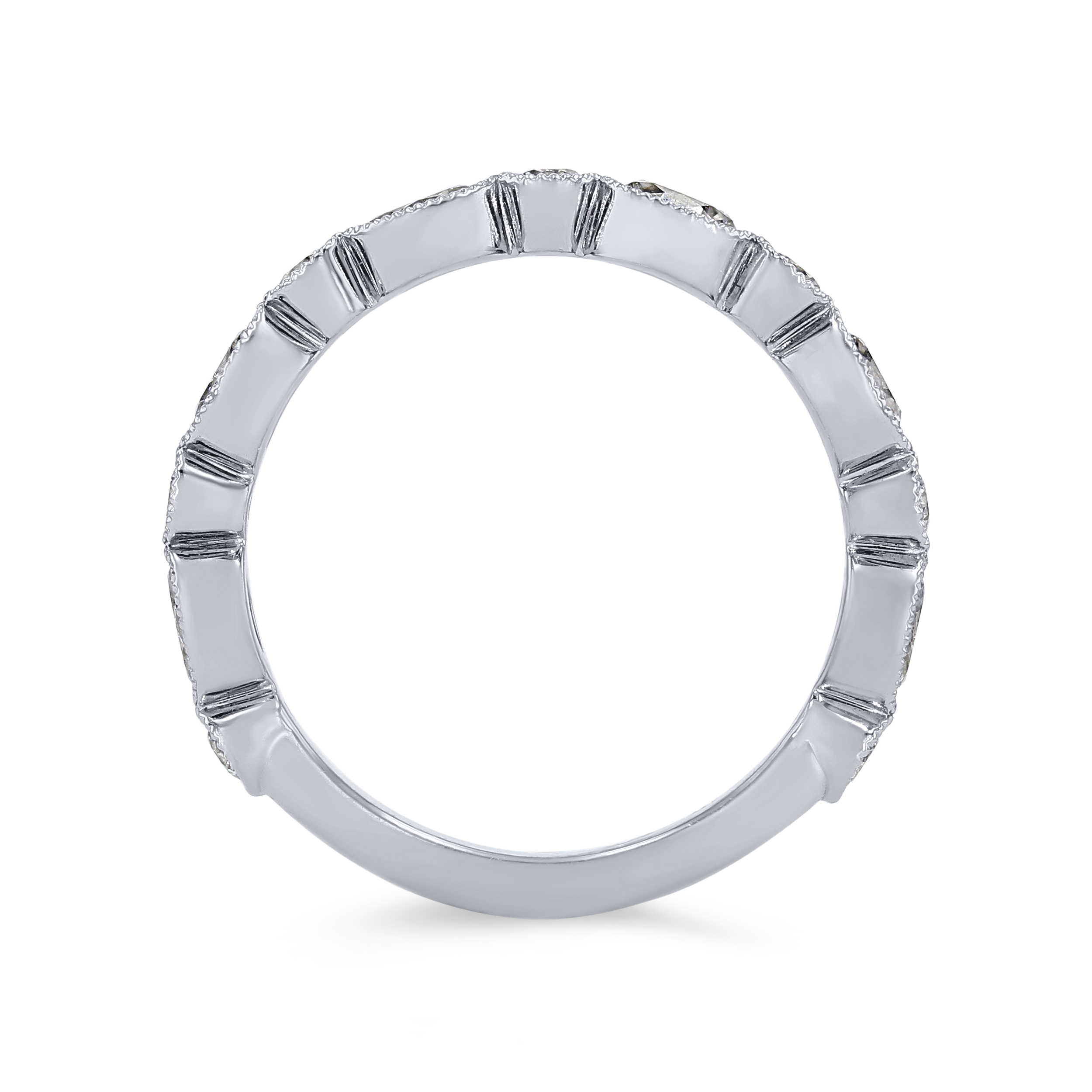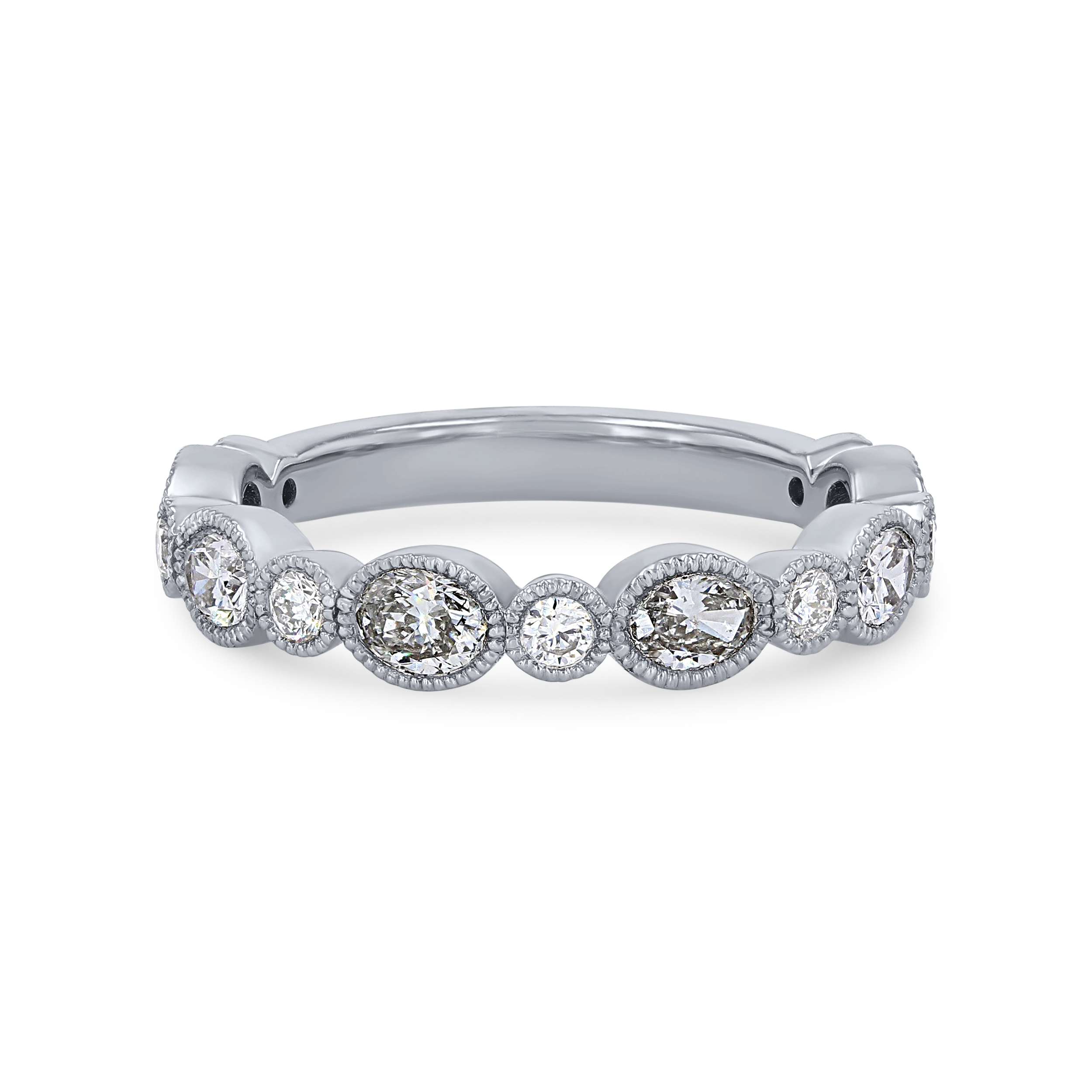 Product Description Alternating in this bezel band are round brilliant cut and oval cut diamonds totaling 1.03 carats. The milgrain detail creates a soft vintage look. Other Details Diamond: Bezel Metal Color: Platinum Type: Ladies Wedding Band Wedding Band Type: Fancy Shapes Metal Color: Rose Gold Disable Reason: None Metal Color: White Gold Style: Vintage Gemstone Type: Diamond Metal Color: Yellow Gold Total Setting Diamond Carat Weight: 1.03TW