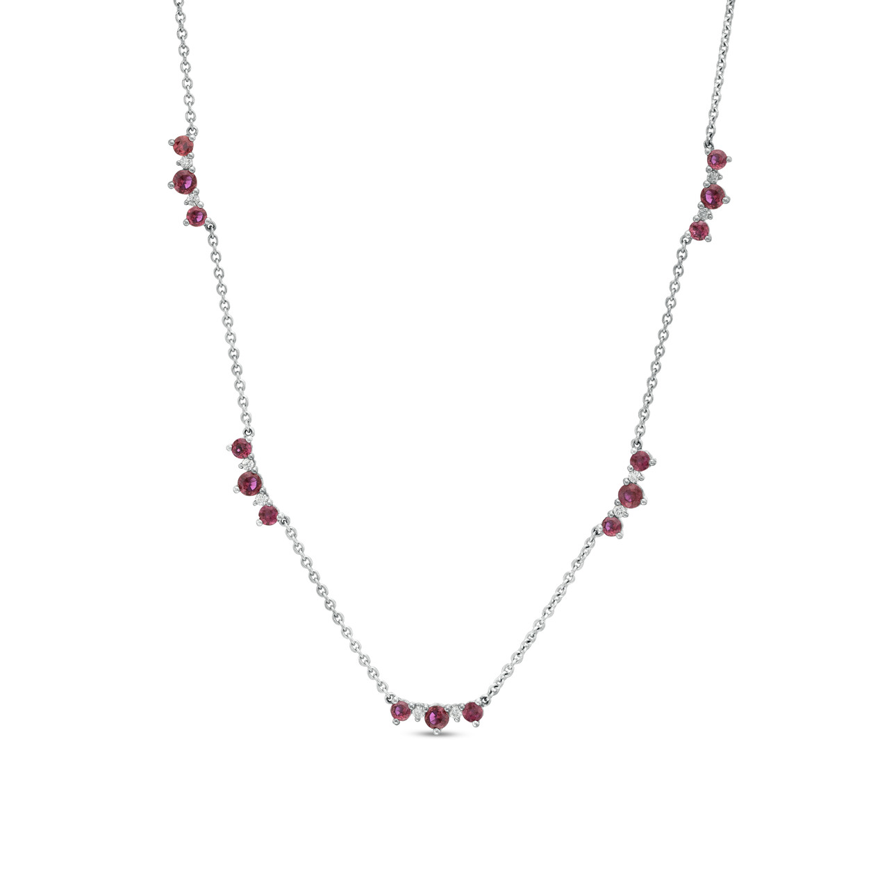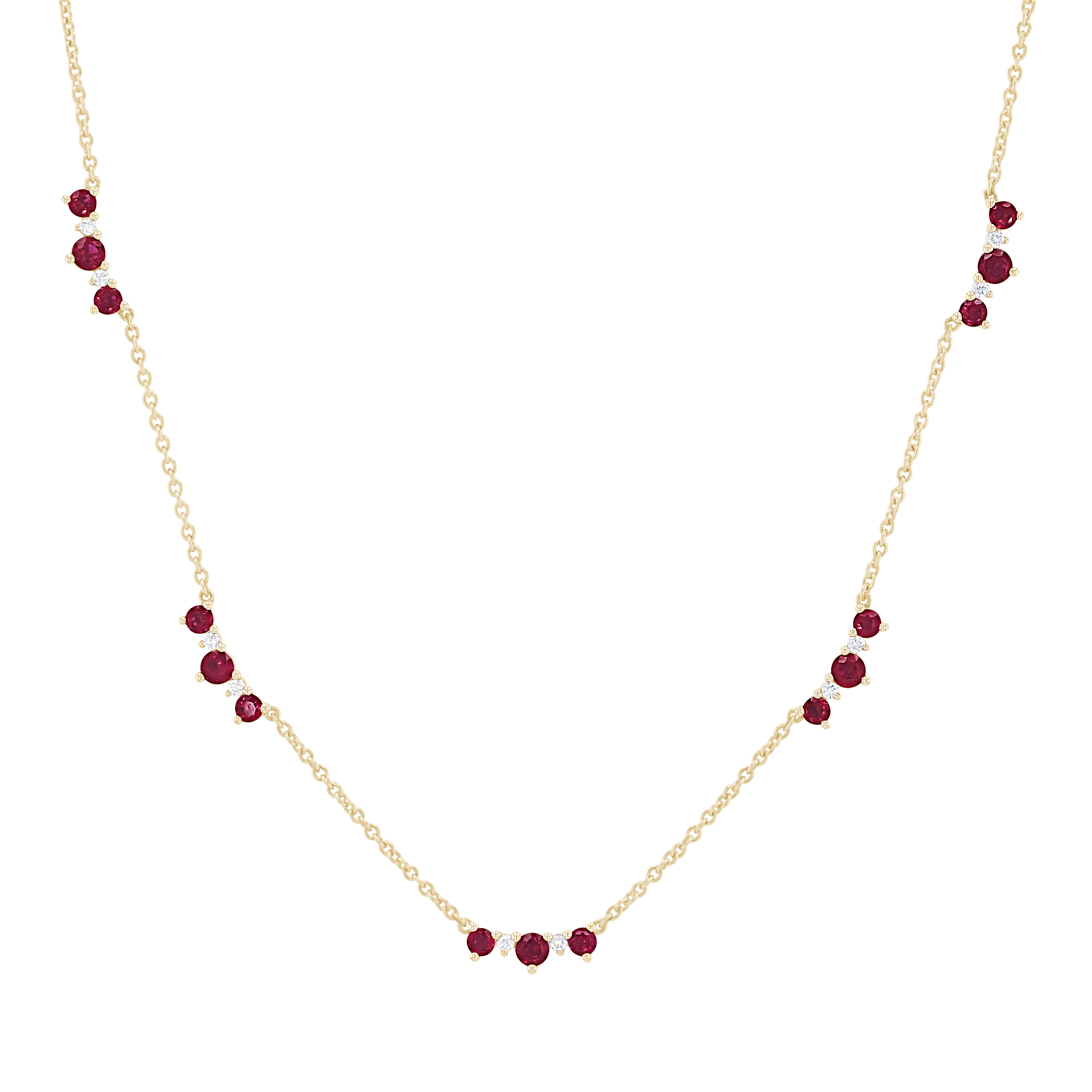 Product Description This beautiful, contemporary necklace features stations of rubies totaling 1.42 carats and round brilliant cut diamonds totaling 0.13 carats. Other Details Gemstone Type: Ruby Metal Color: White Gold Necklace Type: Fashion Total Setting Diamond Carat Weight: 0.13TW Total Gemstone Carat Weight: 1.42TW Disable Reason: None Pendant Type: Gemstone Metal Color: Yellow Gold Type: Necklace Style: Contemporary
