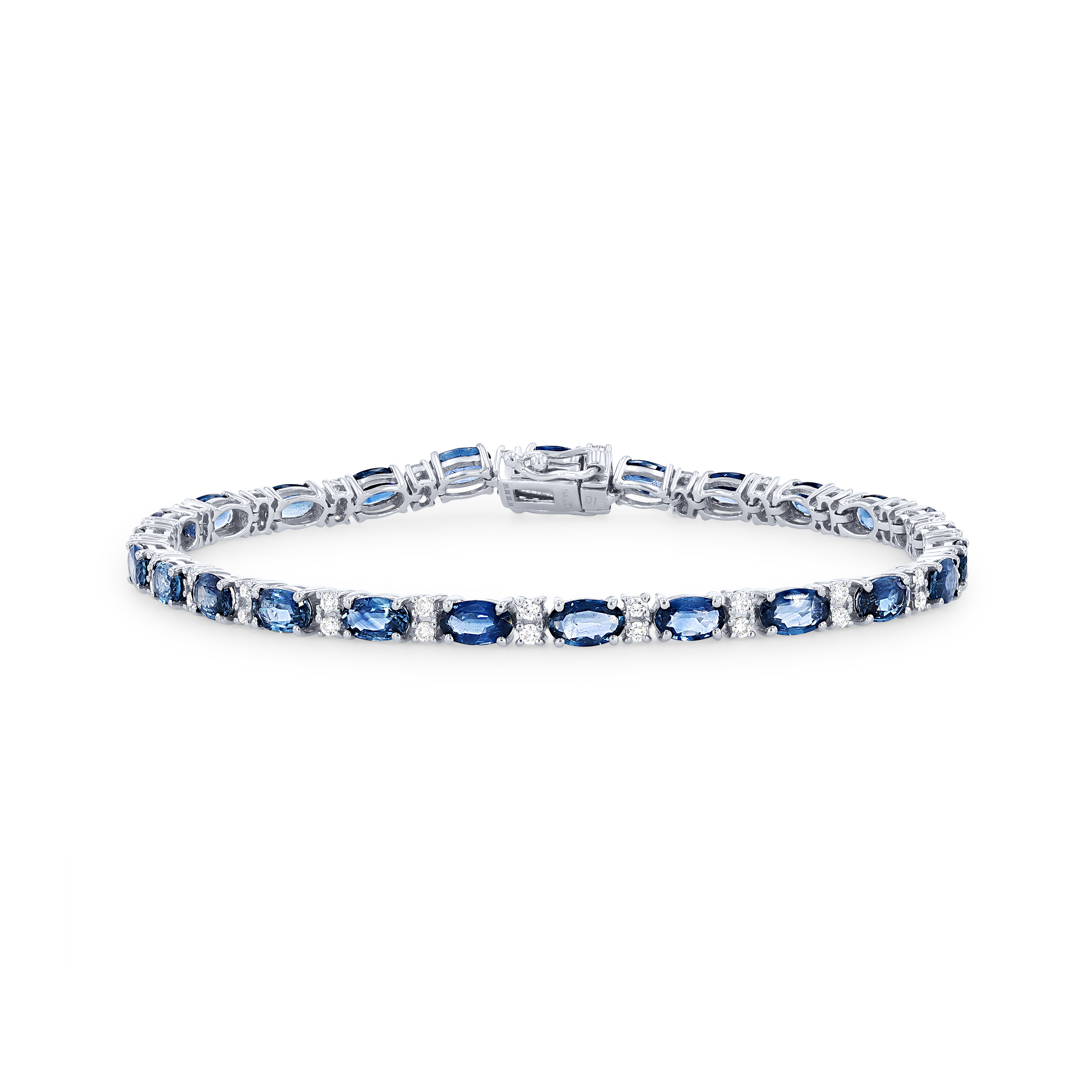 Product Description A beautiful way to add color to any collection, this tennis bracelet features oval cut blue sapphires totaling 6.78 carats alternating between 0.56 carats of round brilliant cut diamonds. Other Details Type: Bracelet Total Setting Diamond Carat Weight: 0.56TW Length: 7 IN Style: Classic Disable Reason: None Total Gemstone Carat Weight: 6.78TW Bracelet Type: Gemstone Metal Color: White Gold Gemstone Type: Sapphire