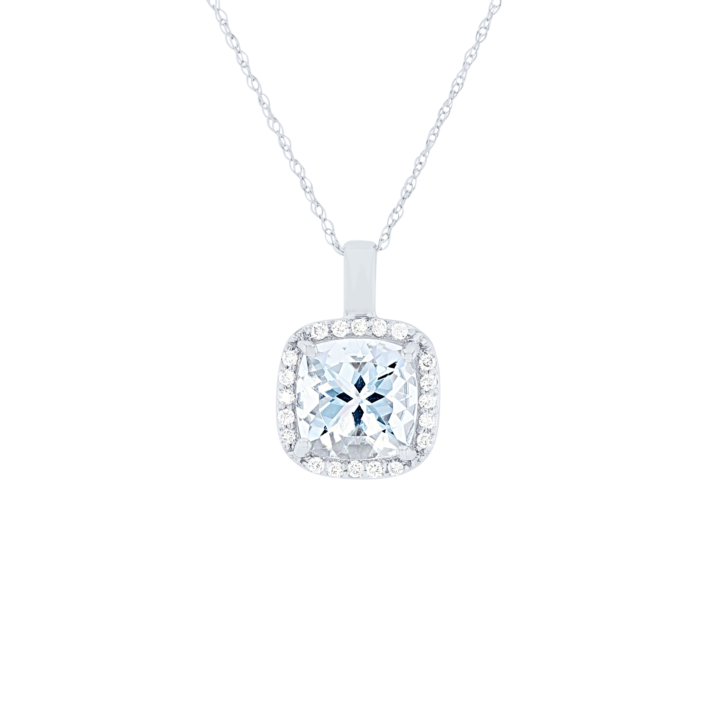 Product Description Perfect for the one wanting something blue, this pendant features a cushion cut aquamarine weighing 1.85 carats surrounded by round brilliant cut diamonds totaling 0.13 carats. Other Details Total Gemstone Carat Weight: 1.85TW Metal Color: White Gold Necklace Type: Fashion Length: 18 IN Pendant Type: Gemstone Total Setting Diamond Carat Weight: 0.13TW Style: Classic Gemstone Type: Aqua Type: Necklace Disable Reason: None