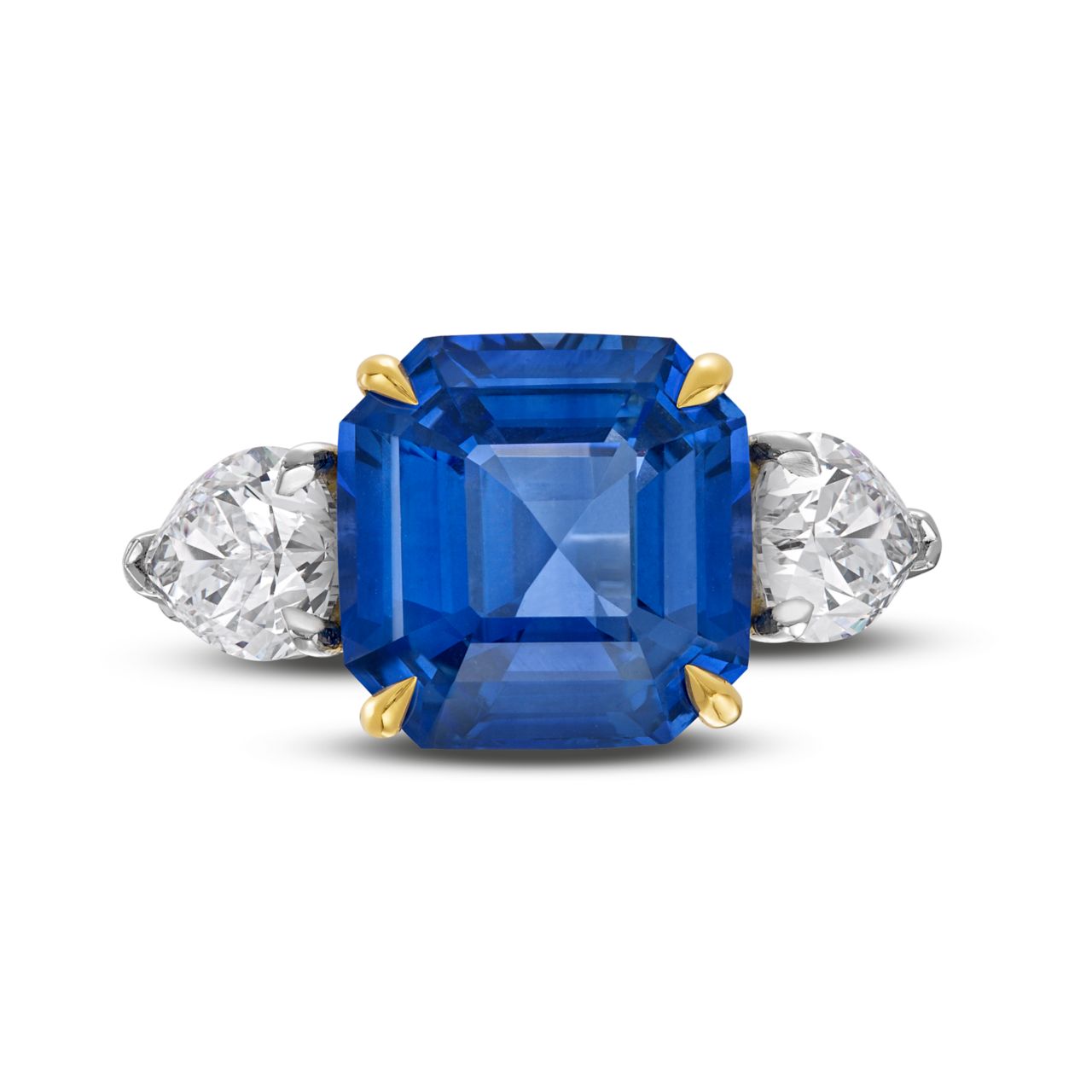 Introducing a true masterpiece of craftsmanship - our Asscher Sapphire and Diamond Three Stone Ring. At the center lies a stunning asscher cut sapphire radiating with a deep, velvety blue hue. Gracefully embracing the center stone are two GIA certified pear shape diamonds. Their scintillating brilliance complements the sapphire, creating a mesmerizing trio that embodies style and elegance.