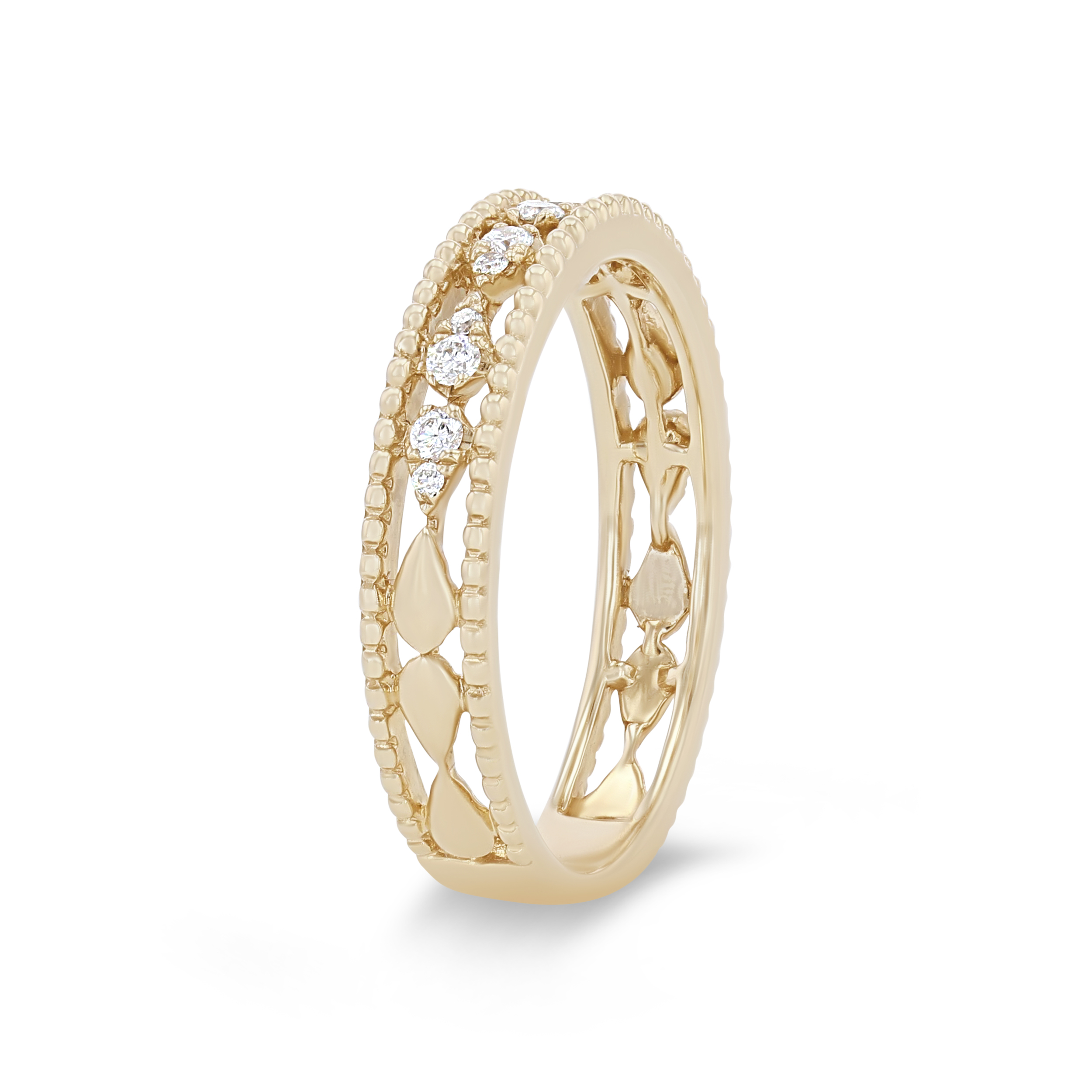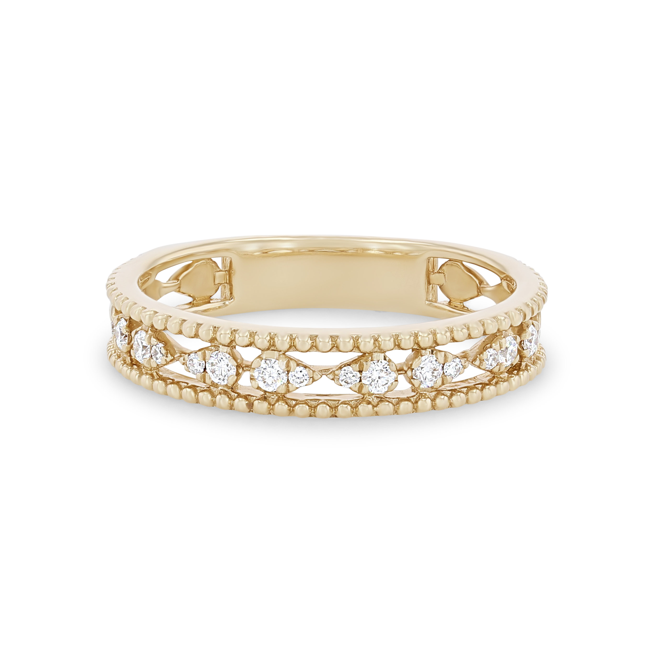 Product Description Intricate beading frames this wedding band accented by 0.14 carats of round brilliant cut diamonds set in pear shape illusions. Other Details Disable Reason: None Gemstone Type: Diamond Metal Color: Rose Gold Metal Color: White Gold Wedding Band Type: Vintage Metal Color: Yellow Gold Type: Ladies Wedding Band Total Setting Diamond Carat Weight: 0.14TW Metal Color: Platinum Diamond: Stackable