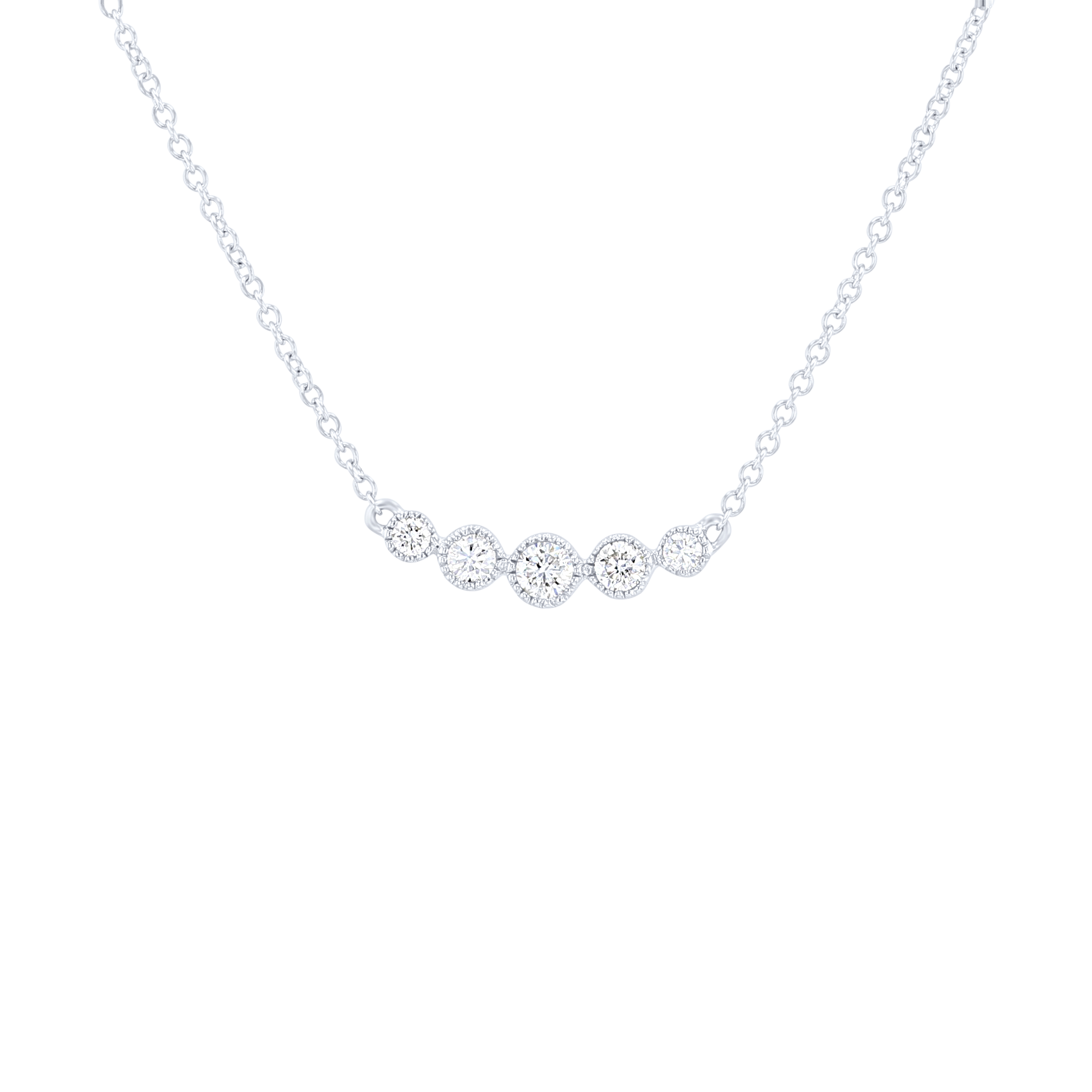 Product Description Perfect for layering or wearing solo, this delicate pendant features five round brilliant cut diamonds totaling 0.18 carats surrounded by bezel milgrain frames. Other Details Style: Vintage Length: 18 IN Total Setting Diamond Carat Weight: 0.18TW Average clarity range: SI Pendant Type: Bar Necklace Type: Fashion Metal Color: White Gold Disable Reason: None Gemstone Type: Diamond Average color range: HI Type: Necklace