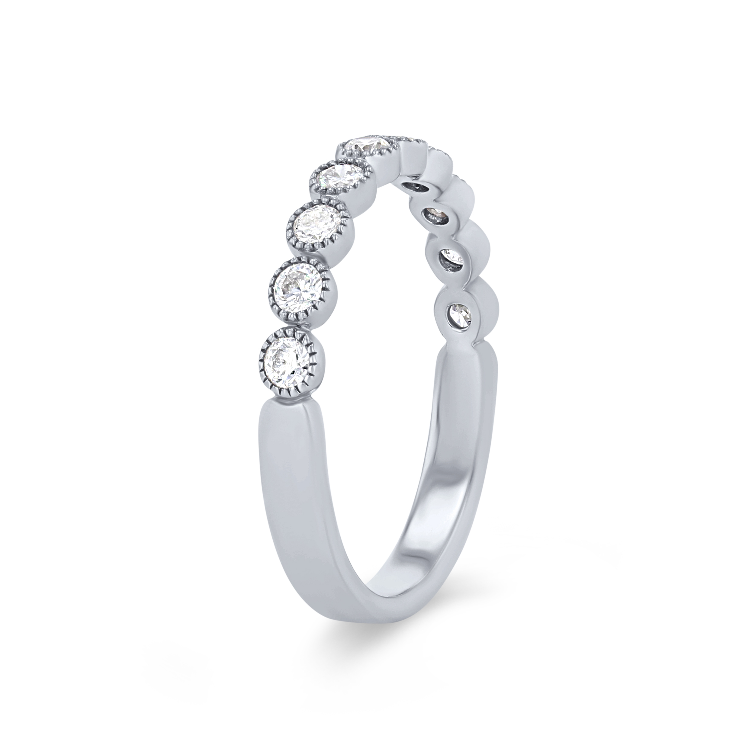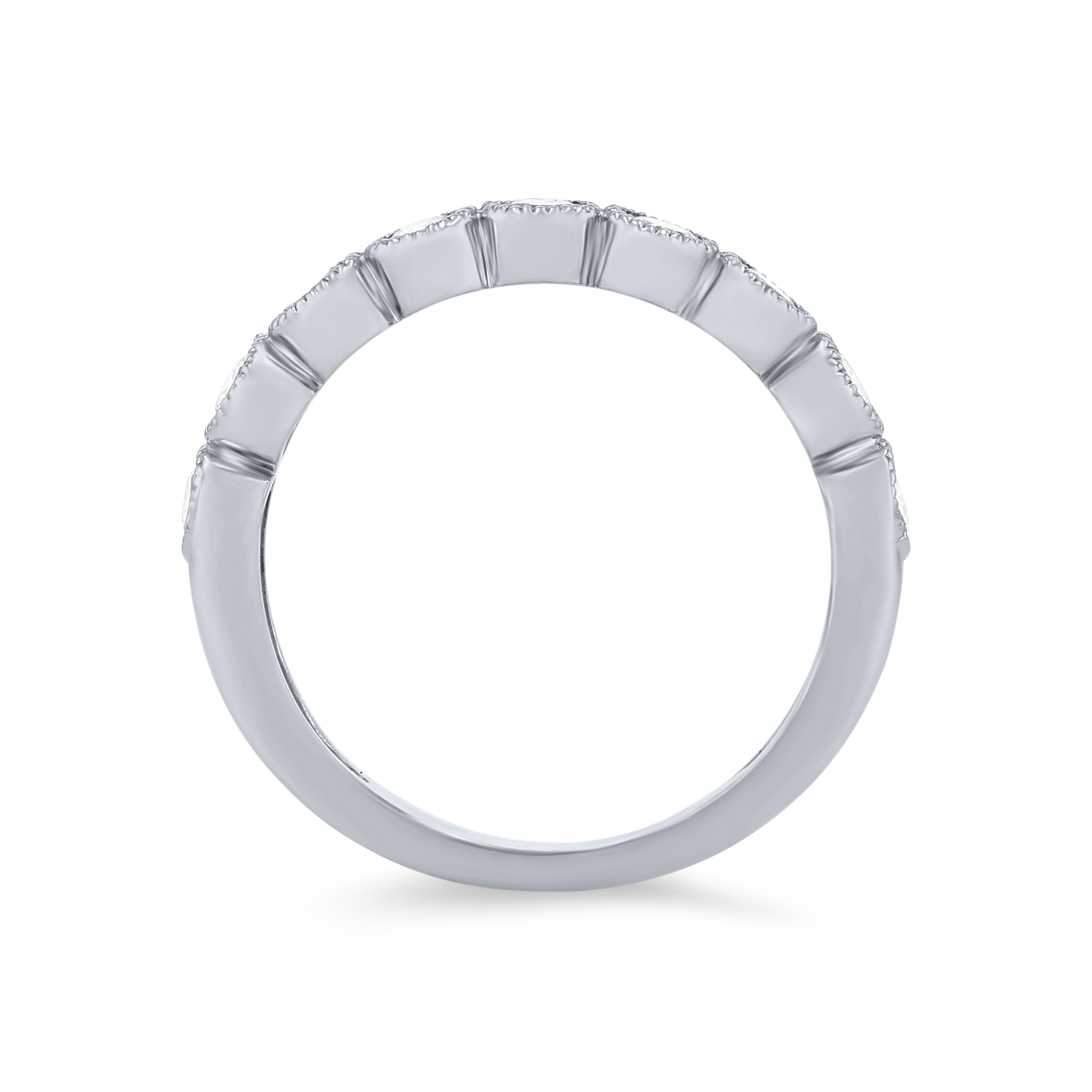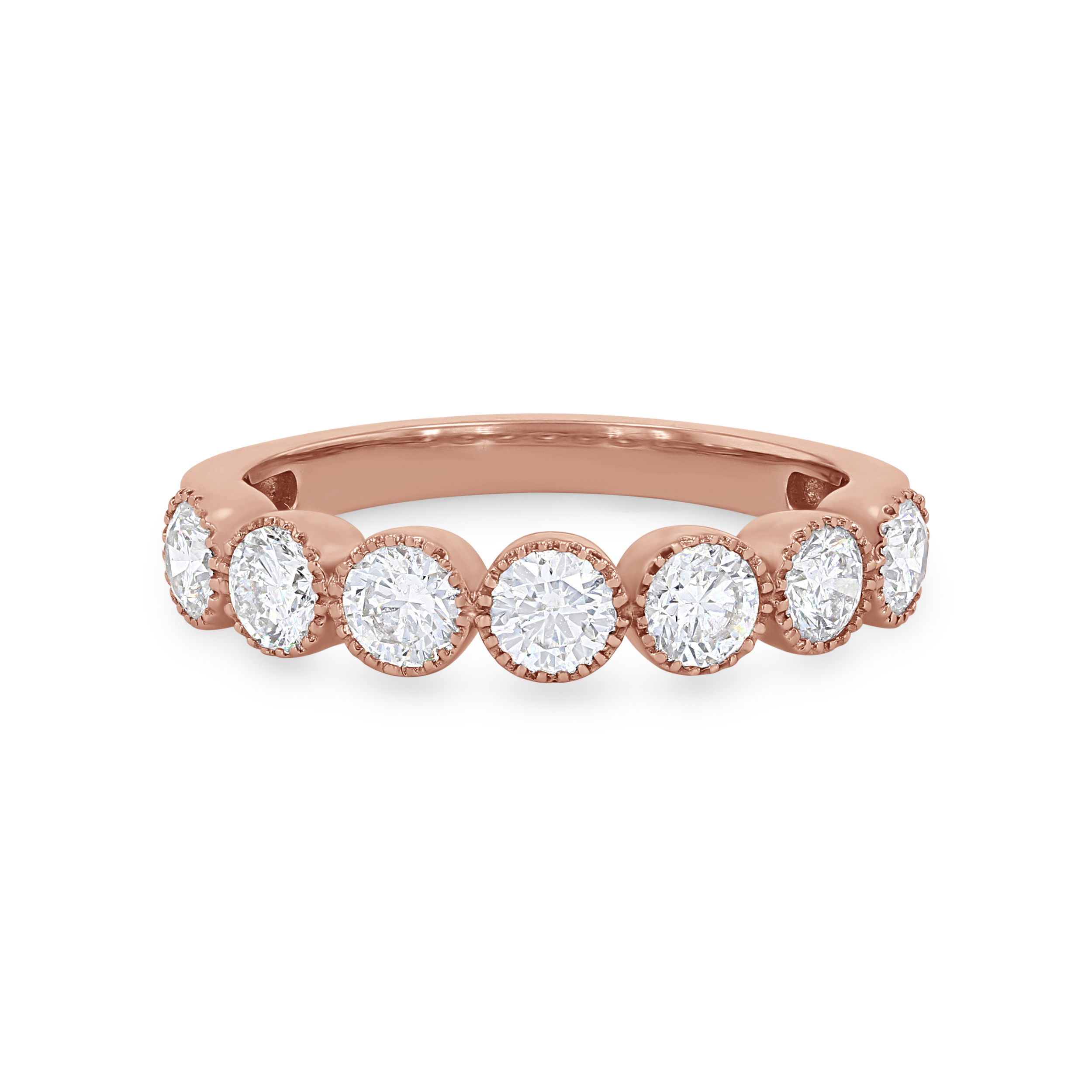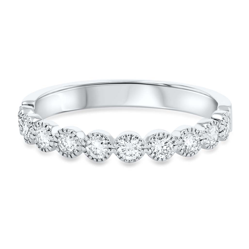 Product Description Sport a vintage look with this stunning wedding band accented with milgrain detail and round brilliant cut diamonds. Other Details Wedding Band Type: Vintage Type: Ladies Wedding Band Metal Color: Yellow Gold Metal Color: White Gold Diamond: Bezel Metal Color: Rose Gold Disable Reason: None Gemstone Type: Diamond Metal Color: Platinum