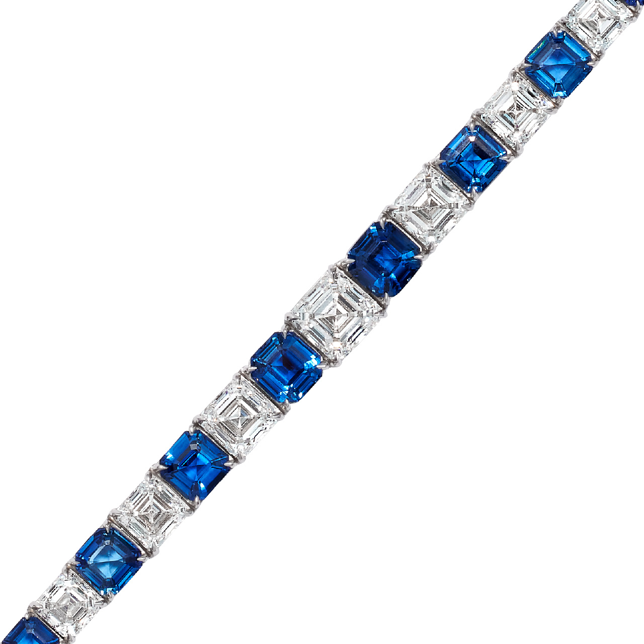 A tennis bracelet featuring 20.05 carats of blue sapphires and 21.48 carats of asscher cut diamonds, set in platinum.