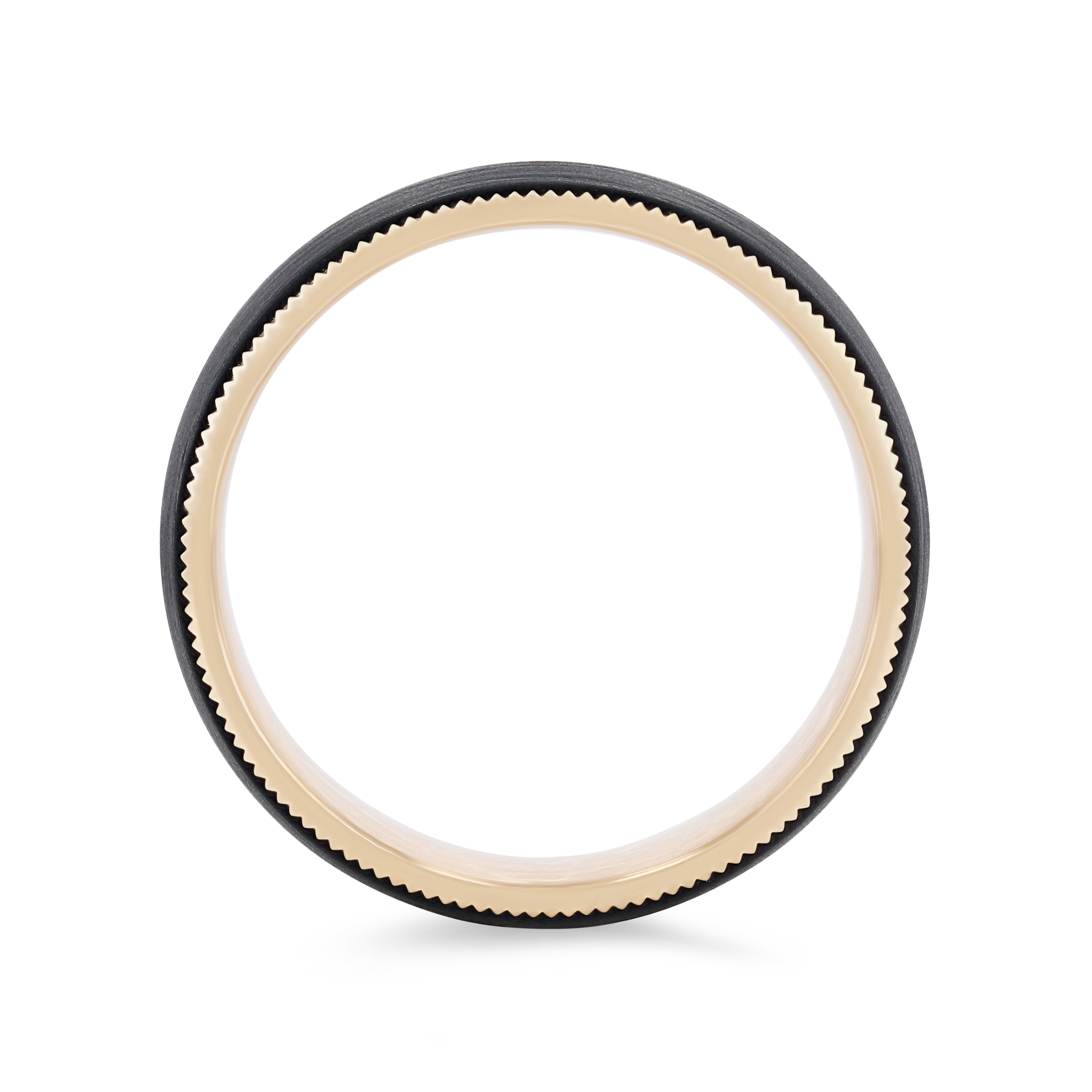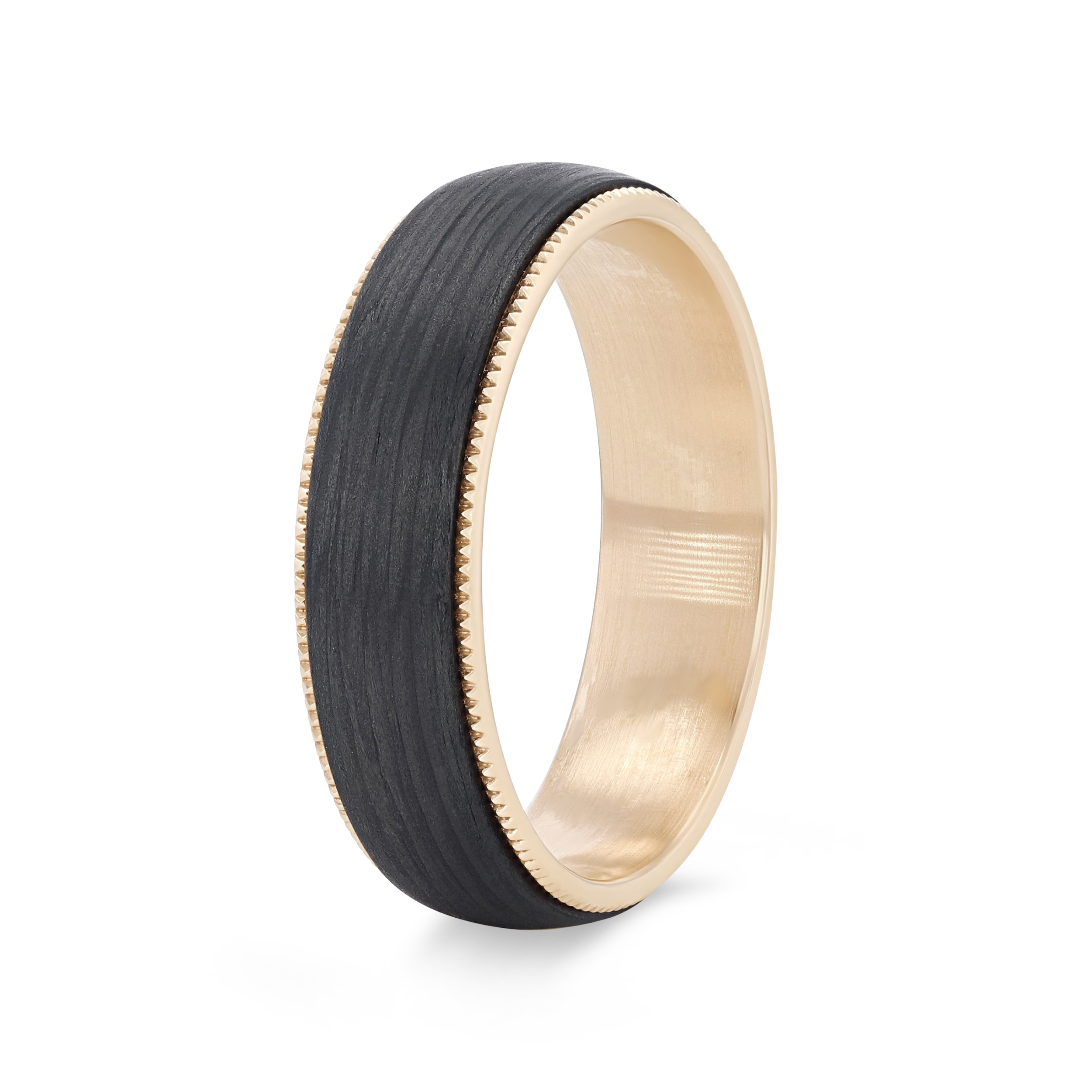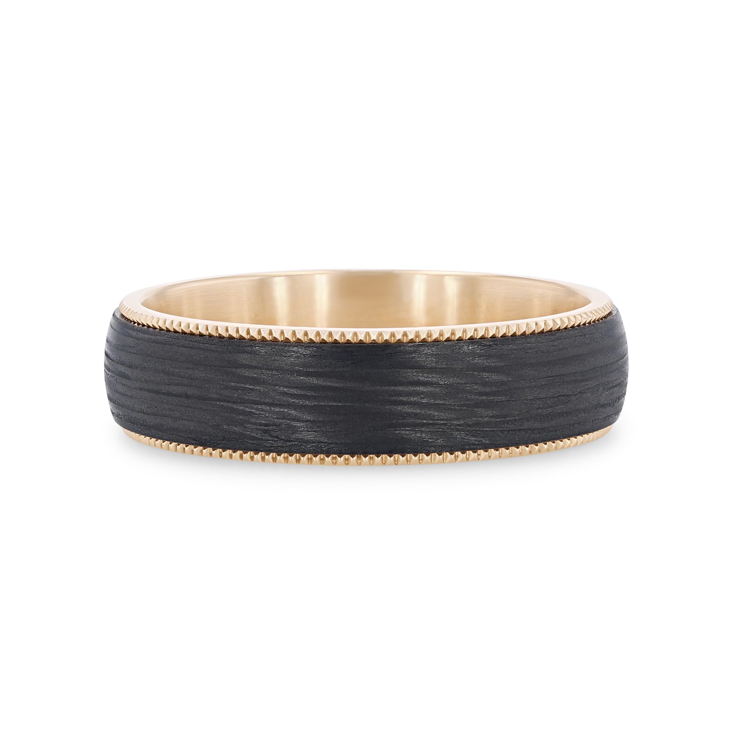 Product Description It's all in the details of this 6.5 millimeter wedding band. A carbon fiber center and 18 karat rose gold milgrain edges come together to create unique, modern design. Other Details Metal Color: White Gold Metal Color: Rose Gold Metal Color: Platinum Metal Color: Yellow Gold Type: Gents Wedding Band Men Wedding Band Type: Milgrain Disable Reason: None Gents Wedding Band Style: Contemporary