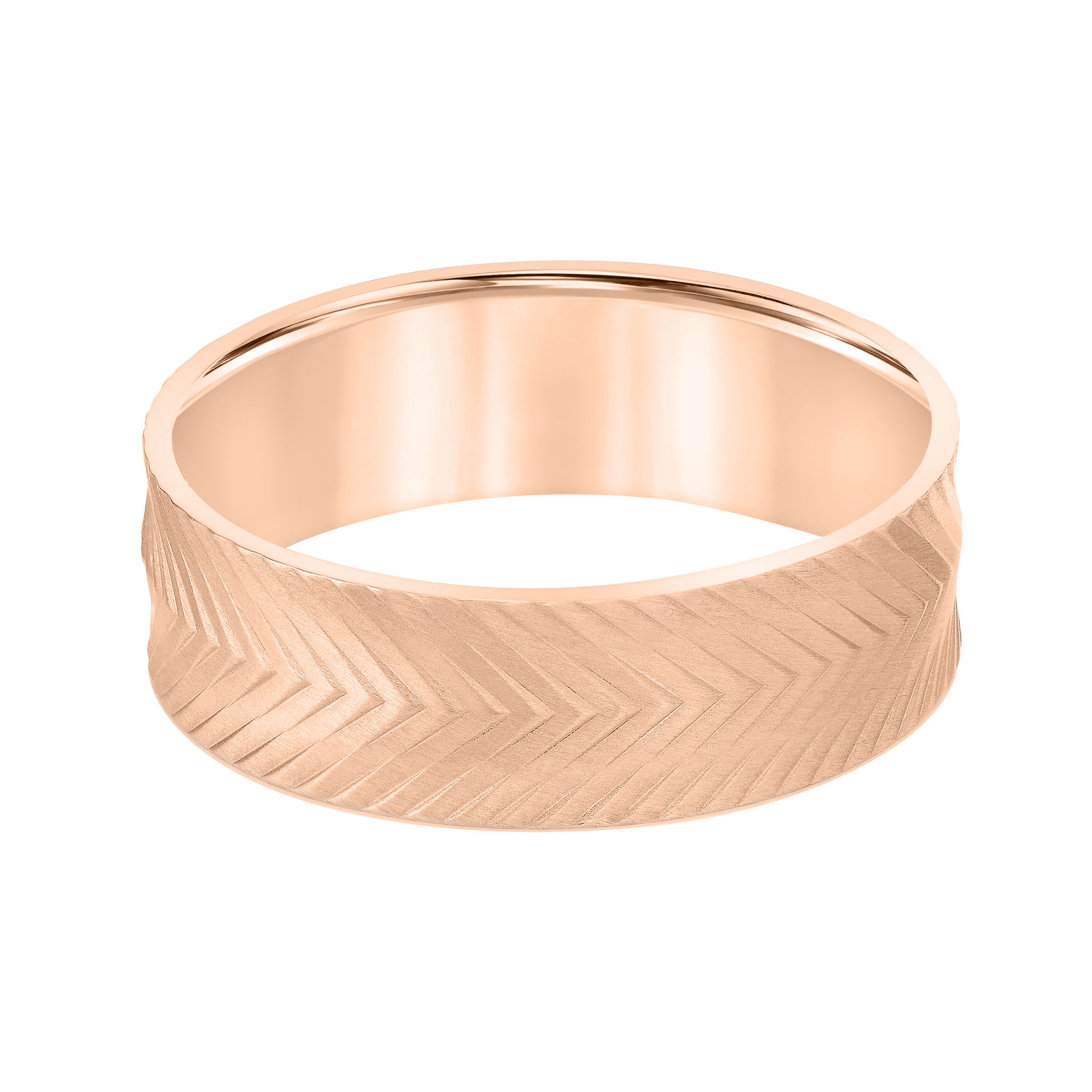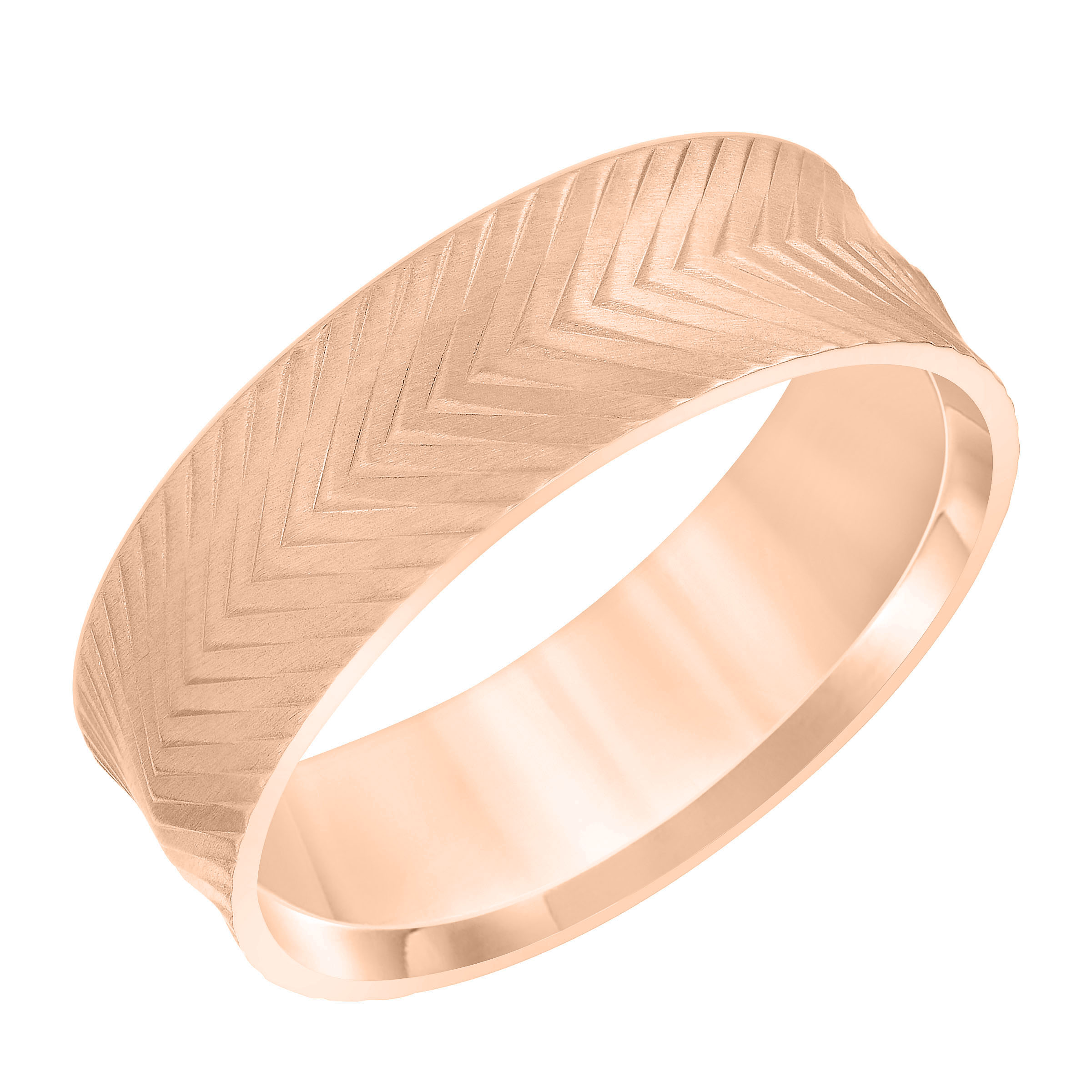 Product Description A modern and distinctive look, this wedding band features a chevron design measuring seven millimeters wide. Other Details Metal Color: Yellow Gold Men Wedding Band Type: Carved Metal Color: Rose Gold GENTS WED BD TYPE 2: Textured Type: Gents Wedding Band Gents Wedding Band Style: Contemporary Disable Reason: None