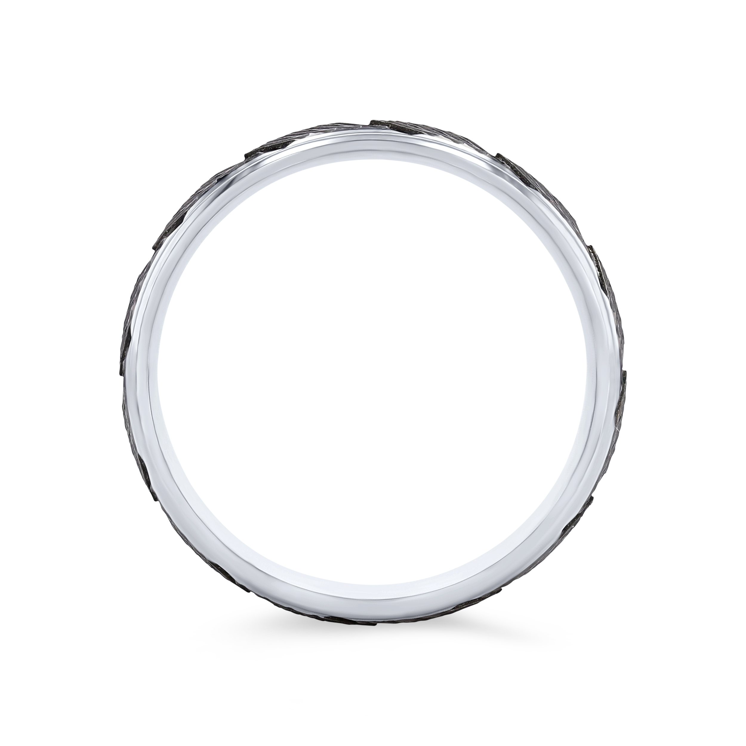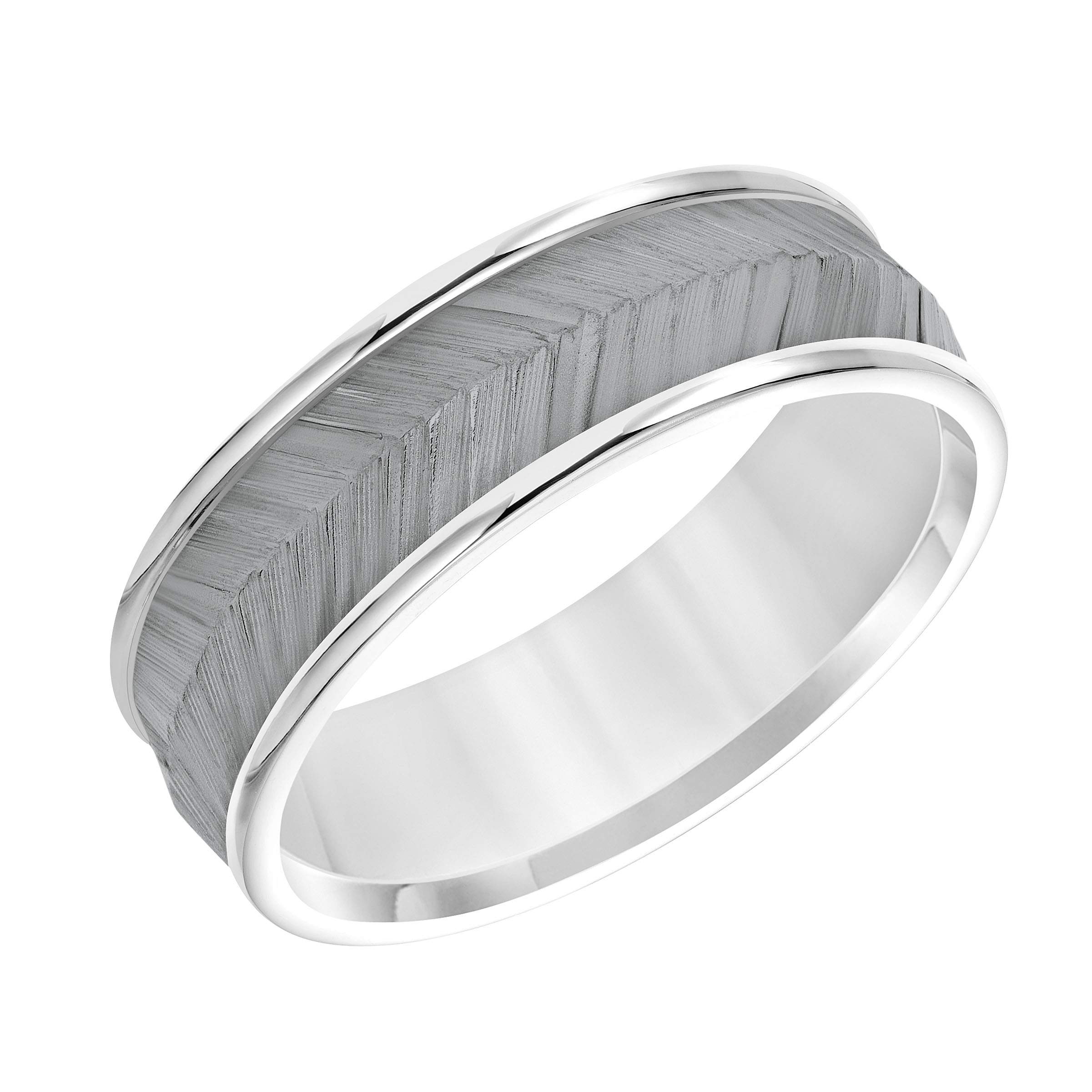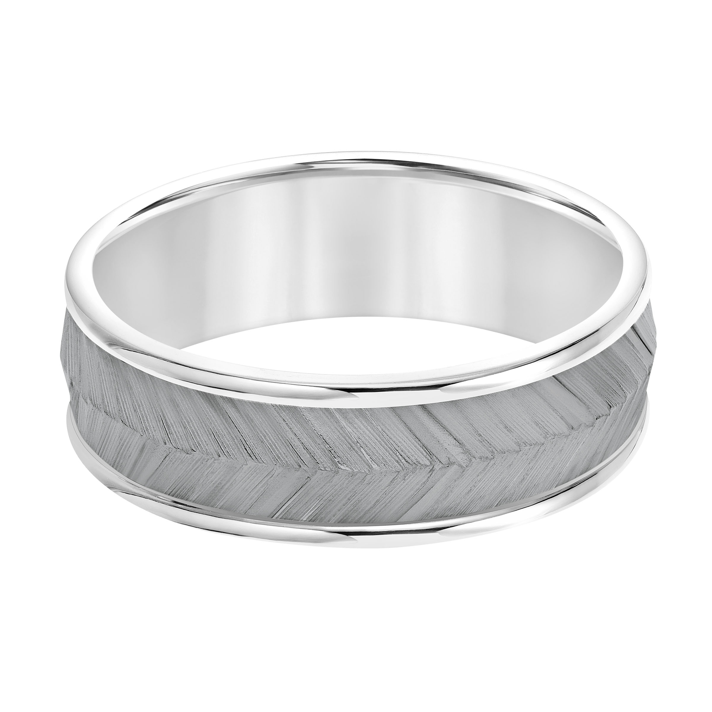 Product Description Perfect for the one wanting a unique look, this wedding band features a black rhodium chevron design measuring seven millimeters wide. Other Details Metal Color: White Gold Men Wedding Band Type: Carved Metal Color: Yellow Gold Disable Reason: None Type: Gents Wedding Band Gents Wedding Band Style: Contemporary GENTS WED BD TYPE 2: Textured