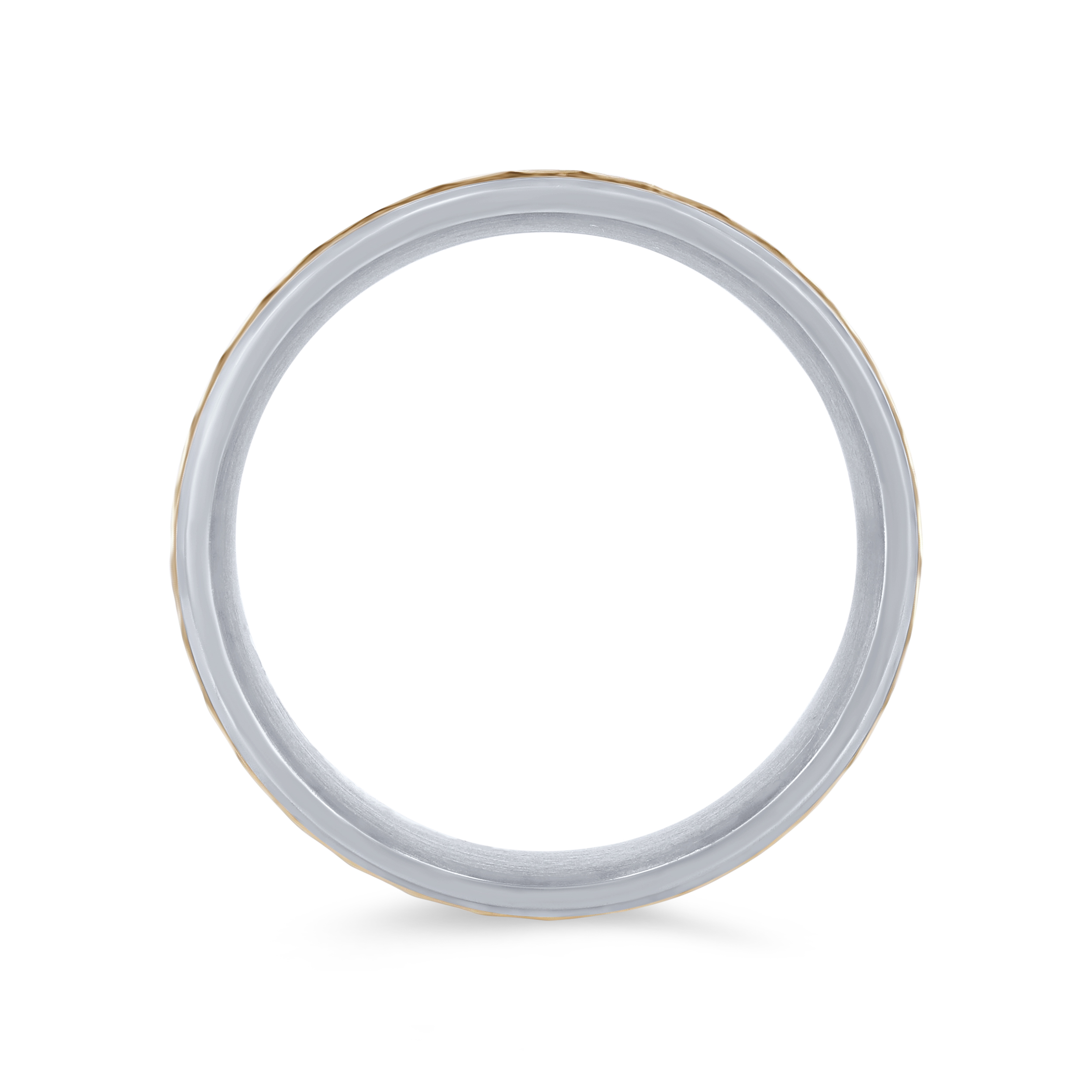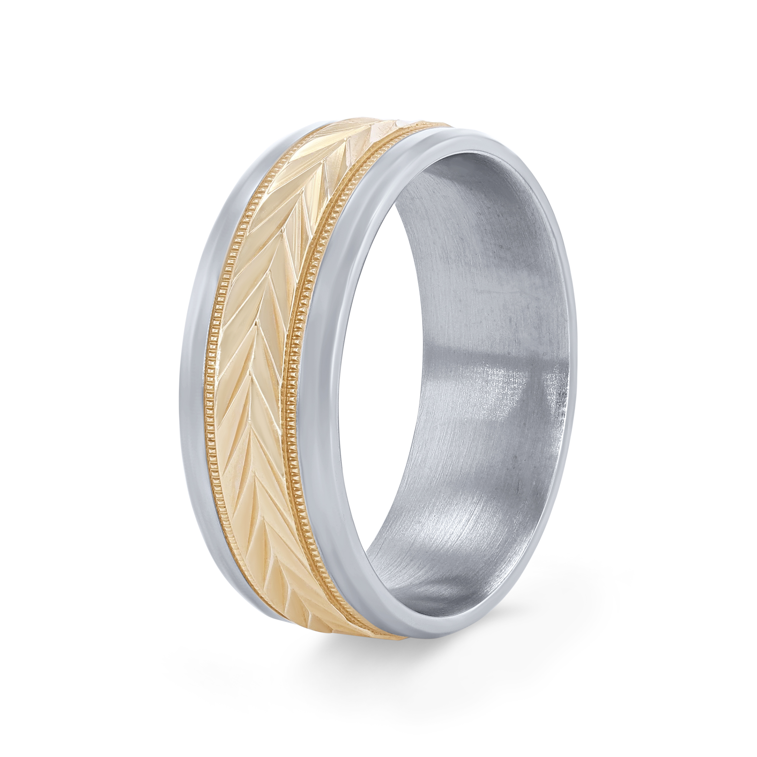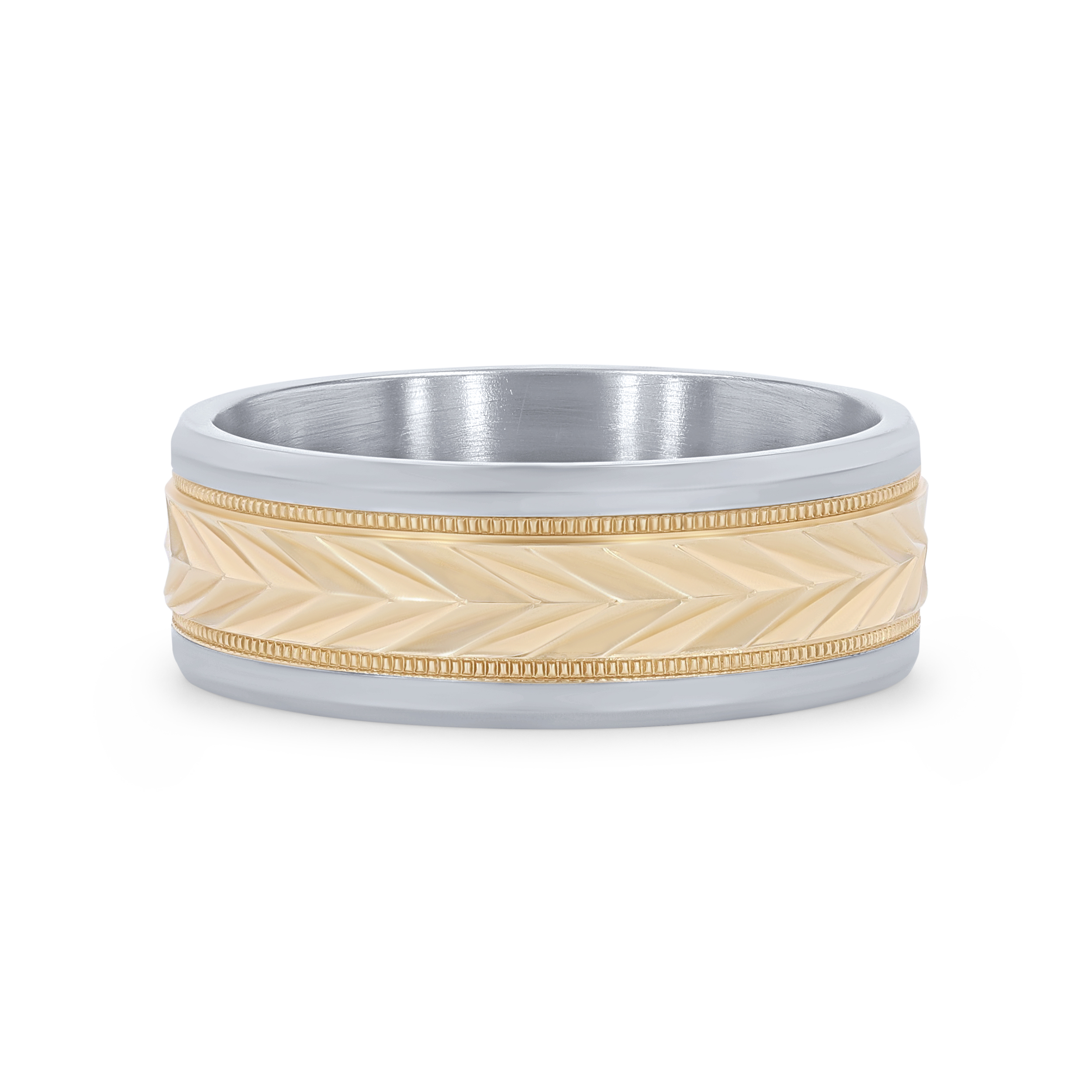 Product Description Make a statement with this eight millimeter two-tone wedding band, featuring an intricate chevron design and milgrain beading. Other Details Men Wedding Band Type: Carved Metal Color: Yellow Gold Metal Color: Platinum Metal Color: Two Tone Type: Gents Wedding Band Gents Wedding Band Style: Contemporary Metal Color: White Gold Metal Color: Rose Gold GENTS WED BD TYPE 2: Milgrain Millimeter Width: 8 mm Disable Reason: None