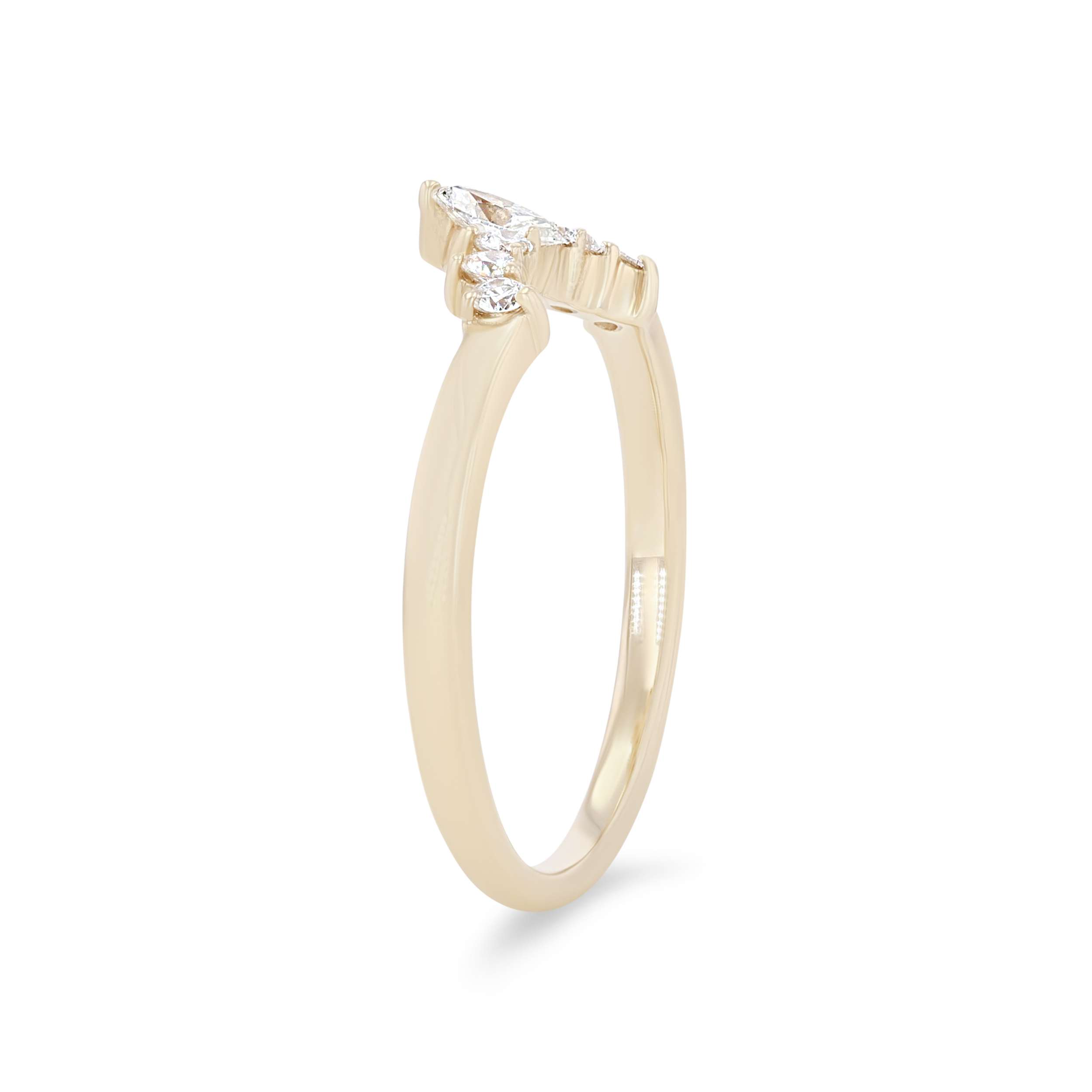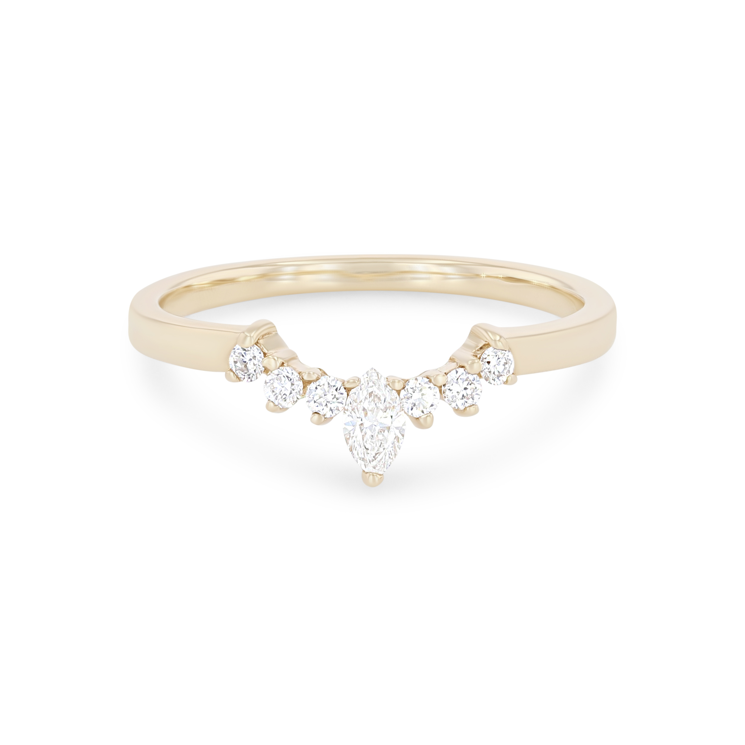 Product Description A beautiful and dainty design, this curved wedding band features a single marquise diamond accented with round brilliant cut diamonds totaling 0.20 carats. Other Details Metal Color: Yellow Gold Gemstone Type: Diamond Metal Color: Rose Gold Metal Color: White Gold Style: Vintage Wedding Band Type: Contoured Metal Color: Platinum Disable Reason: None Total Setting Diamond Carat Weight: 0.2TW Type: Ladies Wedding Band Diamond: Fancy Shapes