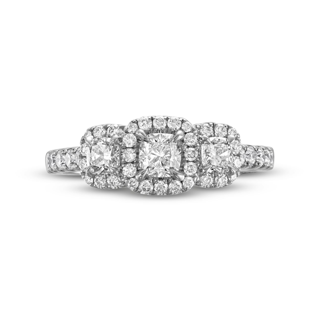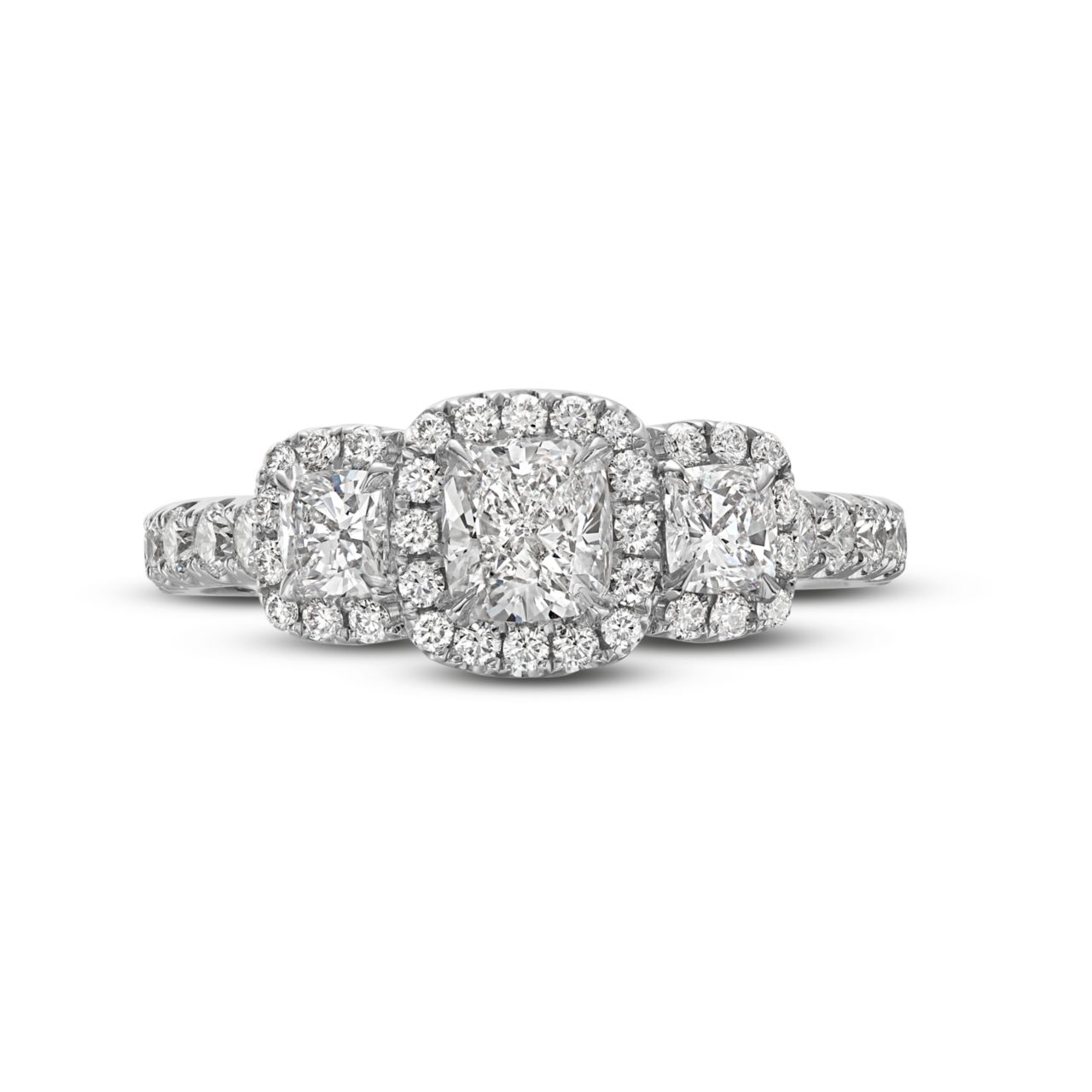 Our Cushion Diamond Three Stone Halo Engagement Ring is a seamless fusion of classic elegance and contemporary allure. The cushion cut diamonds evoke a sense of vintage charm, while the halo setting adds a touch of modern sophistication.