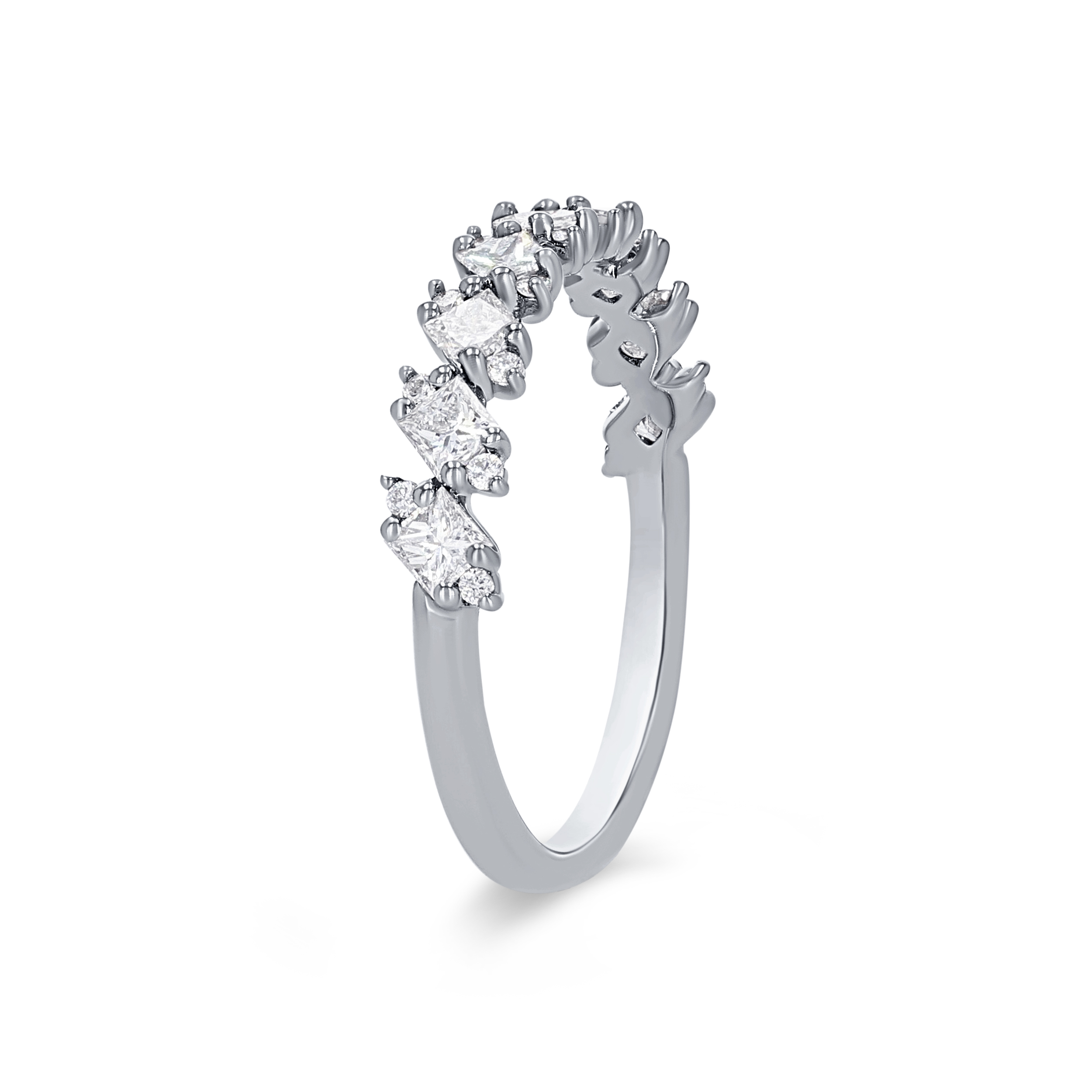 Product Description Mixed with princess cut and round brilliant cut diamonds totaling 0.63 carats, this unique diagonal wedding band is the perfect way to diversify any set. Other Details Wedding Band Type: Fancy Shapes Total Setting Diamond Carat Weight: 0.63TW Disable Reason: None Style: Contemporary Diamond: Stackable Metal Color: Rose Gold Type: Ladies Wedding Band Metal Color: White Gold Metal Color: Platinum Gemstone Type: Diamond Metal Color: Yellow Gold
