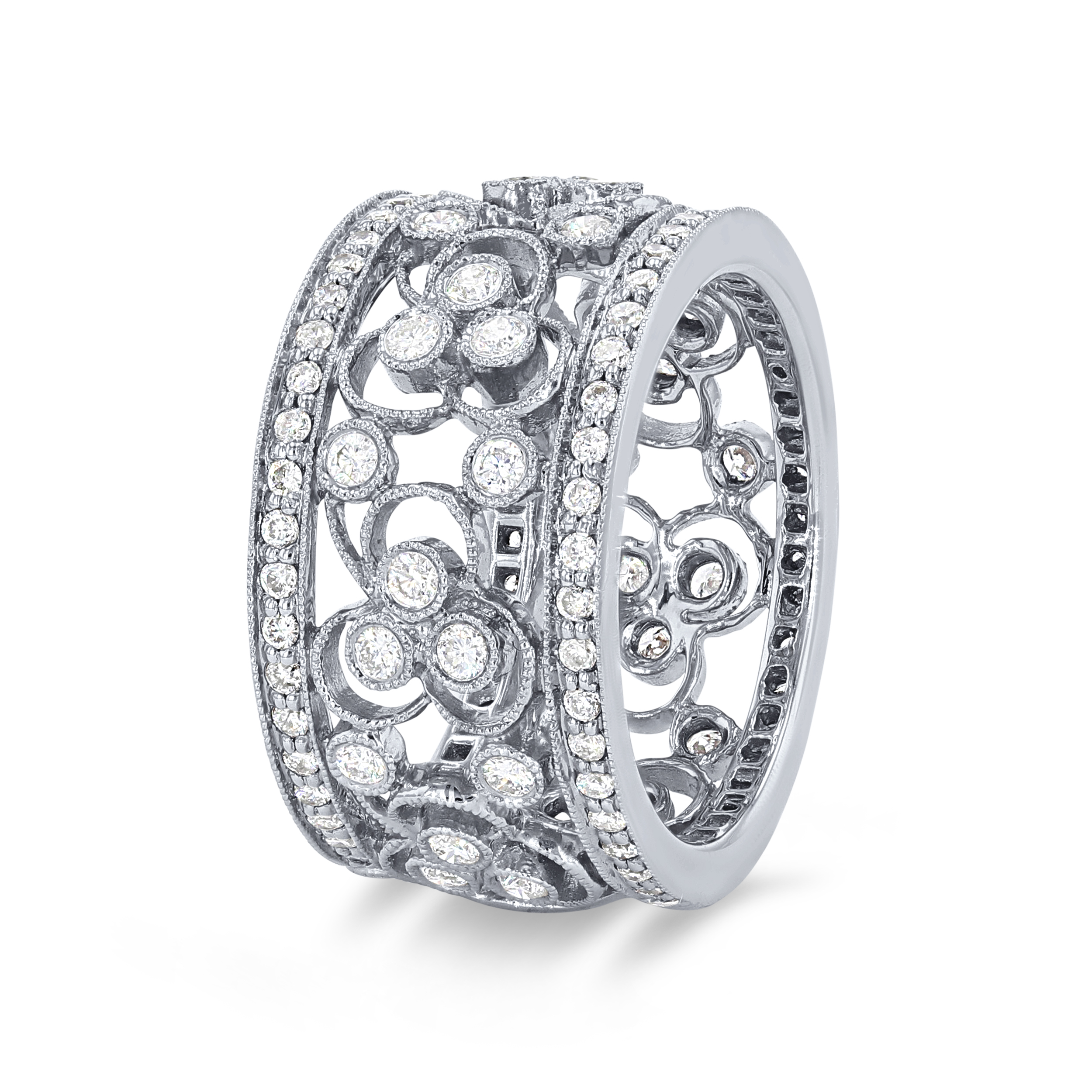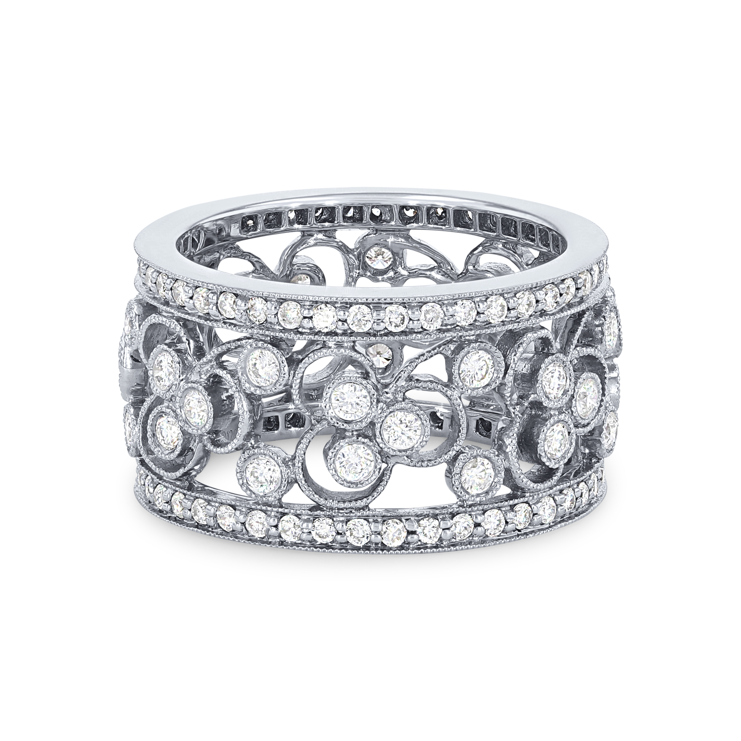 Crafted with beautiful vintage inspired milgrain detail, this ring features a wide design accented with 1.20 carats of round brilliant cut diamonds. Some finger sizes will increase delivery times. Please chat with a virtual sales associate.