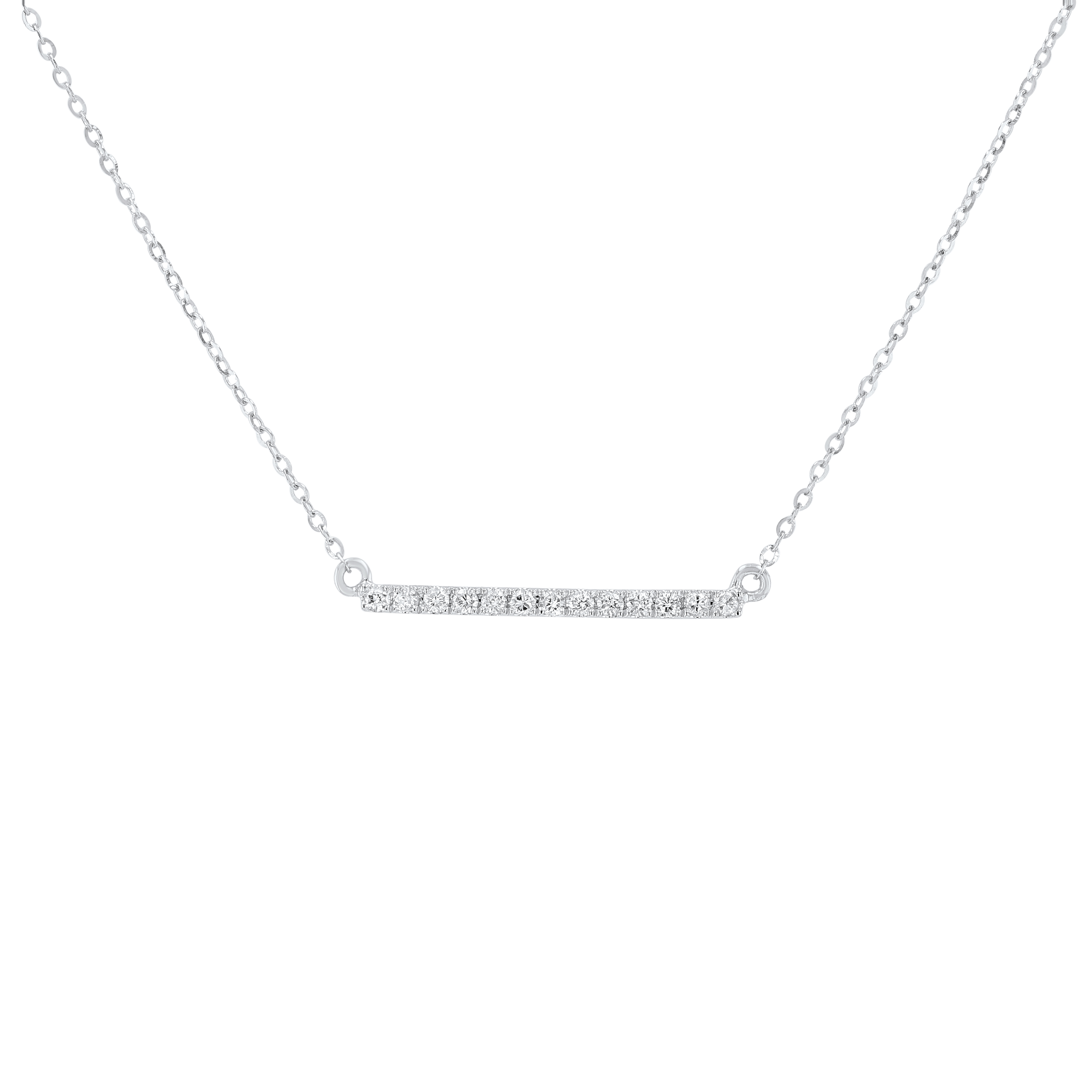 Simple, yet stunning this straight bar pendant highlights 0.13 carats of round brilliant cut diamonds.