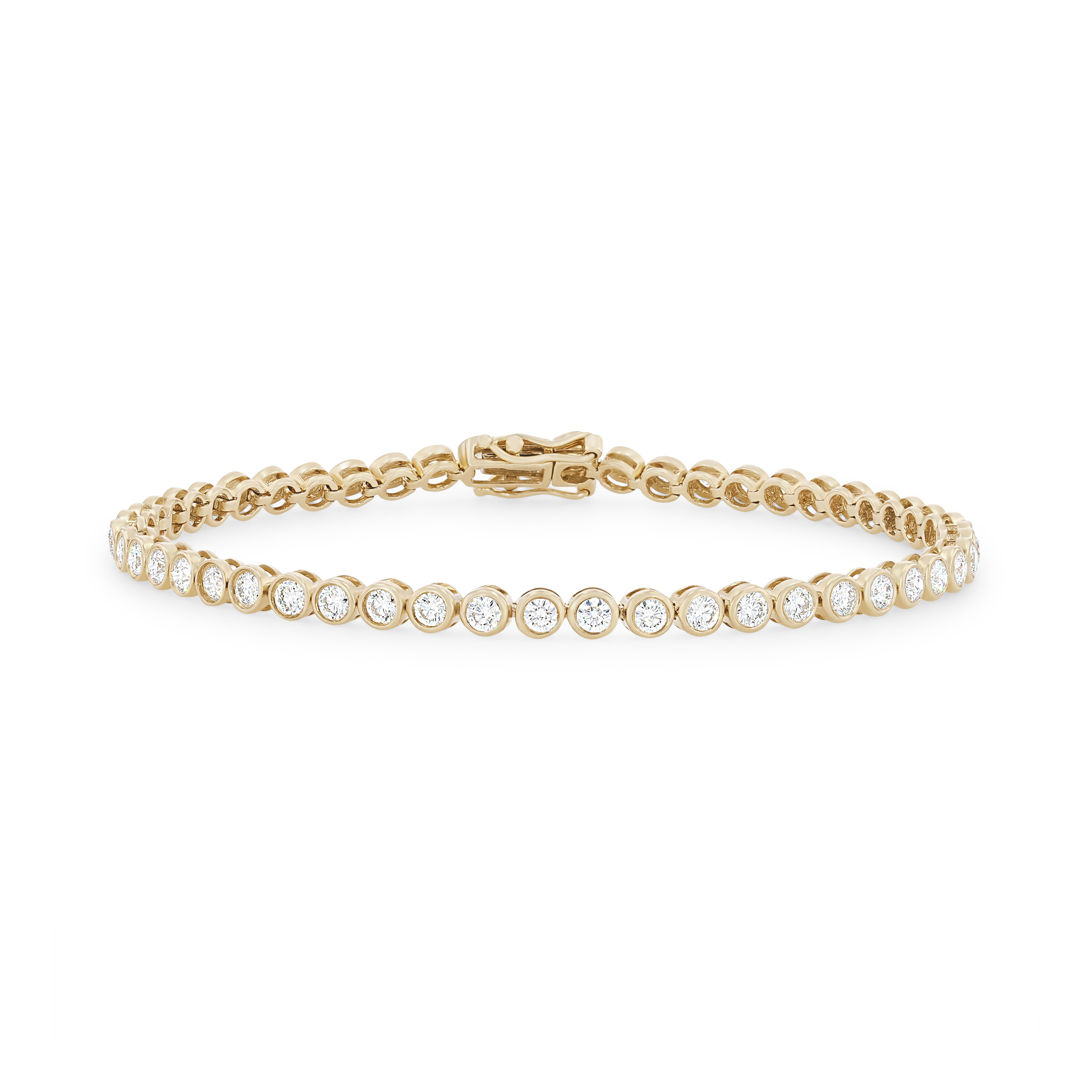 Product Description Modern and sleek, this tennis bracelet features a bezel design around each round brilliant cut diamond, all totaling 2.91 carats. Other Details Metal Color: Yellow Gold Length: 7 IN Bracelet Type: Tennis Bracelets Style: Contemporary Total Setting Diamond Carat Weight: 2.91TW Gemstone Type: Diamond Tennis Bracelet Type: Distinctive Tennis Bracelet Disable Reason: None Type: Bracelet