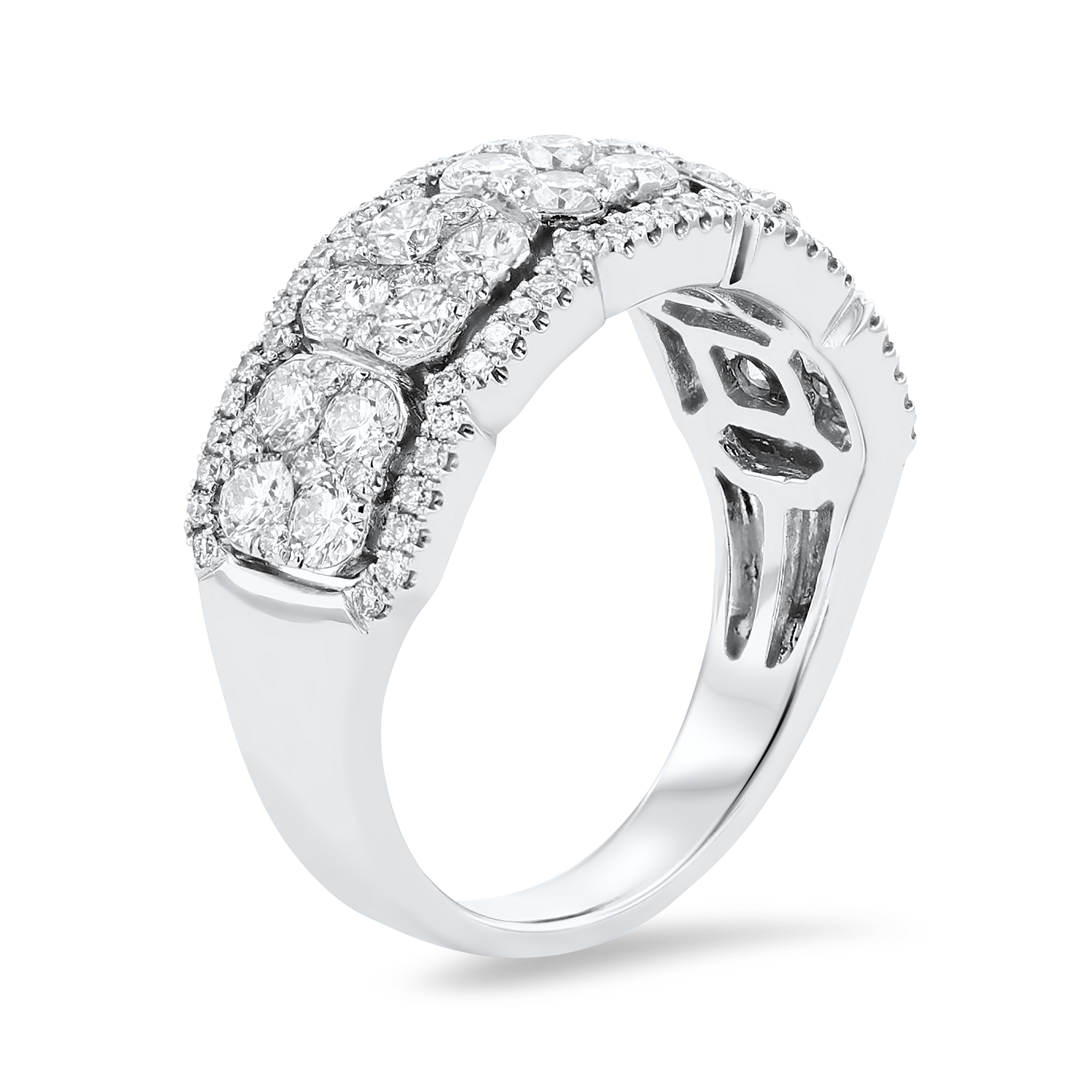 Product Description Set in clusters and along the edges of this beautiful ring are 1.53 total carats of round brilliant cut diamonds, creating maximum sparkle. Other Details Total Setting Diamond Carat Weight: 1.53TW Gemstone Type: Diamond Metal Color: White Gold Type: Ring Metal Color: Yellow Gold Disable Reason: None Ring Type: Fashion Metal Color: Platinum Metal Color: Rose Gold Style: Contemporary