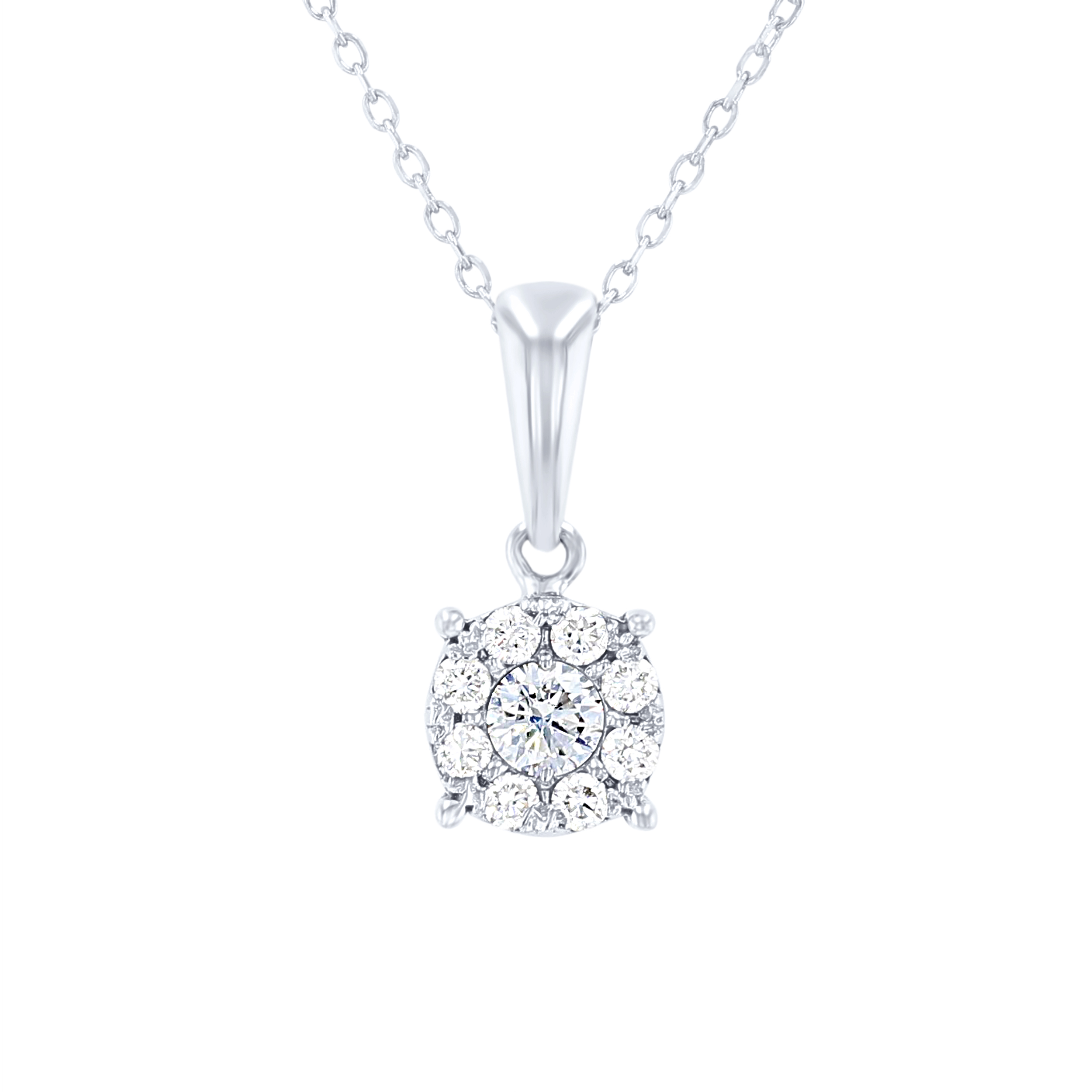 Product Description Perfect for every day wear, this pendant features a cluster of round brilliant cut diamonds totaling 0.25 carats. Other Details Necklace Type: Fashion Total Setting Diamond Carat Weight: 0.25TW Metal Color: White Gold Gemstone Type: Diamond Disable Reason: None Style: Contemporary Type: Necklace Length: 18 IN