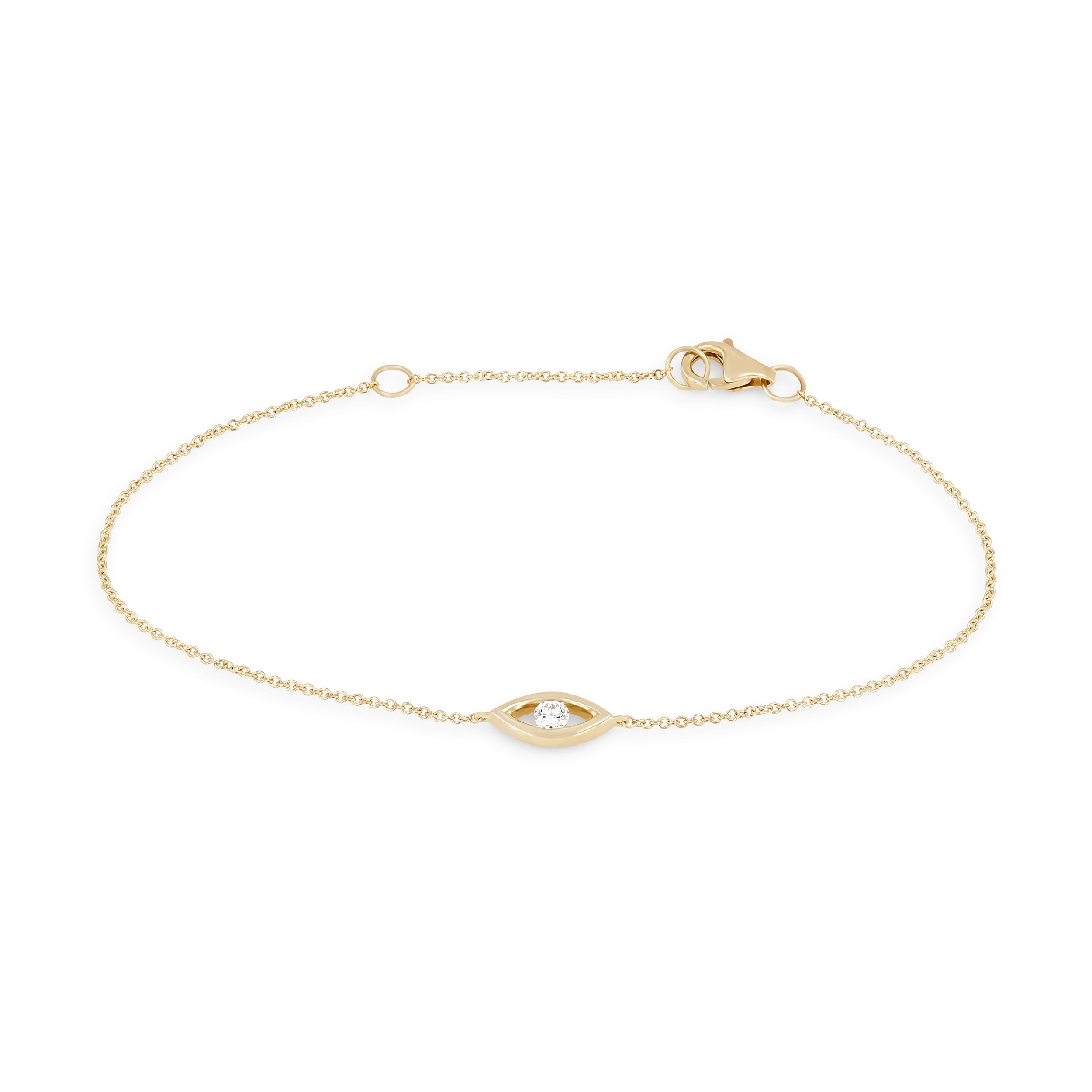 Product Description Crafted in an evil eye design, this delicate bracelet features a single round brilliant cut diamond weighing 0.08 carats. Other Details Metal Color: Yellow Gold Tennis Bracelet Type: Distinctive Tennis Bracelet Style: Contemporary Gemstone Type: Diamond Type: Bracelet Disable Reason: None Bracelet Type: Tennis Bracelets Total Setting Diamond Carat Weight: 0.08TW