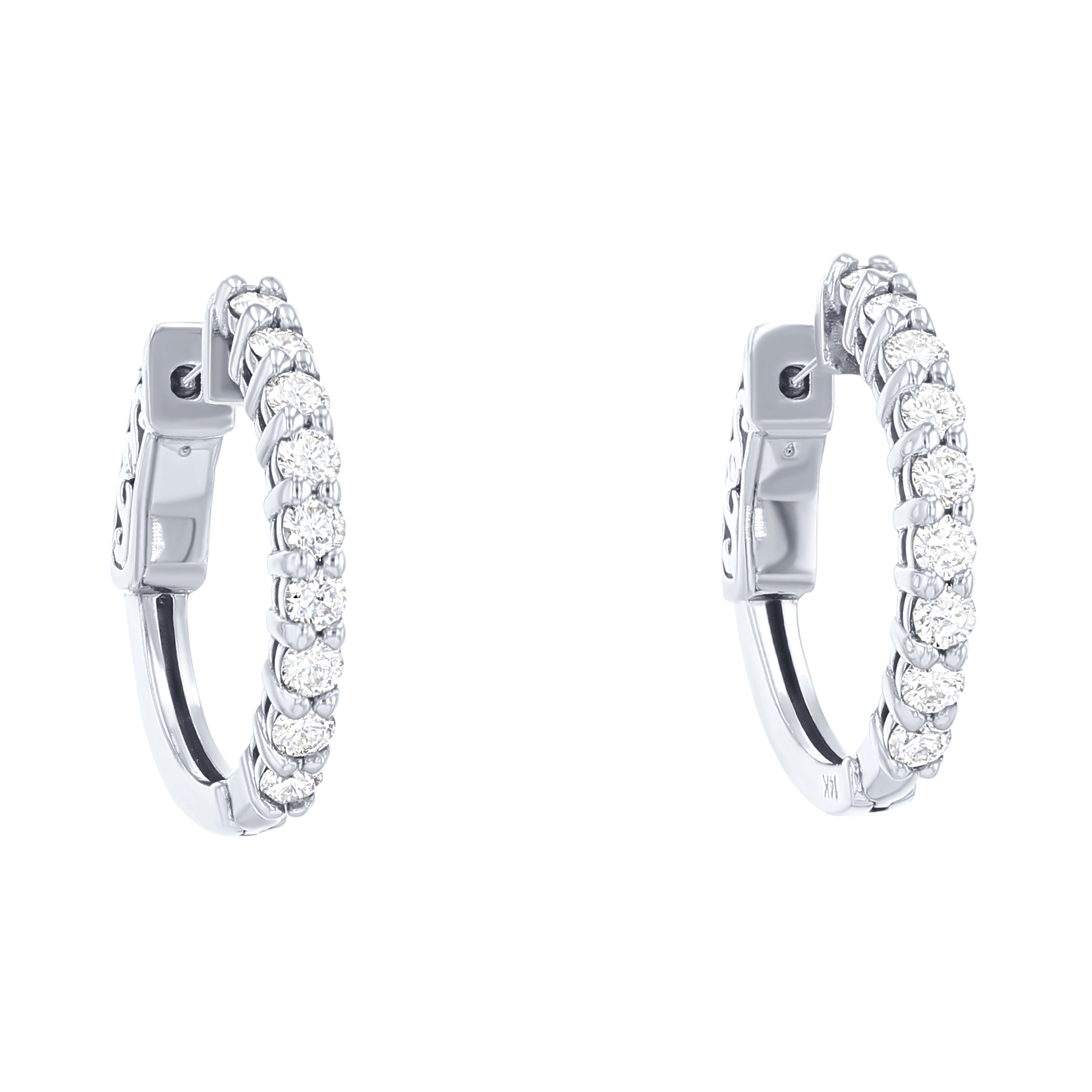 Product Description A classic staple in any collection, these hoop earrings feature 18 round brilliant cut diamonds totaling 0.77 carats. They measure approximately 0.75 inches. Other Details Total Setting Diamond Carat Weight: 0.77TW Diameter: Approx. 0.75 Inches Earring Type: Hoops & Huggies Metal Color: Yellow Gold Type: Classic Hoop Metal Color: White Gold Gemstone Type: Diamond Disable Reason: None