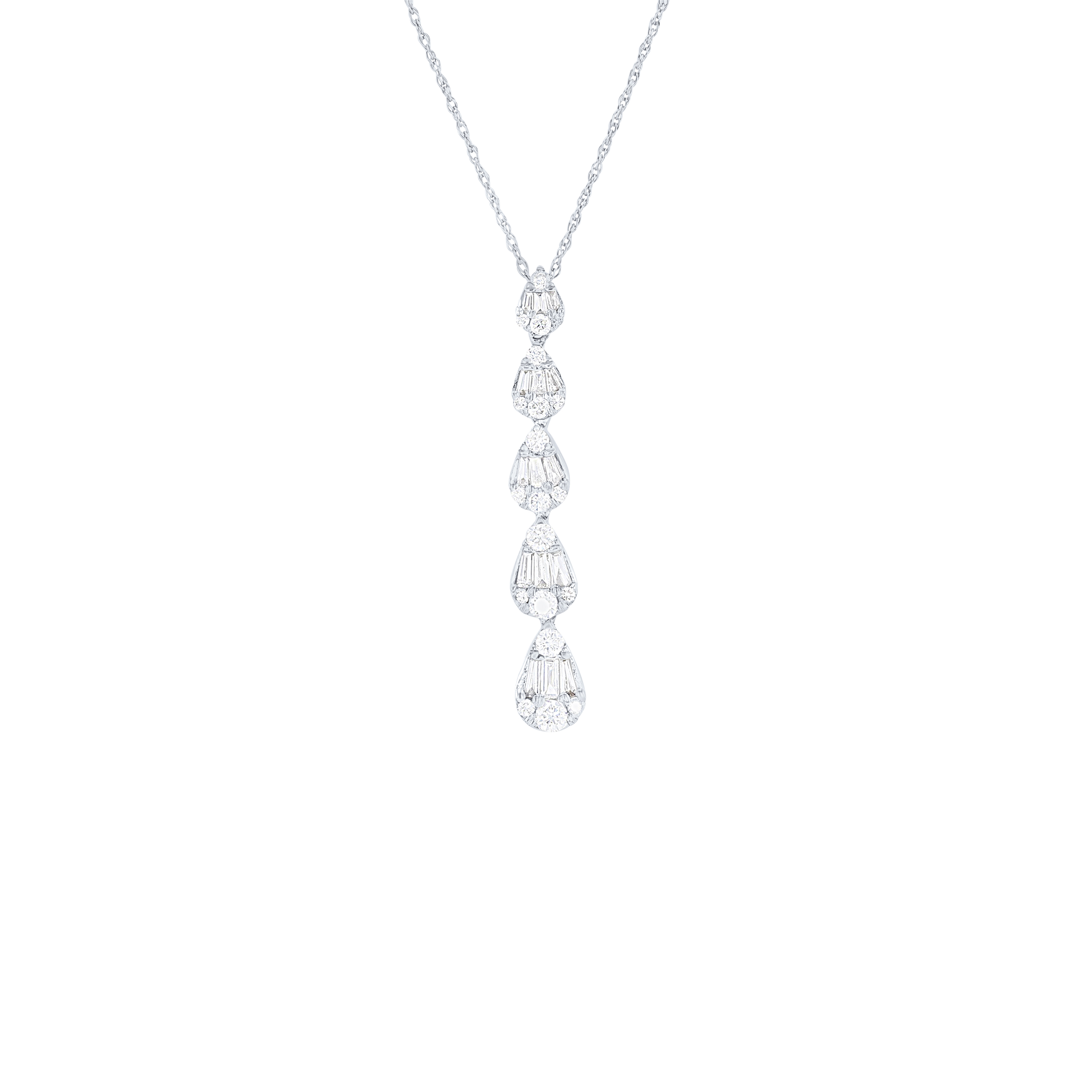 Product Description Crafted in a beautiful mosaic design, this drop pendant features baguette and round brilliant cut diamonds totaling 0.60 carats. Other Details Type: Necklace Necklace Type: Fashion Disable Reason: None Pendant Type: Mosaic Style: Contemporary Total Setting Diamond Carat Weight: 0.6TW Metal Color: White Gold Gemstone Type: Diamond