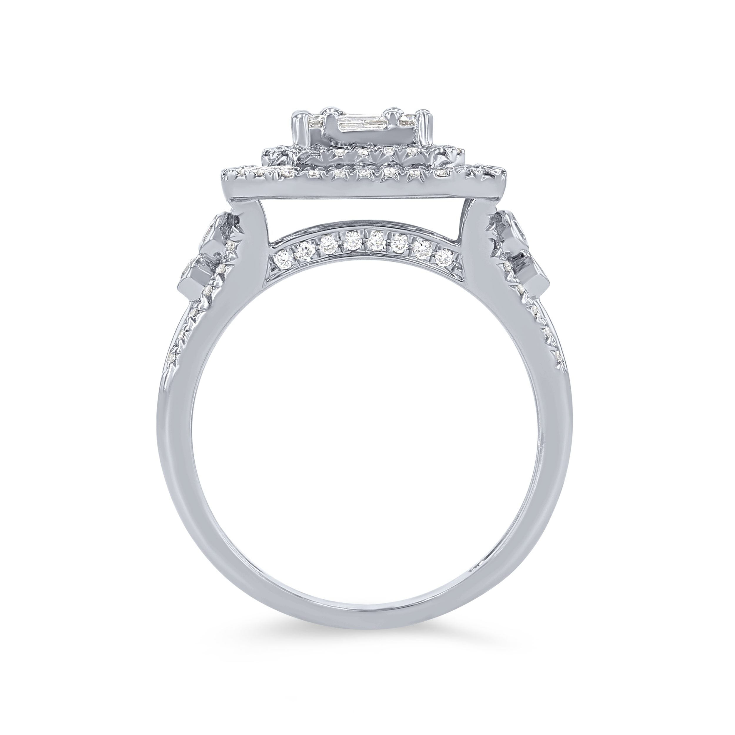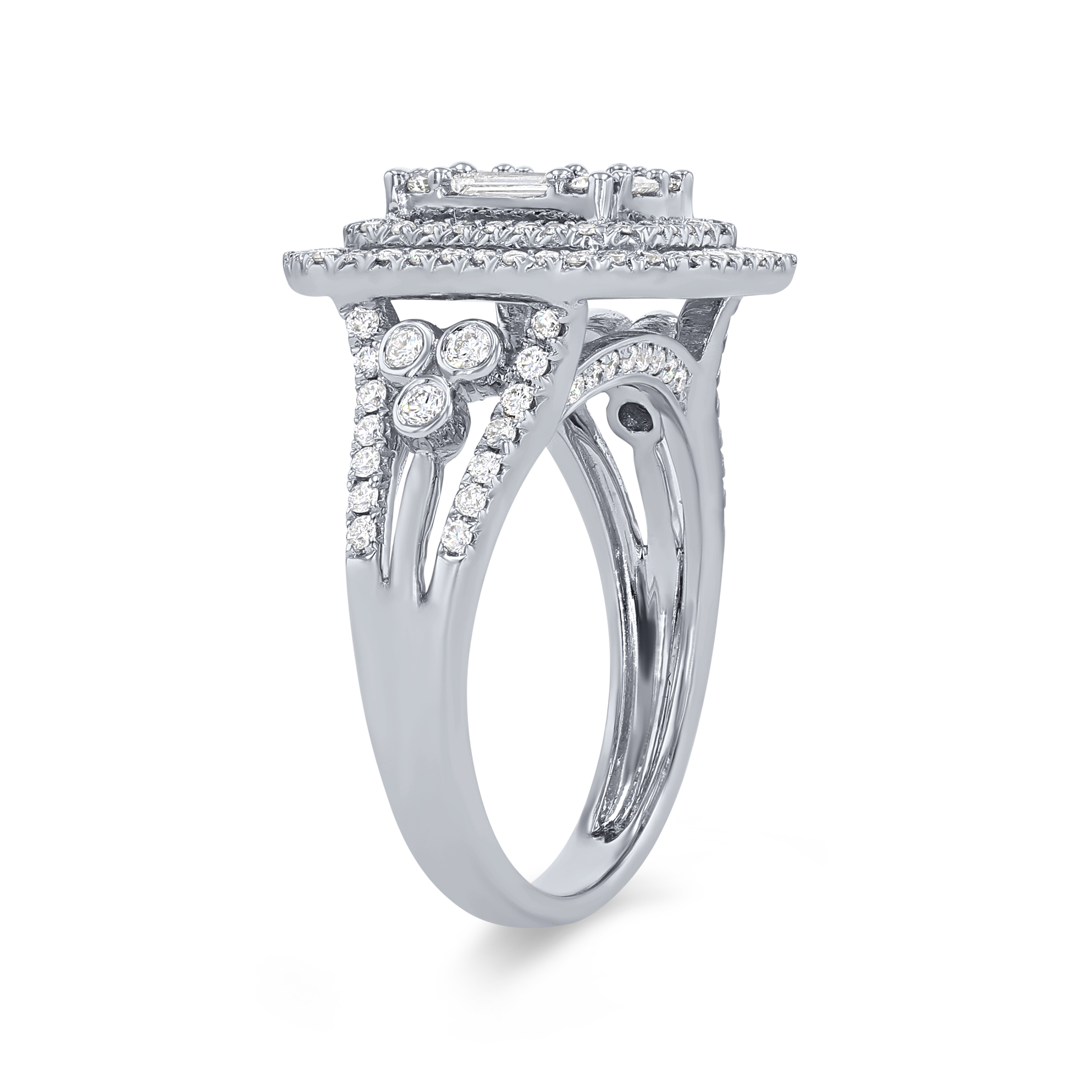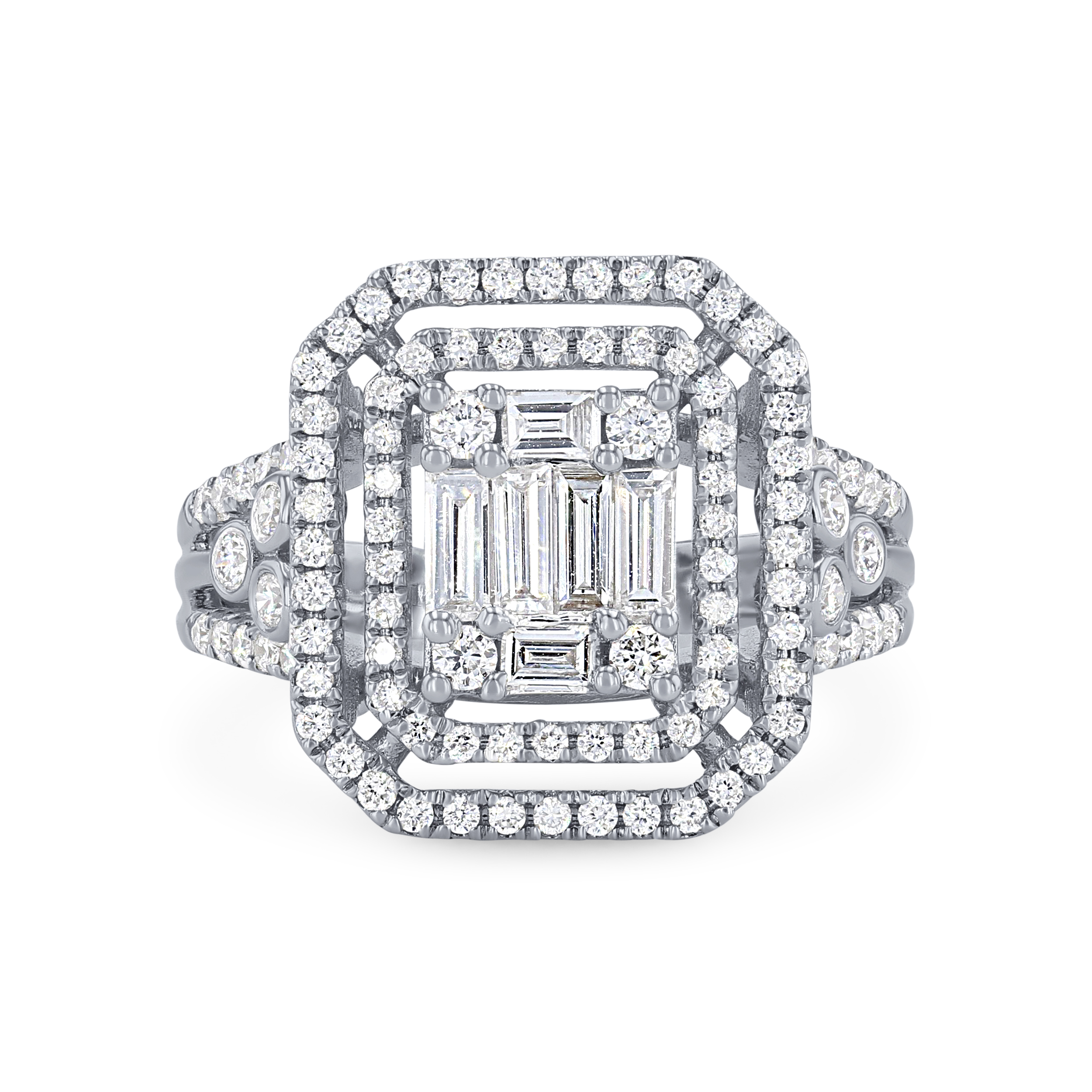 Product Description Elegant and glamorous, this mosaic design double halo ring features 0.75 carats of round brilliant cut diamonds and 0.40 carats of baguette cut diamonds. Other Details Metal Color: Yellow Gold Style: Contemporary Ring Type: Cocktail Total Setting Diamond Carat Weight: 1.15TW Metal Color: White Gold Disable Reason: None Gemstone Type: Diamond Type: Ring Metal Color: Rose Gold Metal Color: Platinum