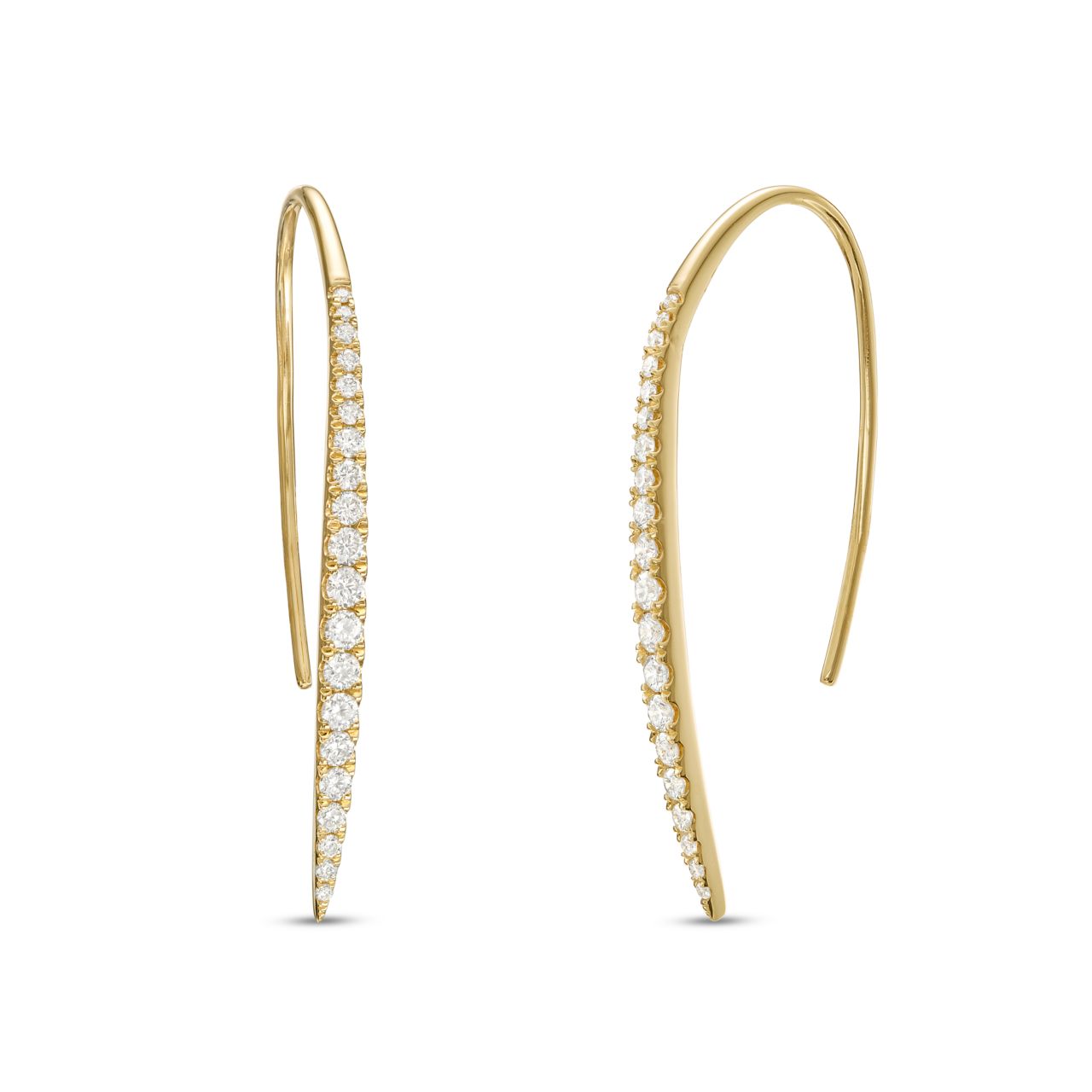 Product Description Modern and elegant, these threader style wire earrings feature a tapered design with round brilliant cut diamonds totaling 0.58 carats. Other Details Metal Color: White Gold Metal Color: Yellow Gold Gemstone Type: Diamond Type: Earrings Earring Type: Dangle Disable Reason: None Style: Contemporary Total Setting Diamond Carat Weight: 0.58TW
