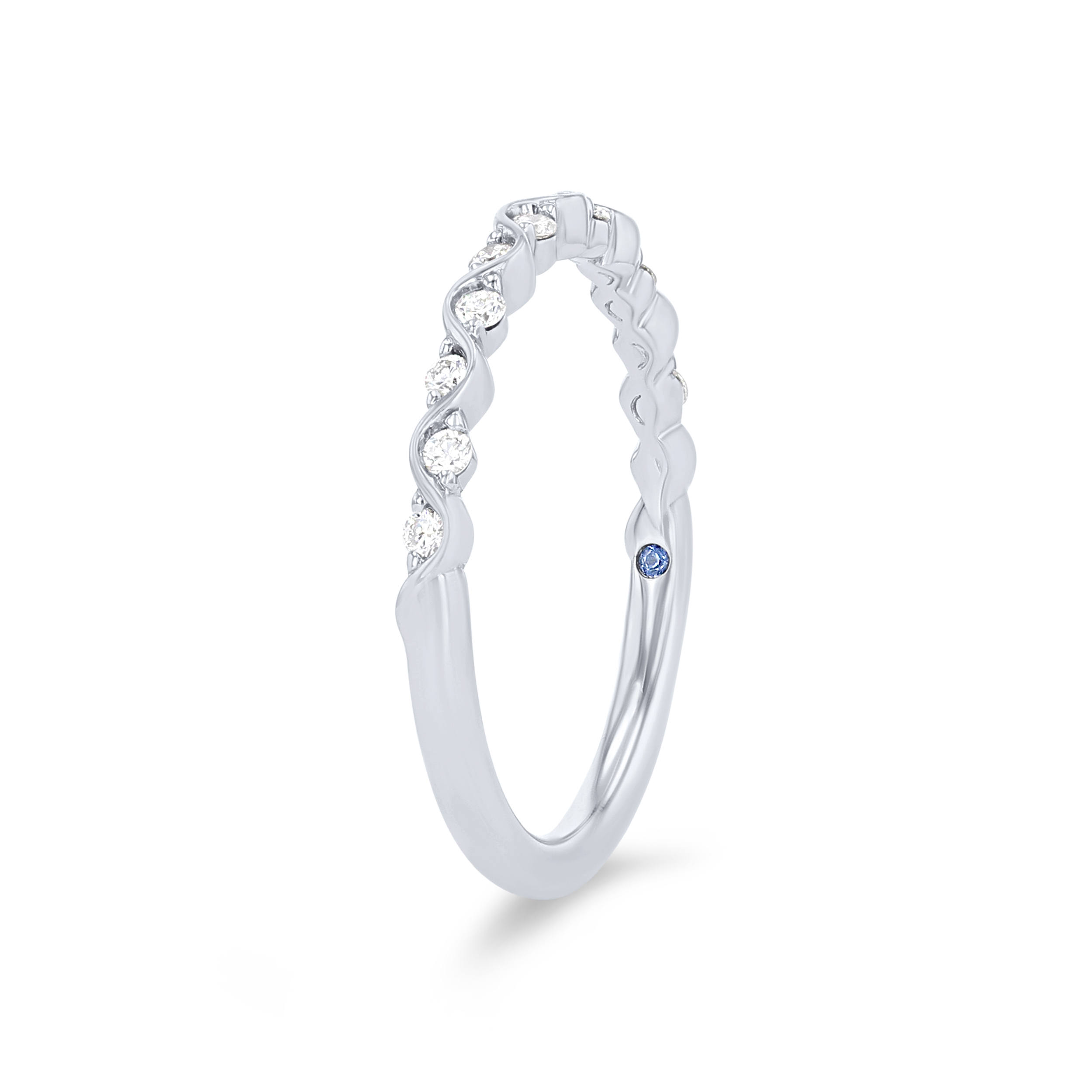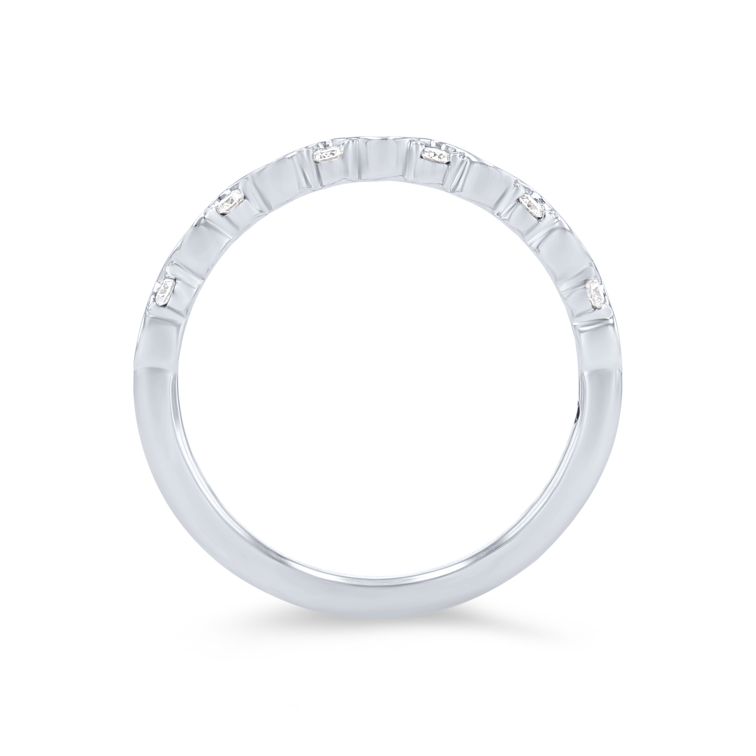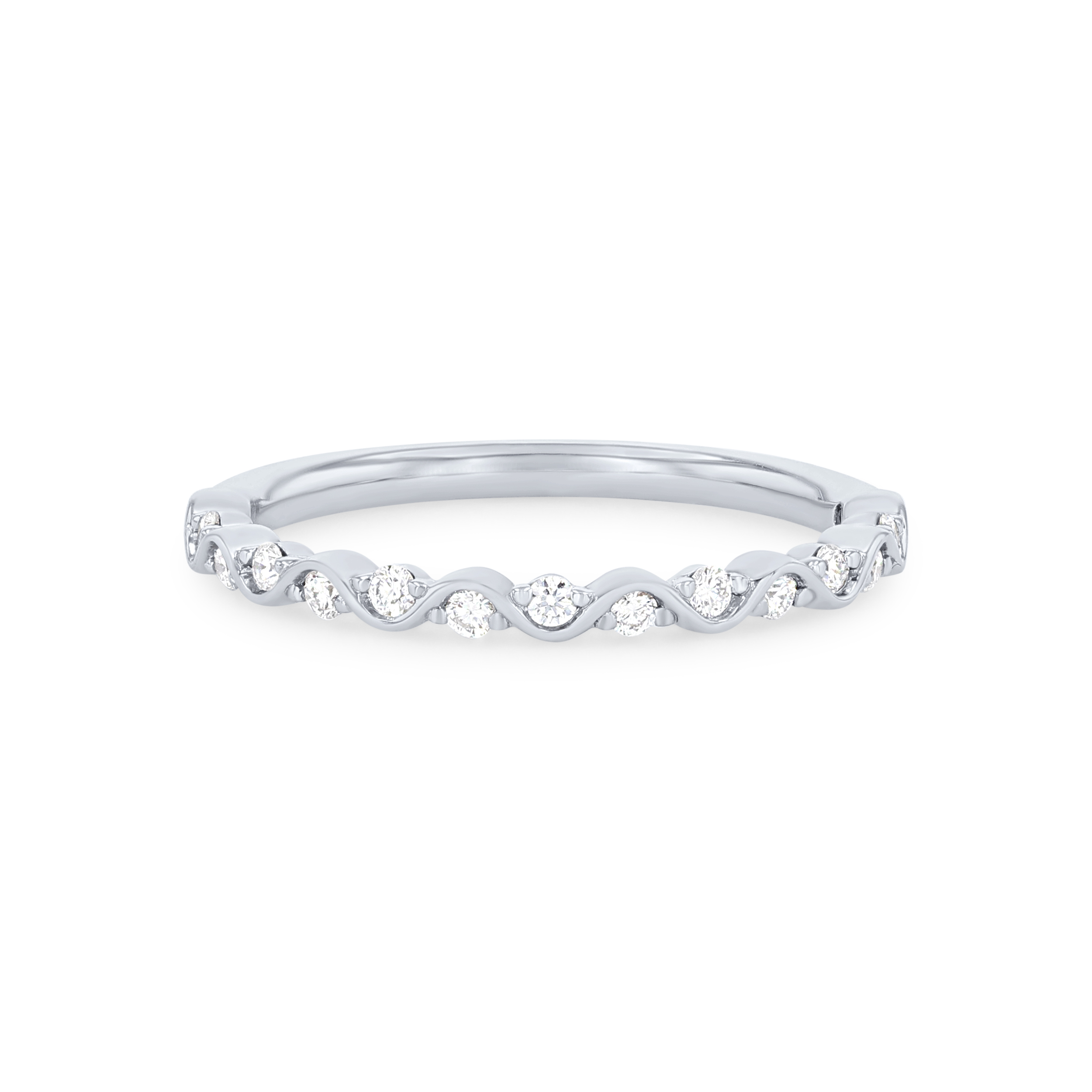 Product Description This eye-catching wedding band features a wavy prong design, accented with 0.16 carats of round brilliant cut diamonds. Other Details Diamond: Stackable Metal Color: Rose Gold Style: Contemporary Metal Color: Yellow Gold Metal Color: White Gold Disable Reason: None Wedding Band Type: Twist Total Setting Diamond Carat Weight: 0.16TW Metal Color: Platinum Type: Ladies Wedding Band Gemstone Type: Diamond