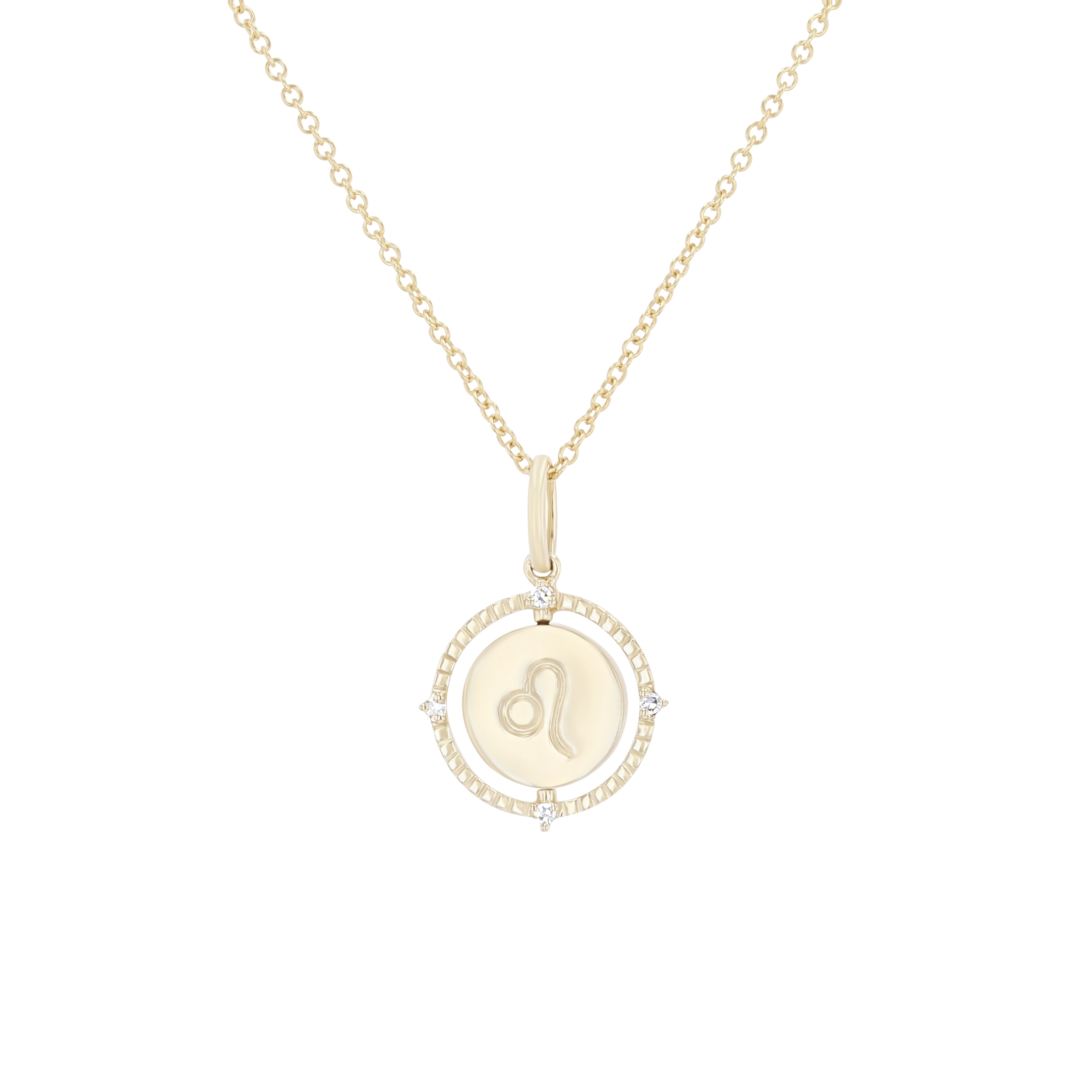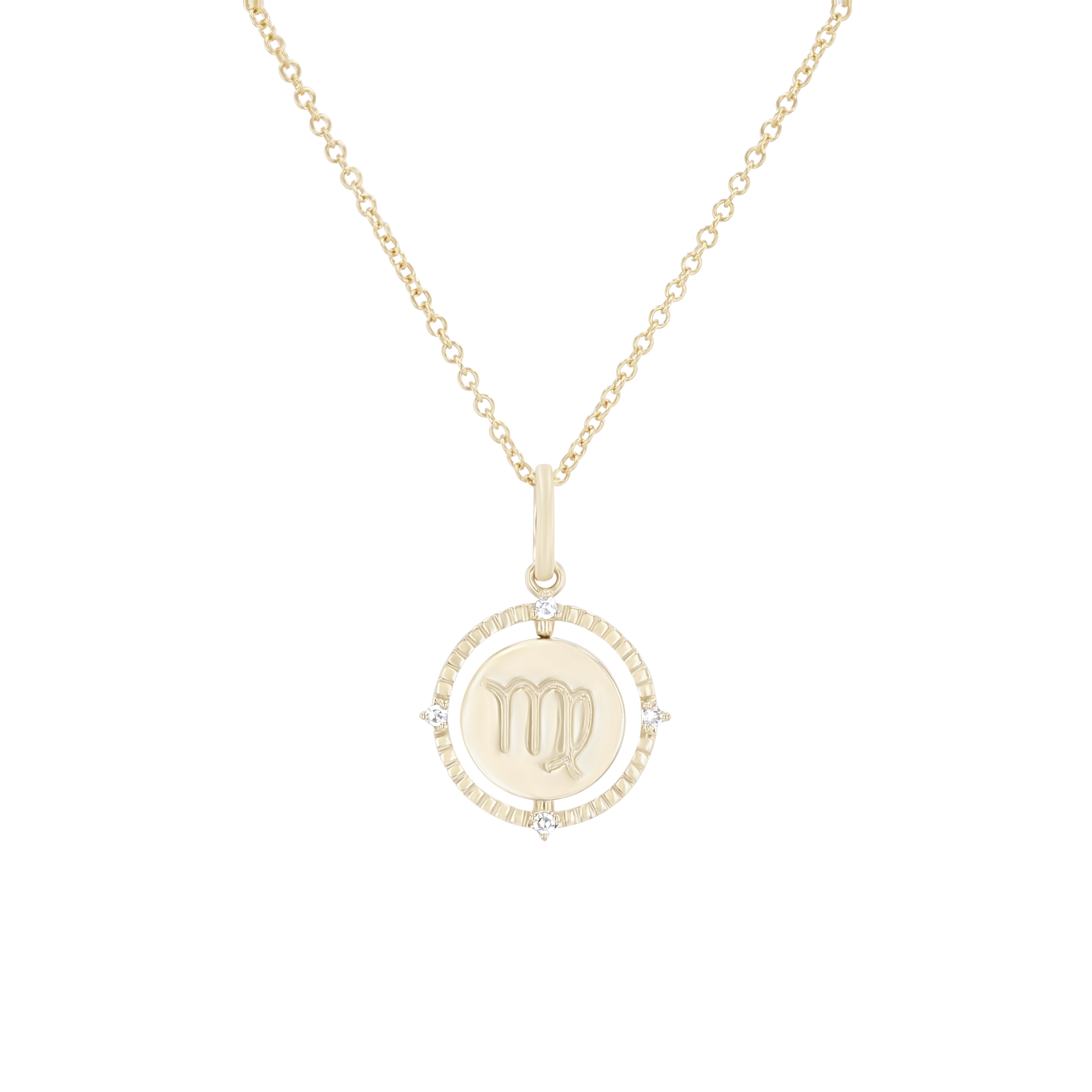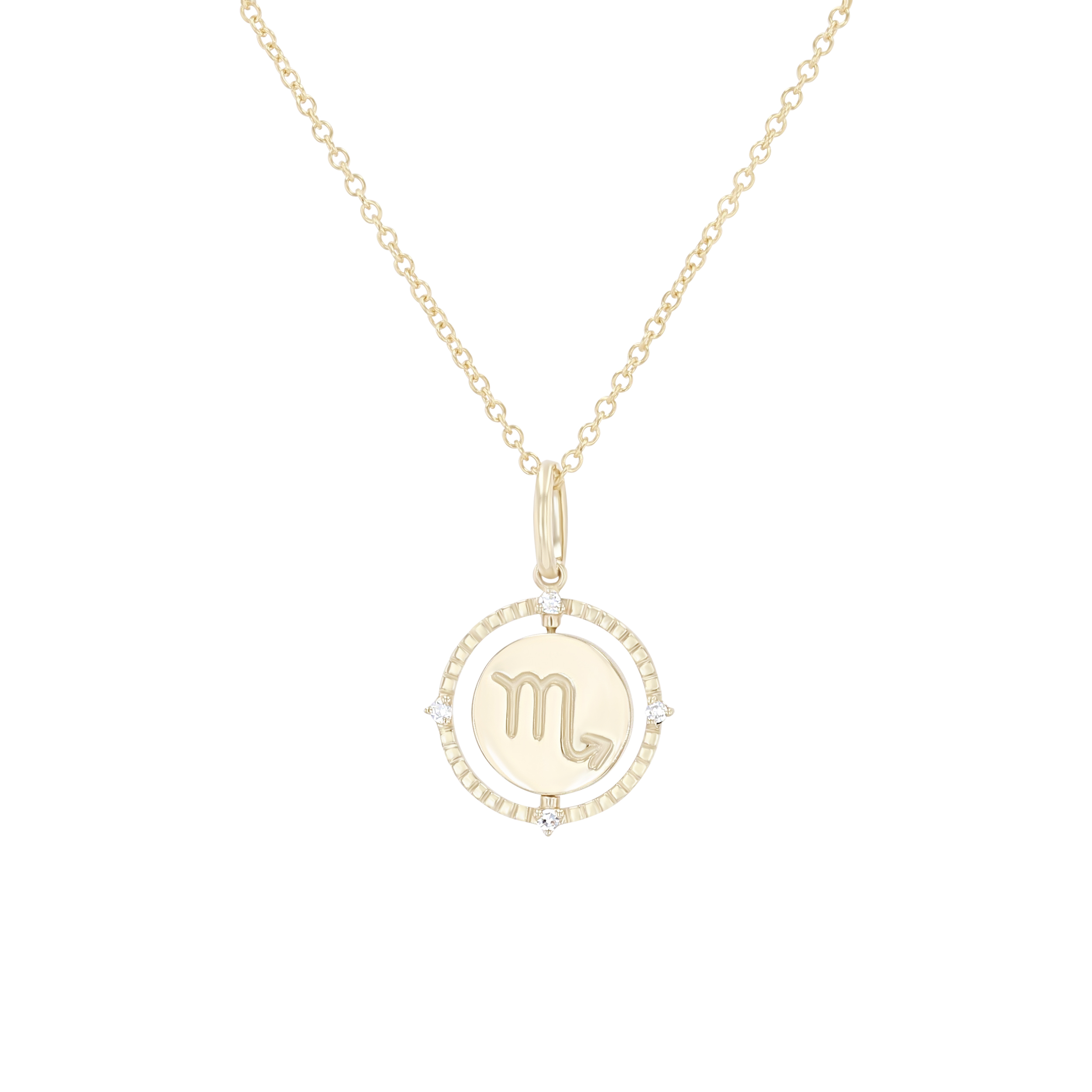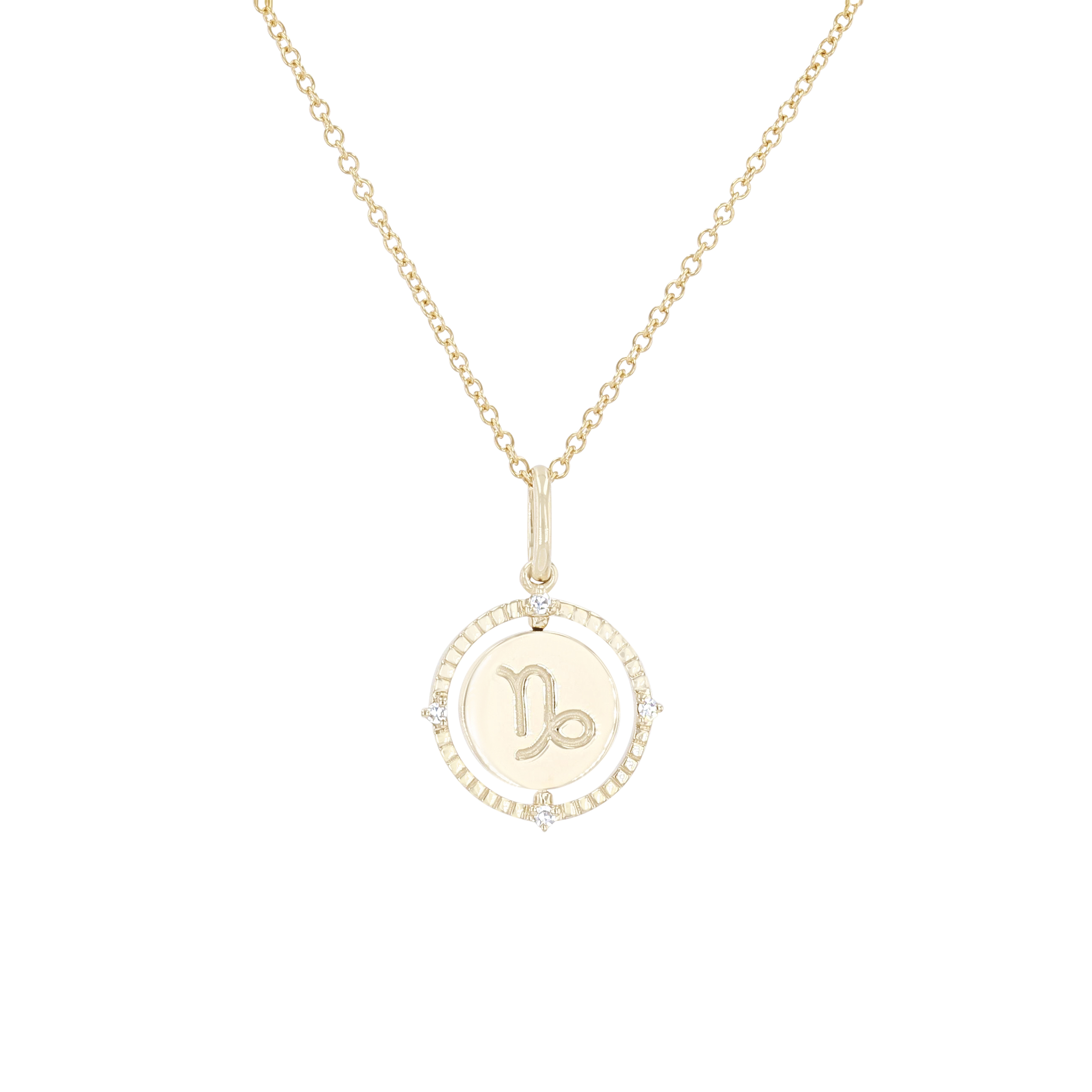 Product Description A perfect personalized gift for anyone, this Zodiac pendant features a flip disc design and is accented with round brilliant cut diamonds. Other Details Length: 18 IN Metal Color: Yellow Gold Style: Contemporary Gemstone Type: Diamond Type: Necklace Disable Reason: None Necklace Type: Fashion Pendant Type: Circle