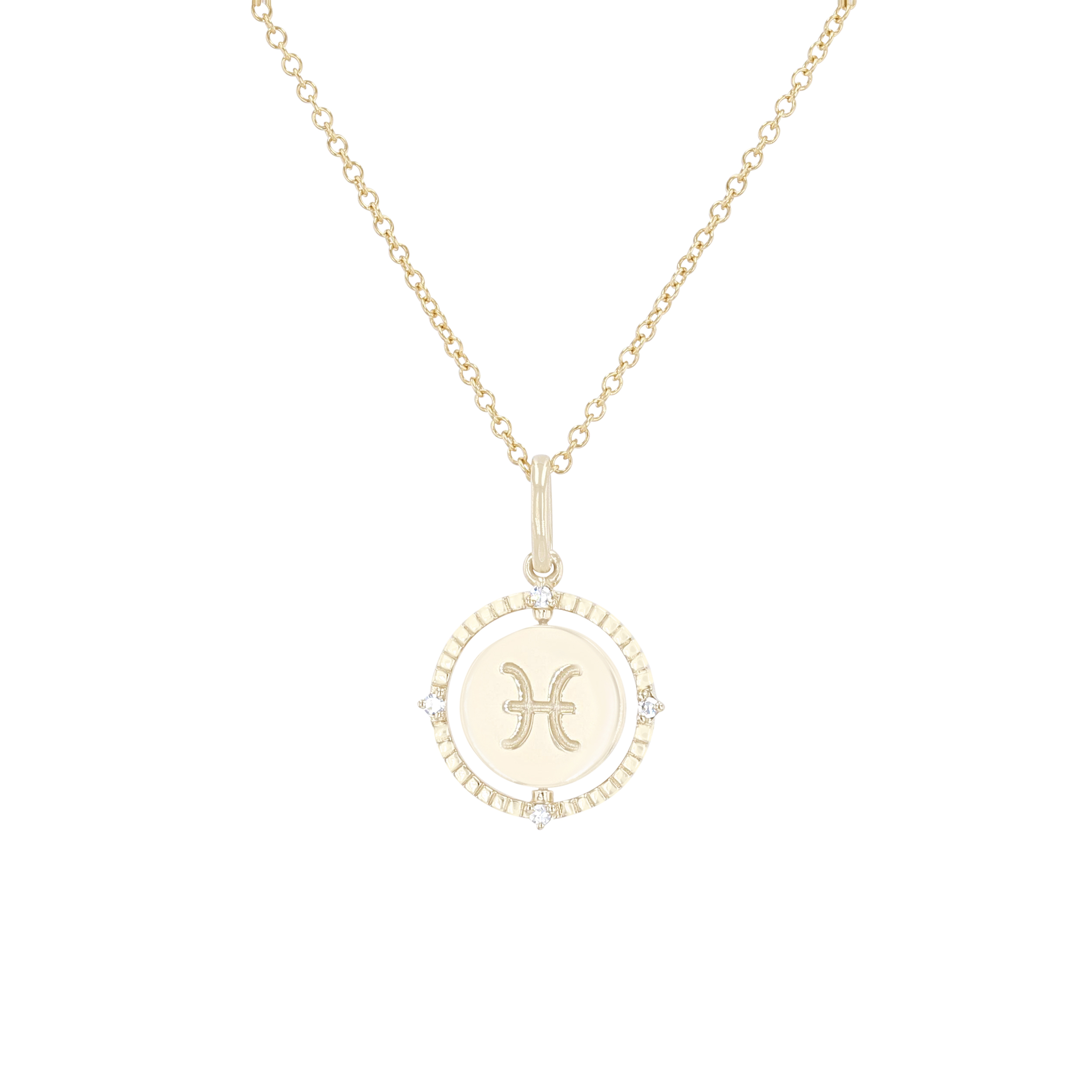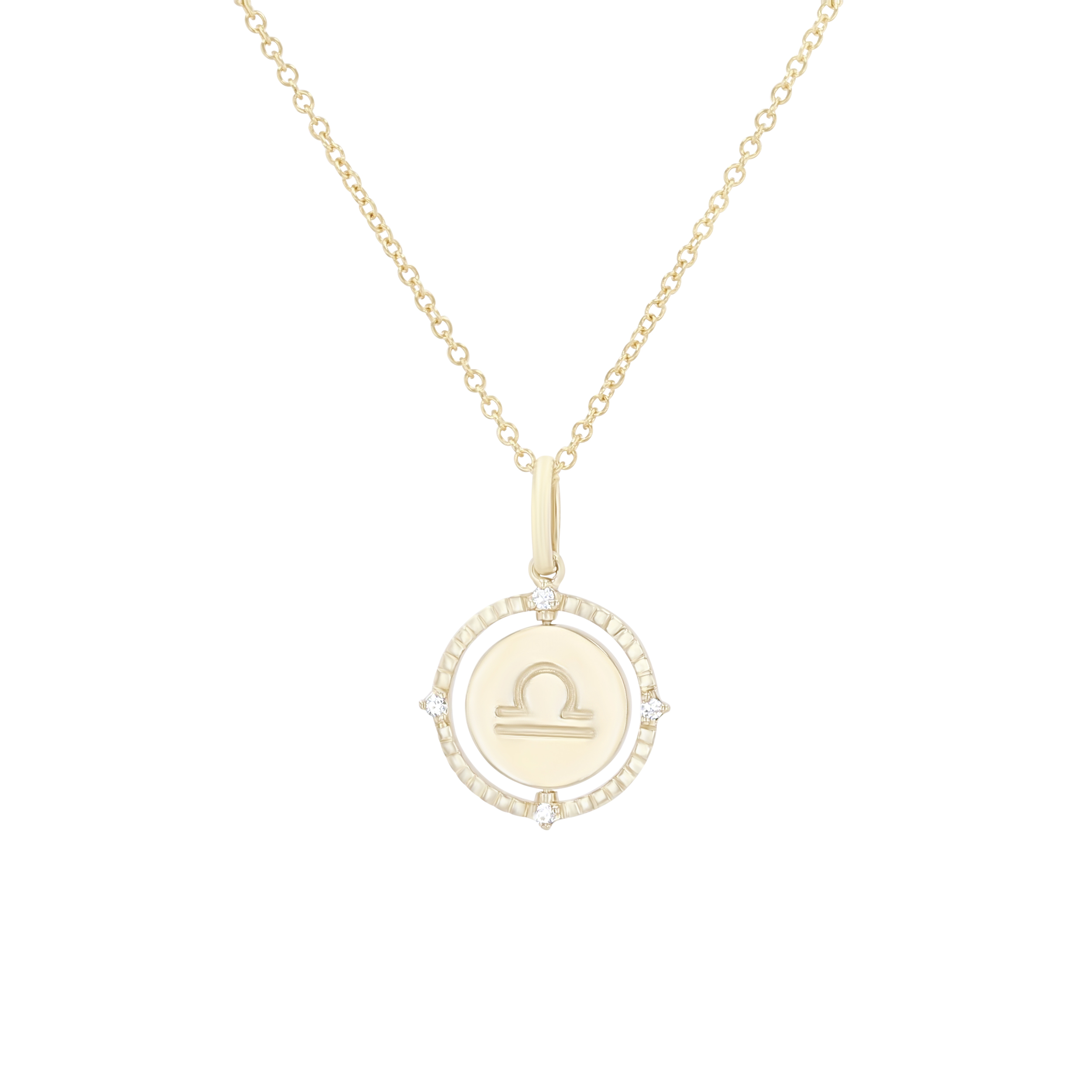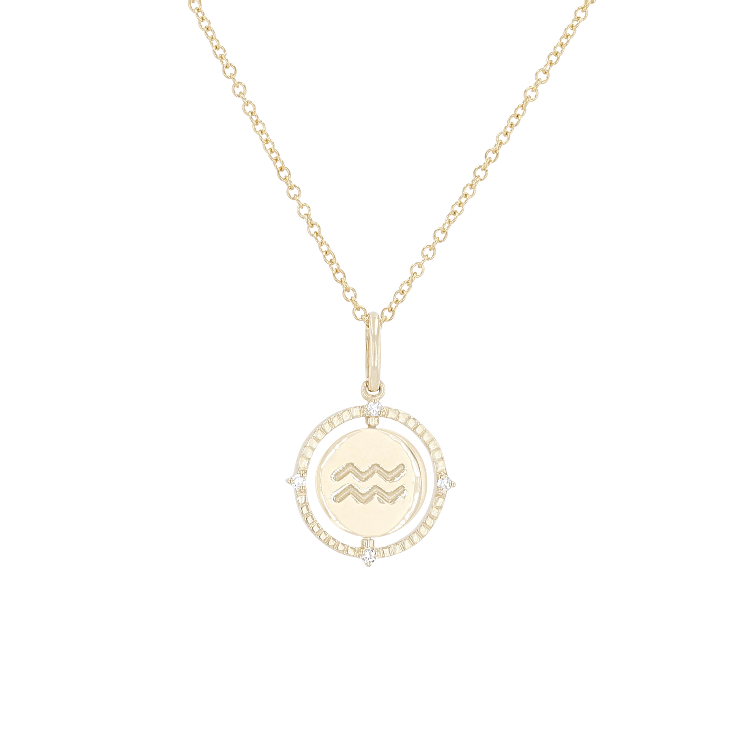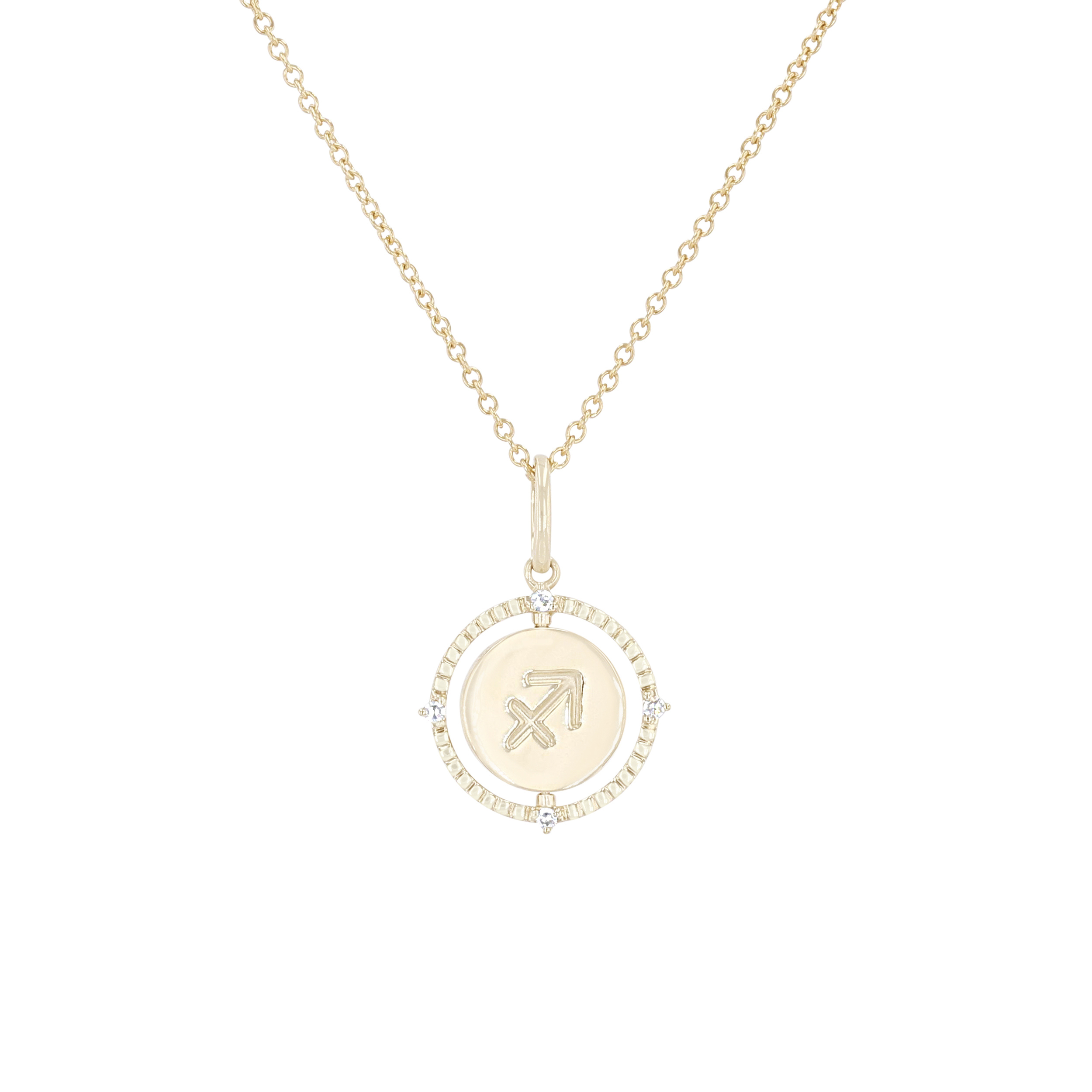 Product Description A perfect personalized gift for anyone, this Zodiac pendant features a flip disc design and is accented with round brilliant cut diamonds. Other Details Length: 18 IN Metal Color: Yellow Gold Style: Contemporary Gemstone Type: Diamond Type: Necklace Disable Reason: None Necklace Type: Fashion Pendant Type: Circle
