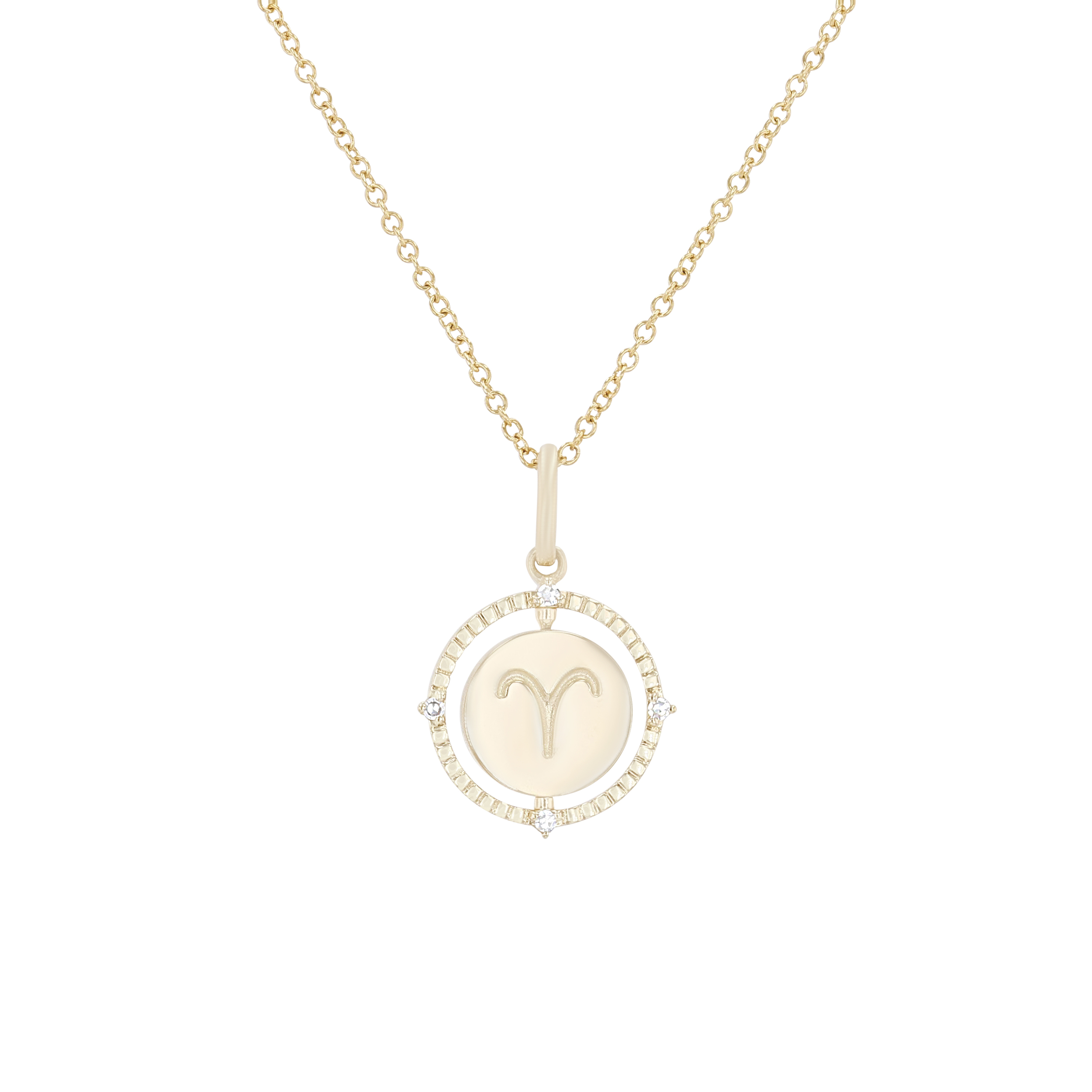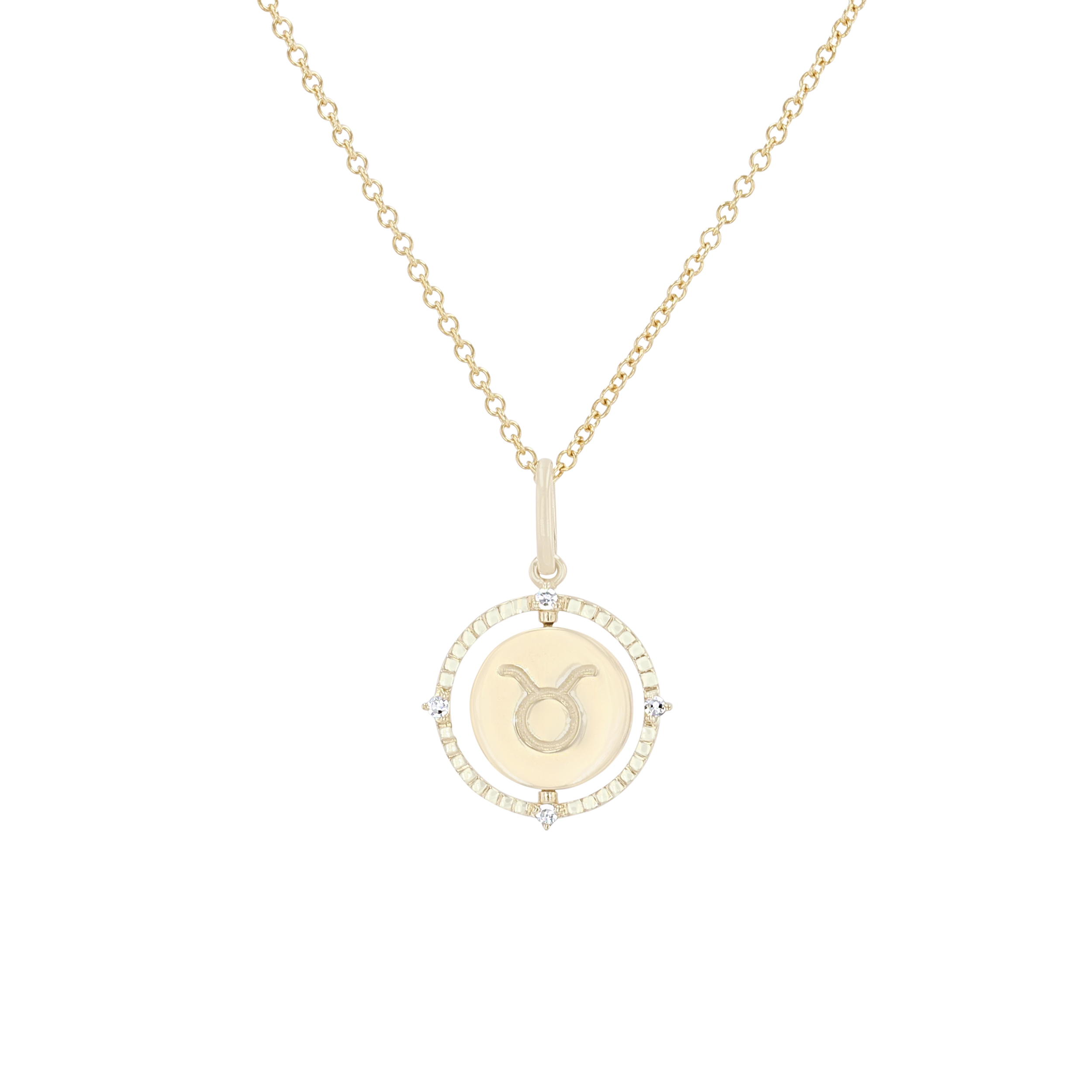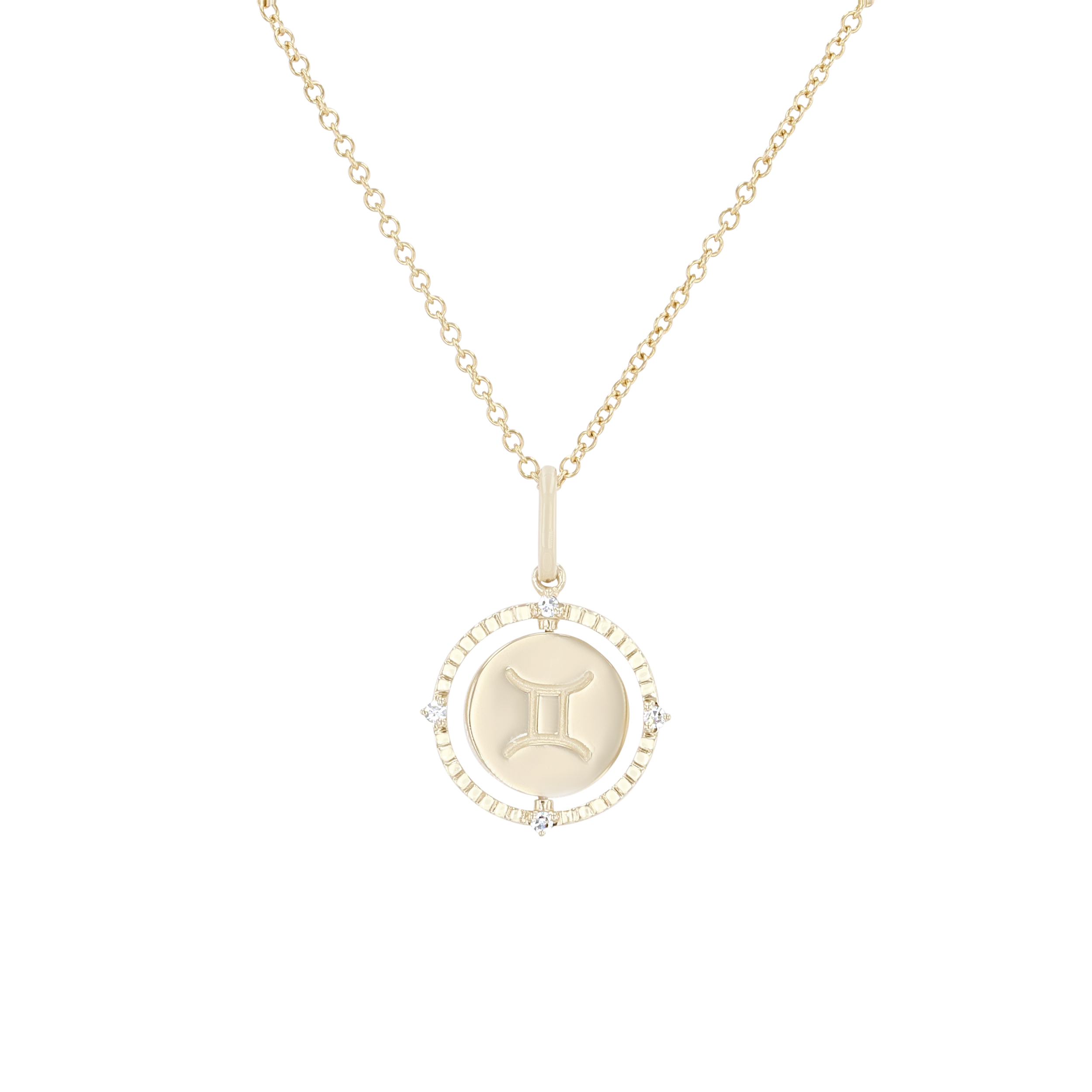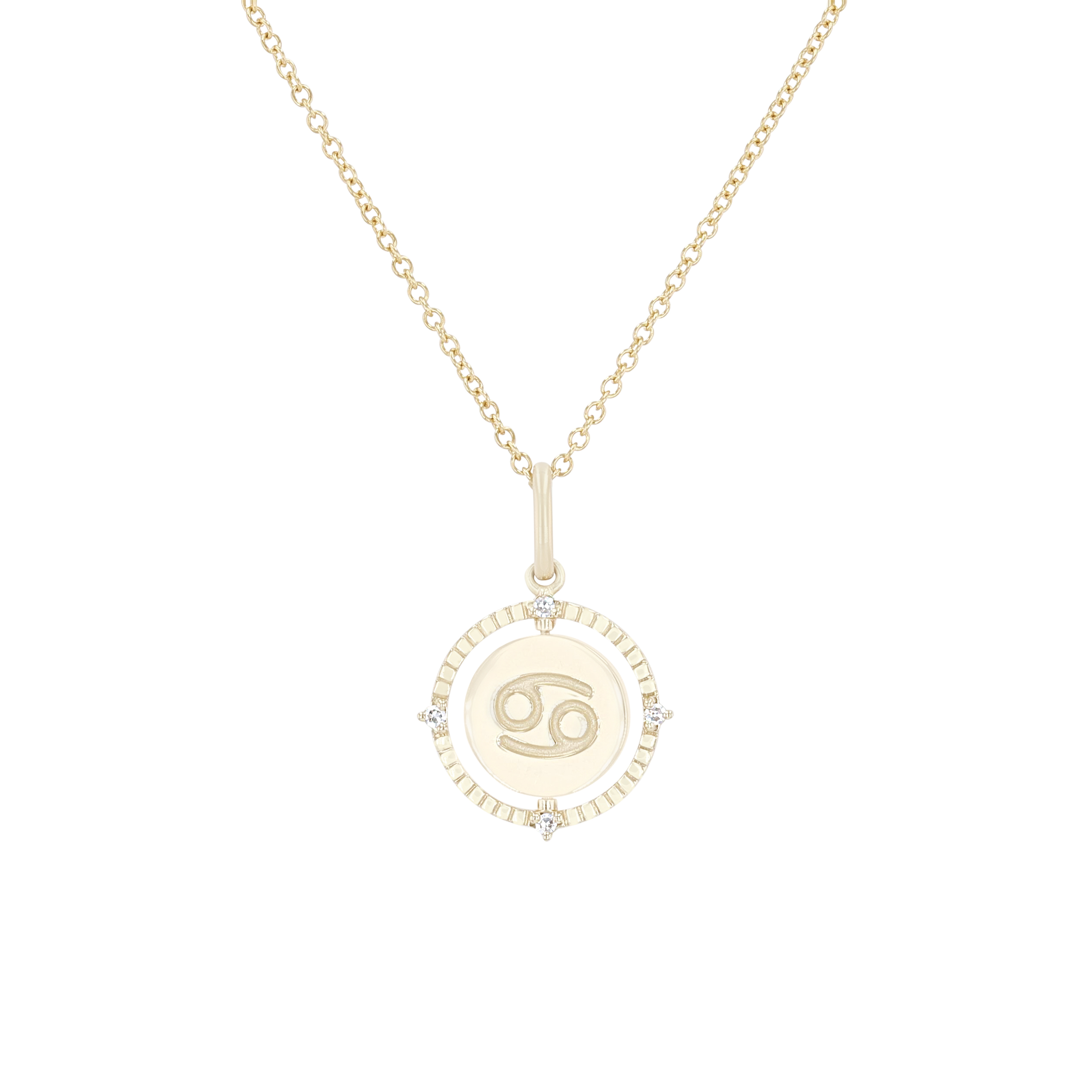 Product Description A perfect personalized gift for anyone, this Zodiac pendant features a flip disc design and is accented with round brilliant cut diamonds. Other Details Length: 18 IN Metal Color: Yellow Gold Style: Contemporary Gemstone Type: Diamond Type: Necklace Disable Reason: None Necklace Type: Fashion Pendant Type: Circle