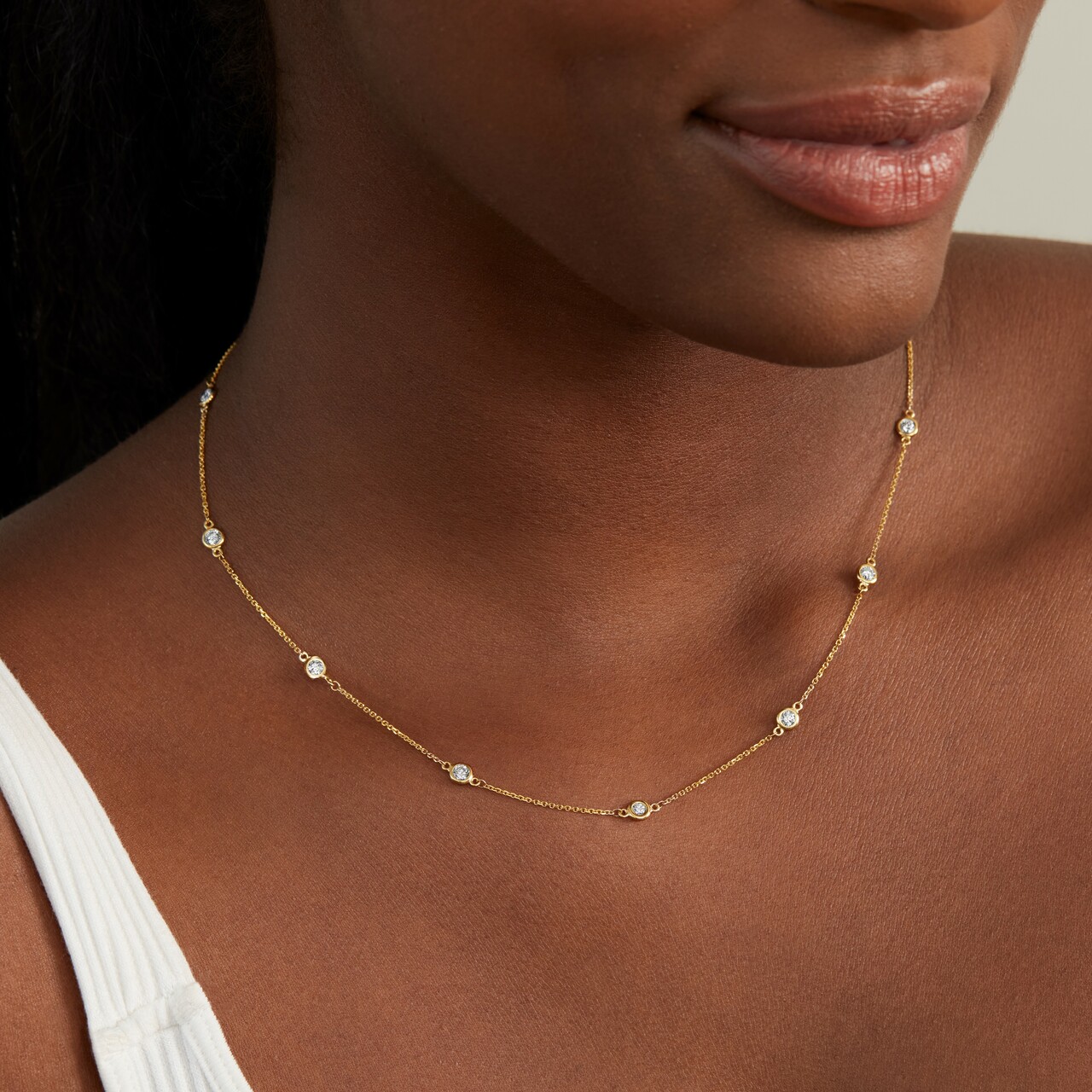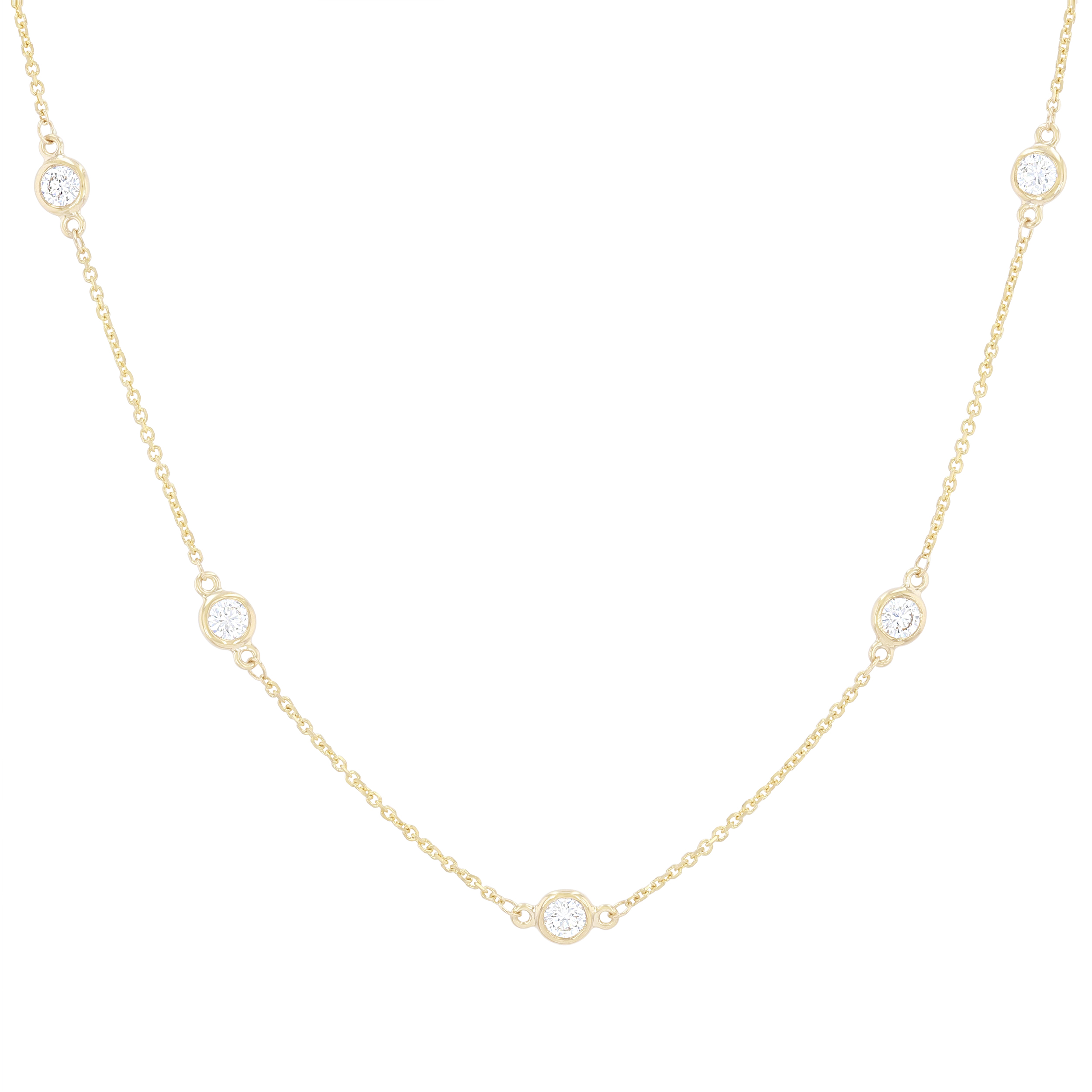 Product Description An elegant piece that pairs beautifully with any look, this diamonds by the yard necklace features 12 round brilliant cut diamonds totaling 1.30 carats and measures 18 inches long. Other Details Type: Necklace Disable Reason: None Length: 18 IN Necklace Type: Fashion Total Setting Diamond Carat Weight: 1.3TW Metal Color: Rose Gold Metal Color: White Gold Style: Contemporary Gemstone Type: Diamond Metal Color: Yellow Gold Pendant Type: Station