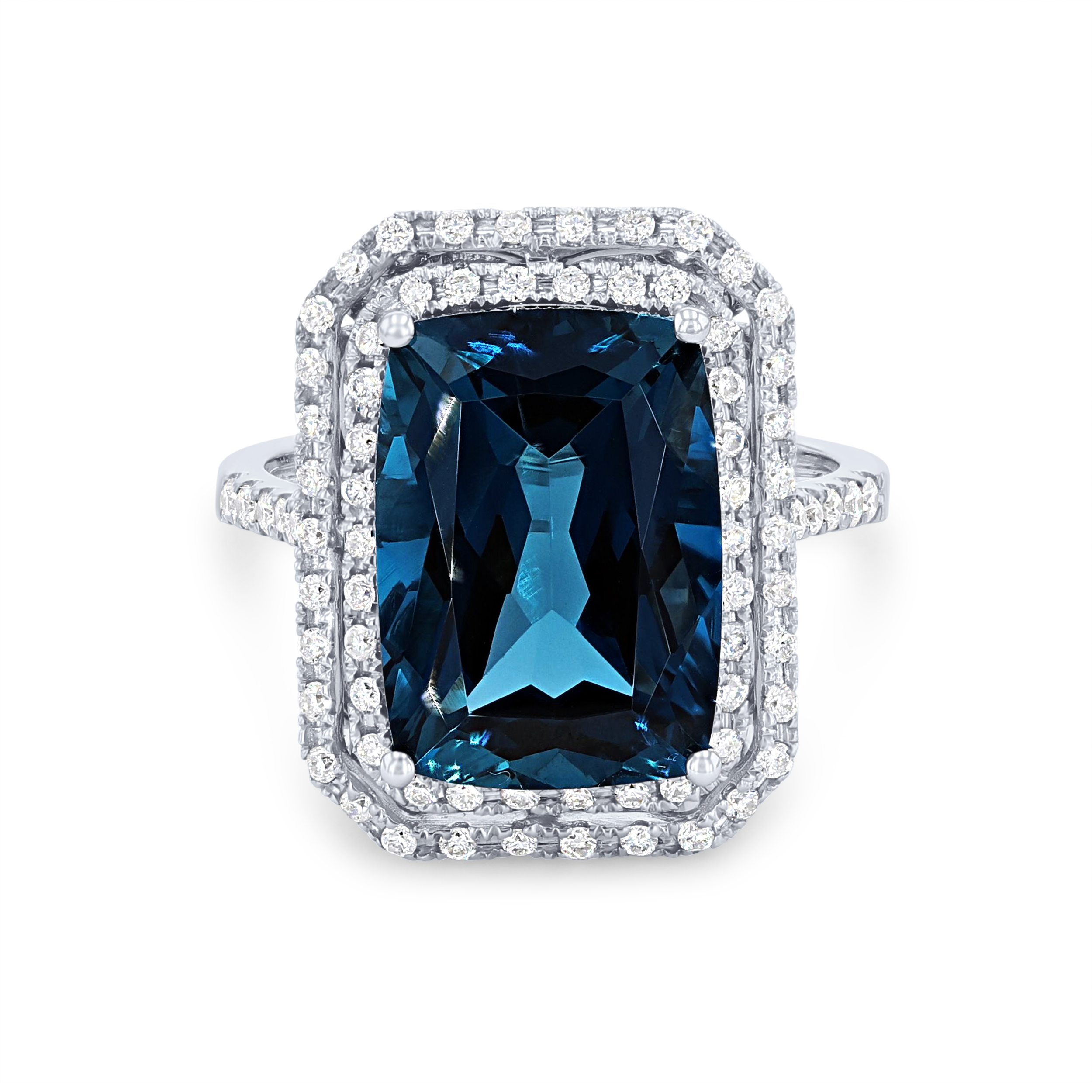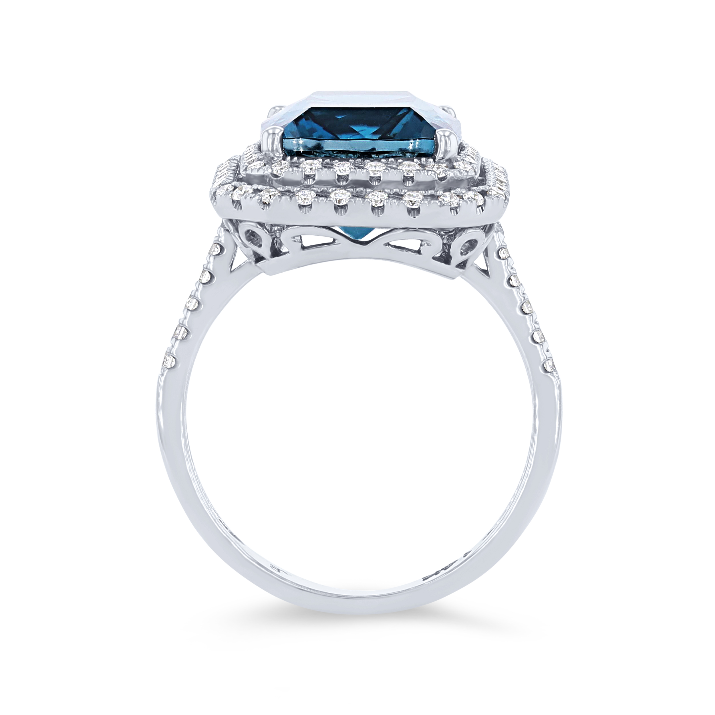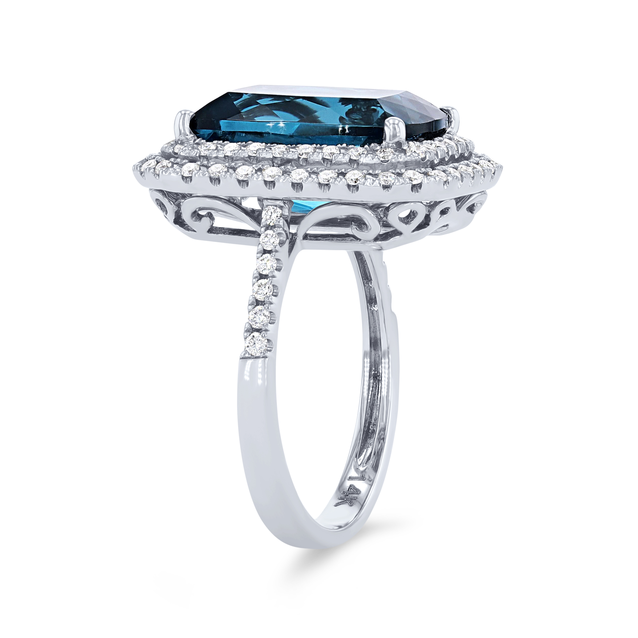 Product Description A colorful statement that is sure to catch the eye, this ring features a 8.90 carat London blue topaz surrounded by a double halo of round brilliant diamonds totaling 0.57 carats. Other Details Center Stone Type: Topaz Metal Color: White Gold Disable Reason: None Style: Contemporary Center Stone Shape: Emerald Women Wedding Band Type: Gemstone Total Gemstone Carat Weight: 8.9TW Total Setting Diamond Carat Weight: 0.57TW Type: Ring Gemstone Type: Blue Topaz
