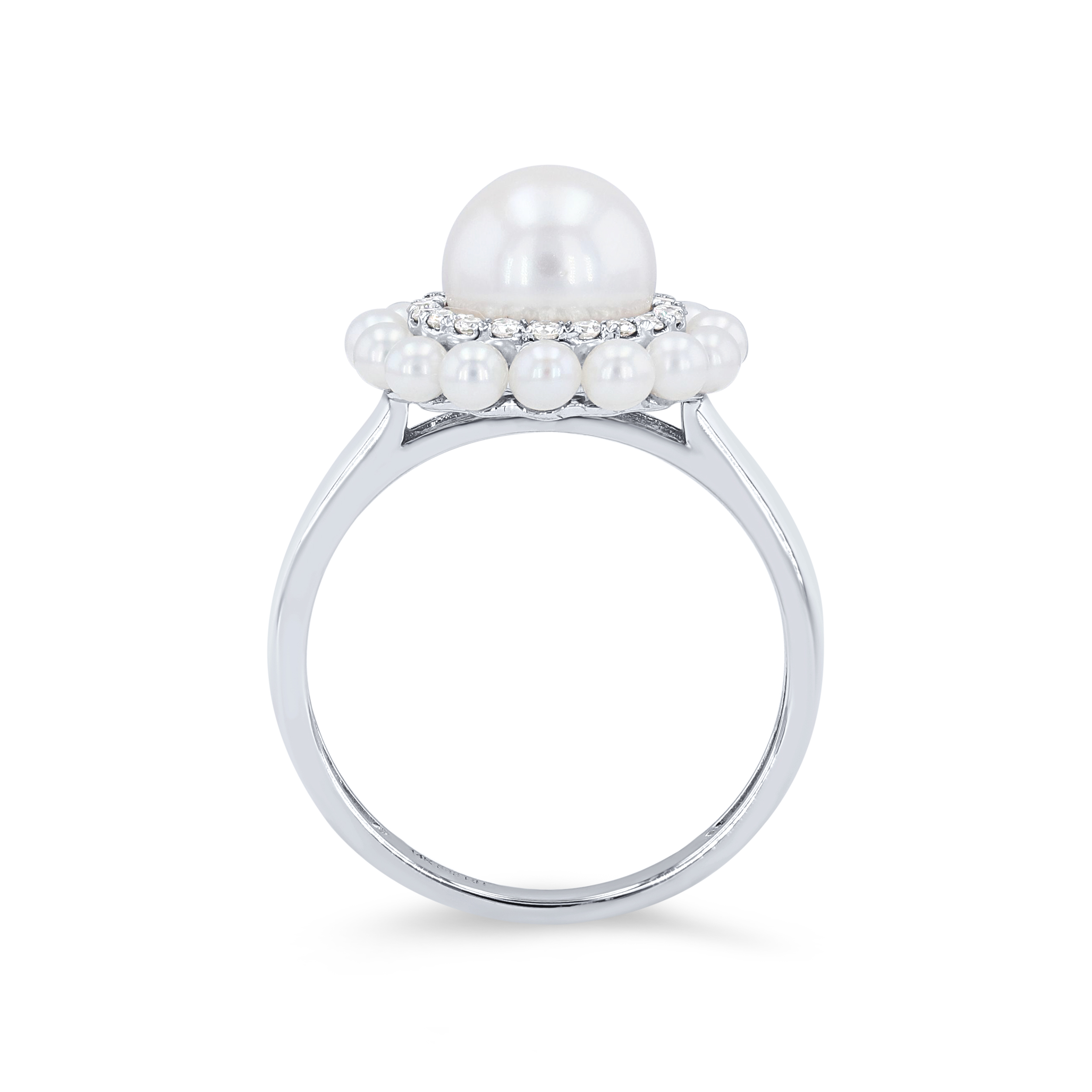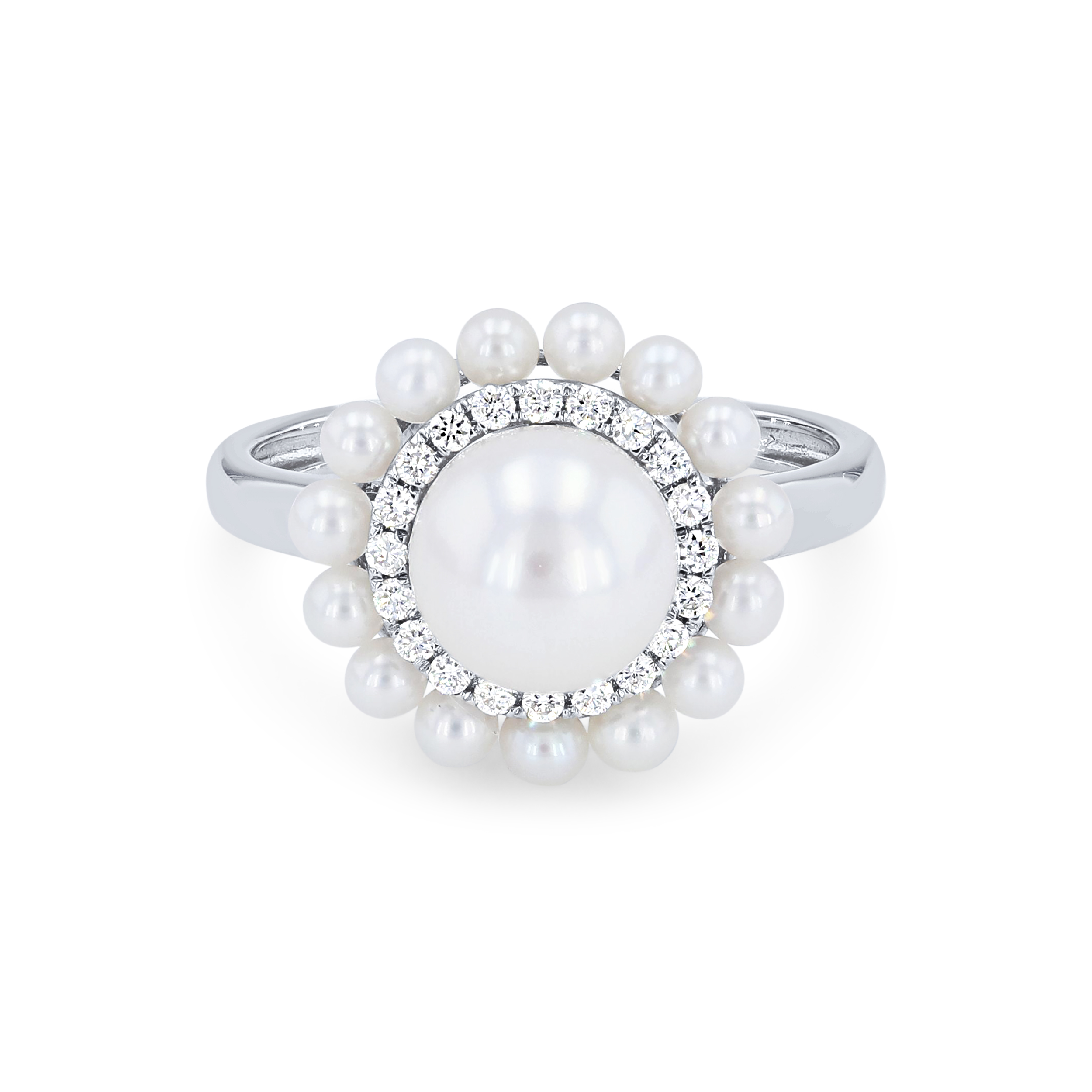Product Description A one-of-a-kind design, this ring features a center freshwater pearl surrounded by a halo of round brilliant cut diamonds totaling 0.14 carats and a halo of smaller pearls. Other Details Disable Reason: None Style: Contemporary Type: Ring Metal Color: White Gold Total Setting Diamond Carat Weight: 0.14TW Women Wedding Band Type: Gemstone Gemstone Type: Pearl