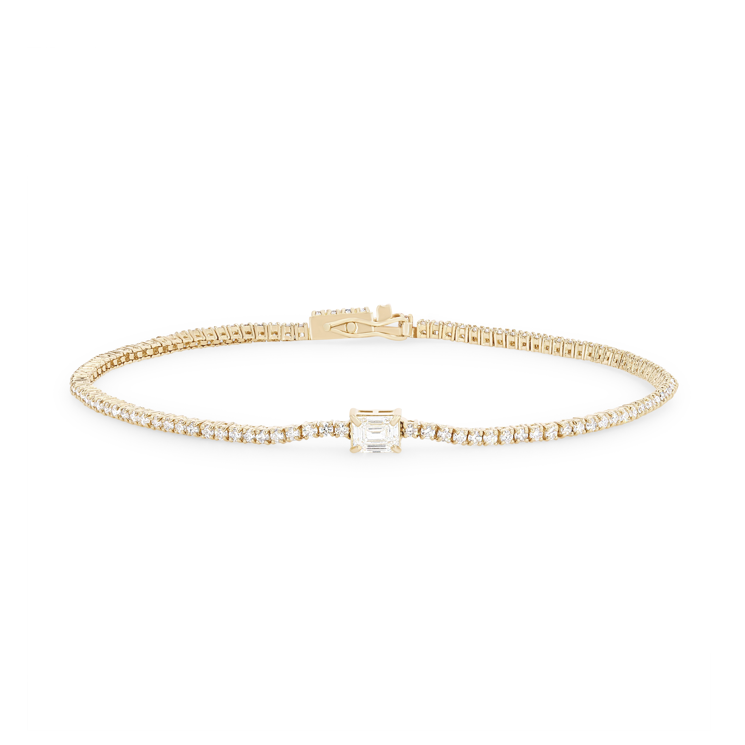 This classic style tennis bracelet features a single emerald cut diamond and round brilliant cut diamonds all totaling 1.60 carats.