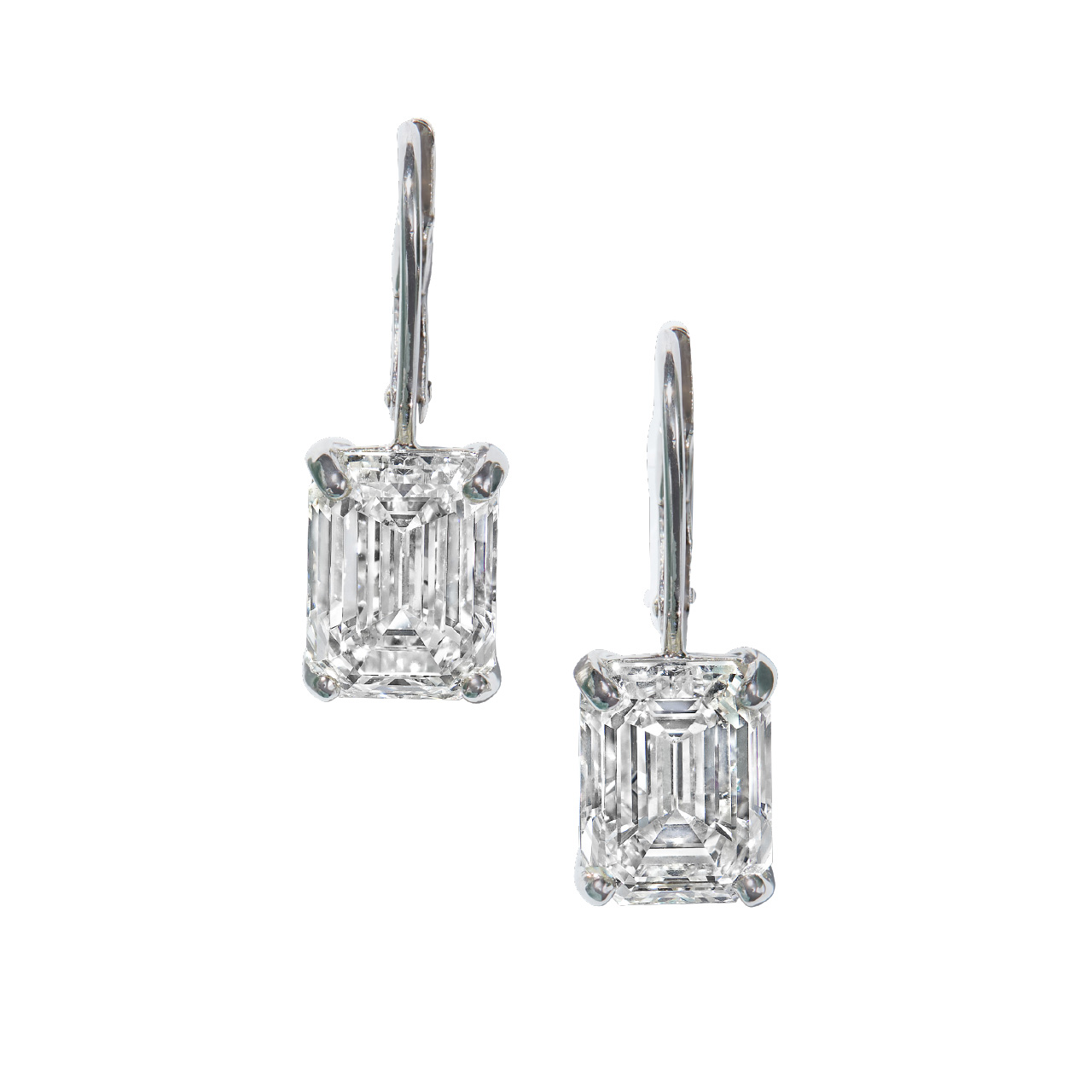 A pair of drop earrings containing 10.01 carats of GIA certified emerald cut diamonds, set in platinum.