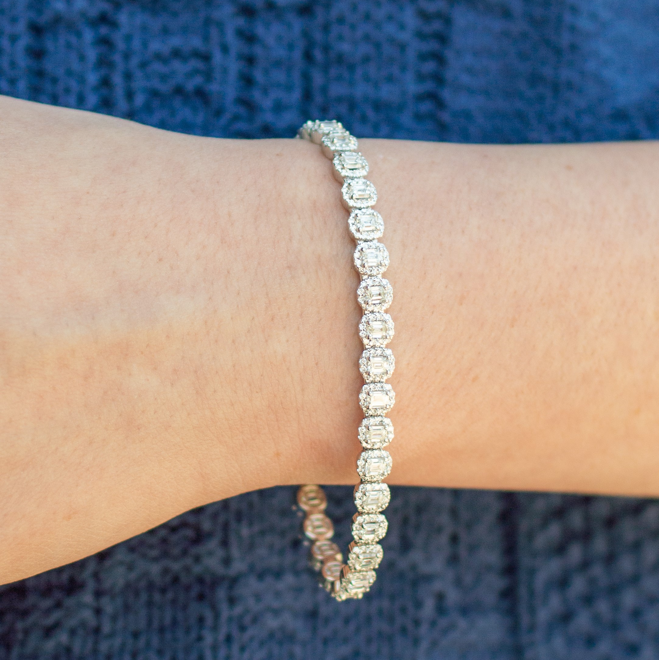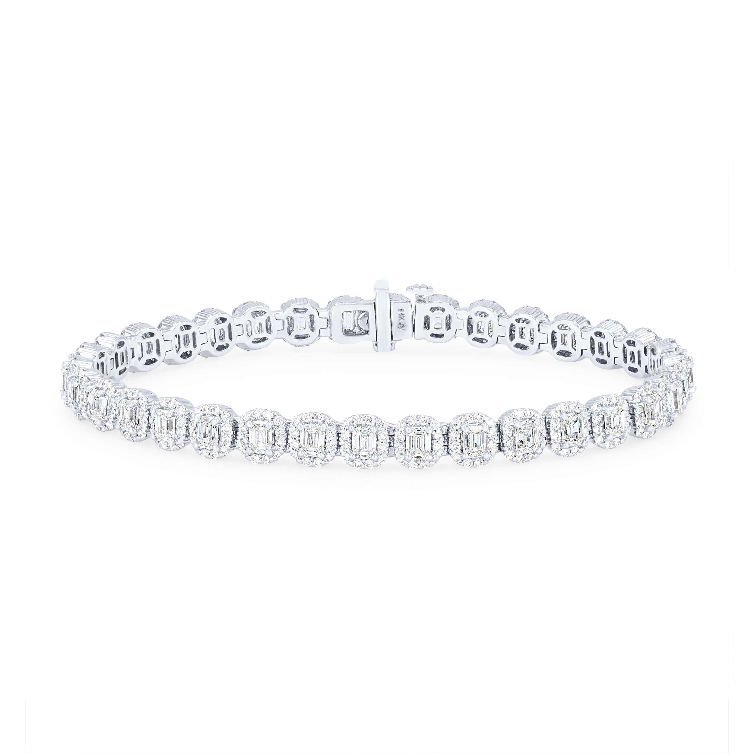 Product Description Beautiful and eye-catching, this tennis bracelet features emerald cut diamonds surrounded by halos of round brilliant cut diamonds, all totaling 7.14 carats. Other Details Length: 7 IN Gemstone Type: Diamond Bracelet Type: Tennis Bracelets Style: Contemporary Metal Color: White Gold Tennis Bracelet Type: Distinctive Tennis Bracelet Total Setting Diamond Carat Weight: 7.14TW Disable Reason: None Type: Bracelet