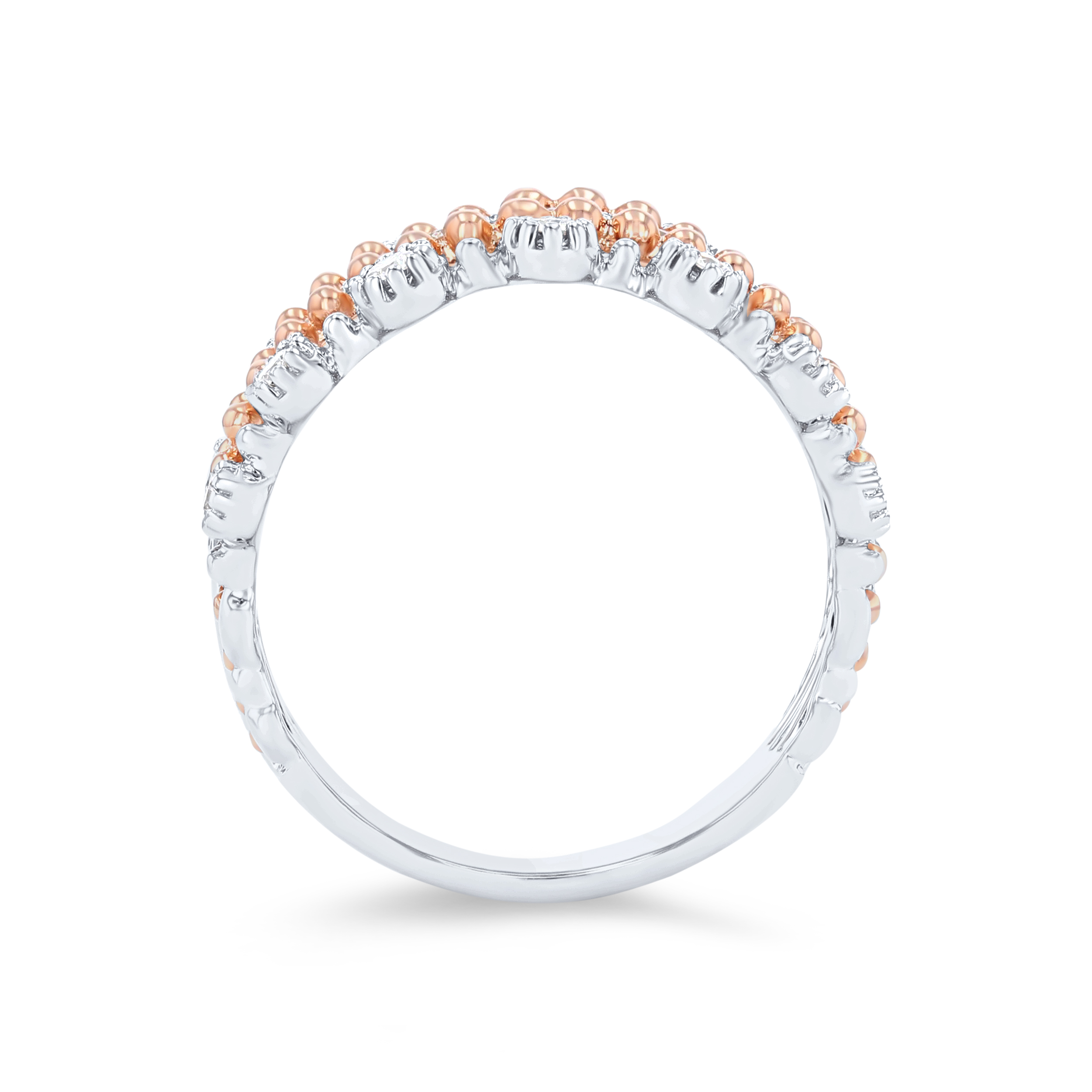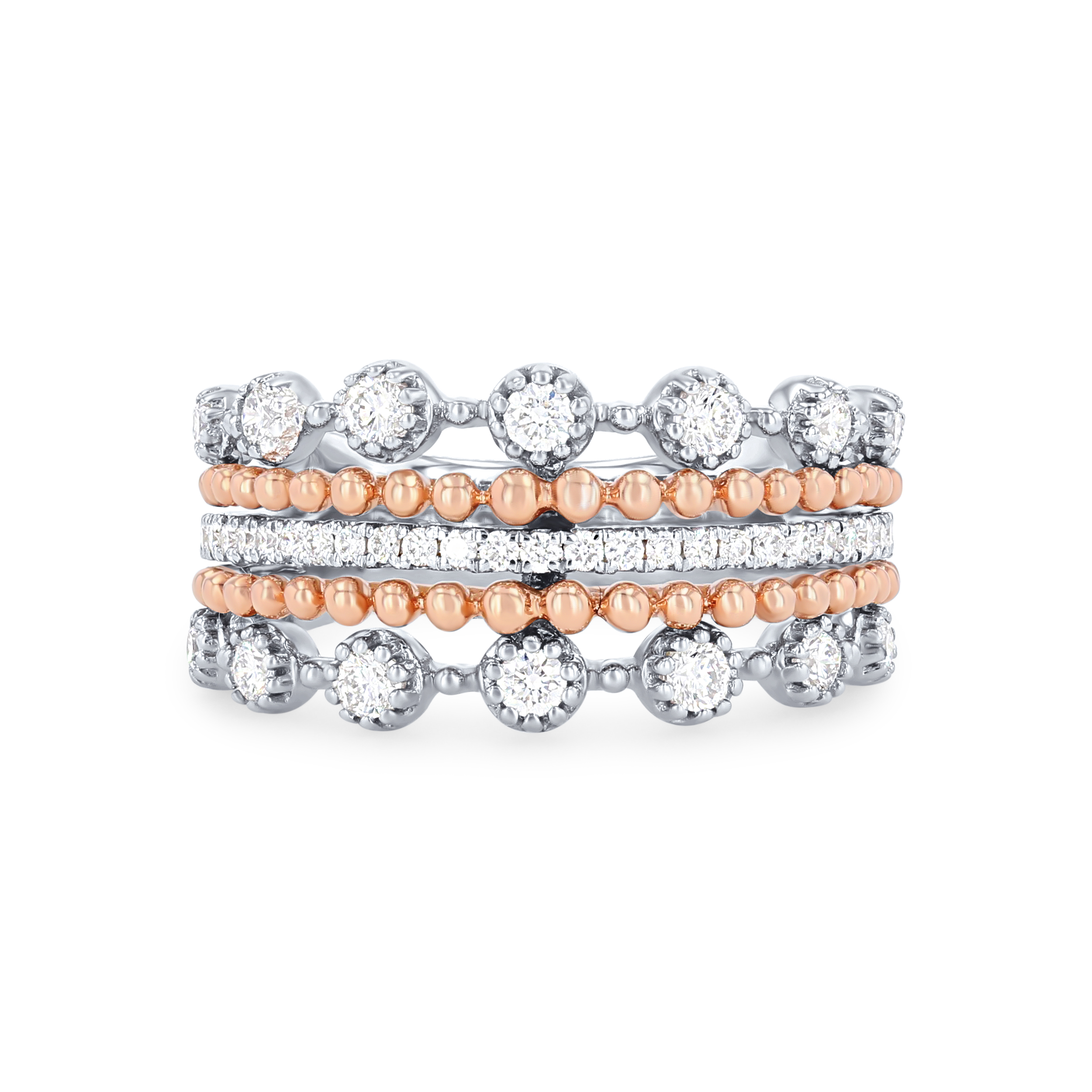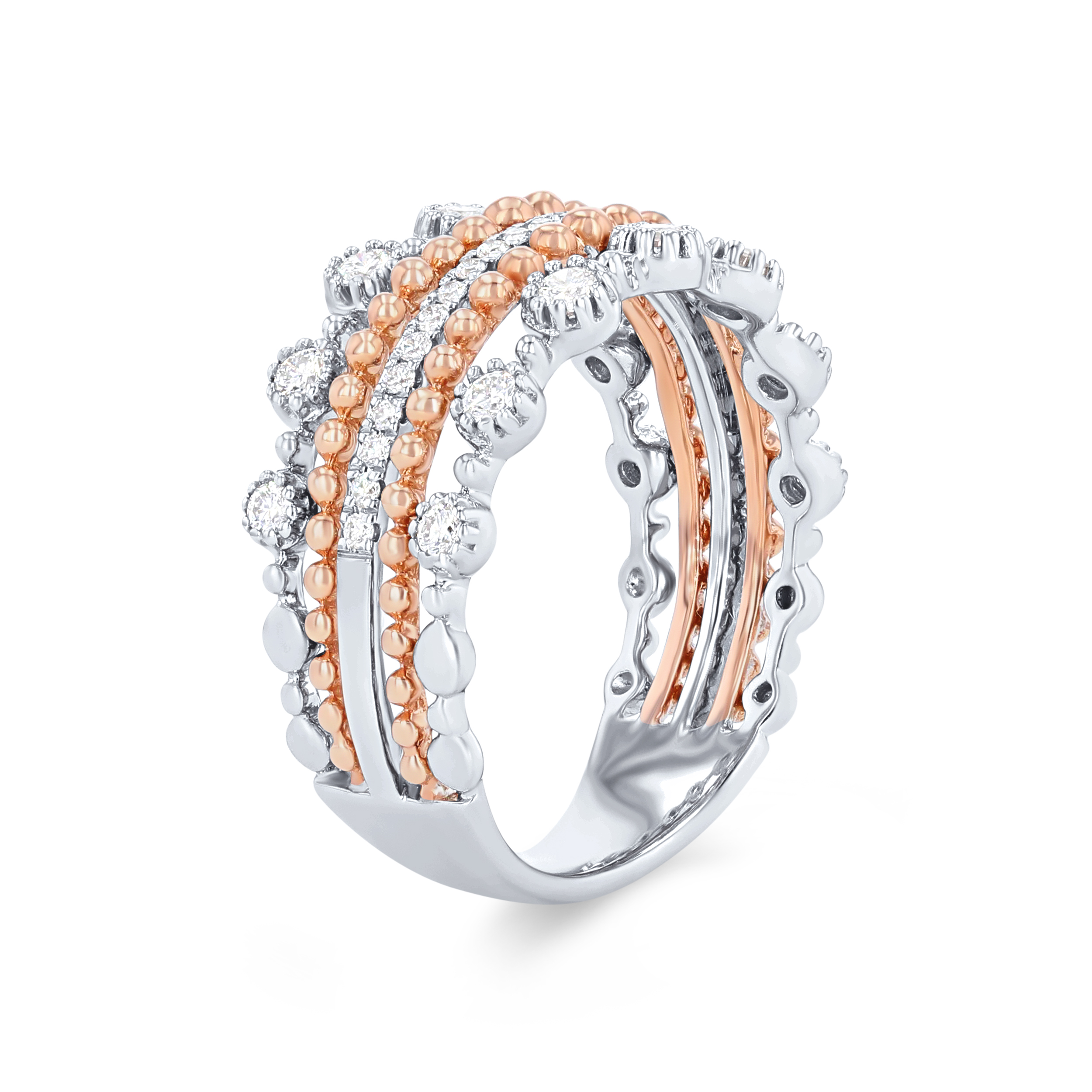 Intricate details create this stunning five-row fashion ring accented by 0.44 carats of round brilliant cut diamonds. The rose gold beading creates beautiful contrast.
