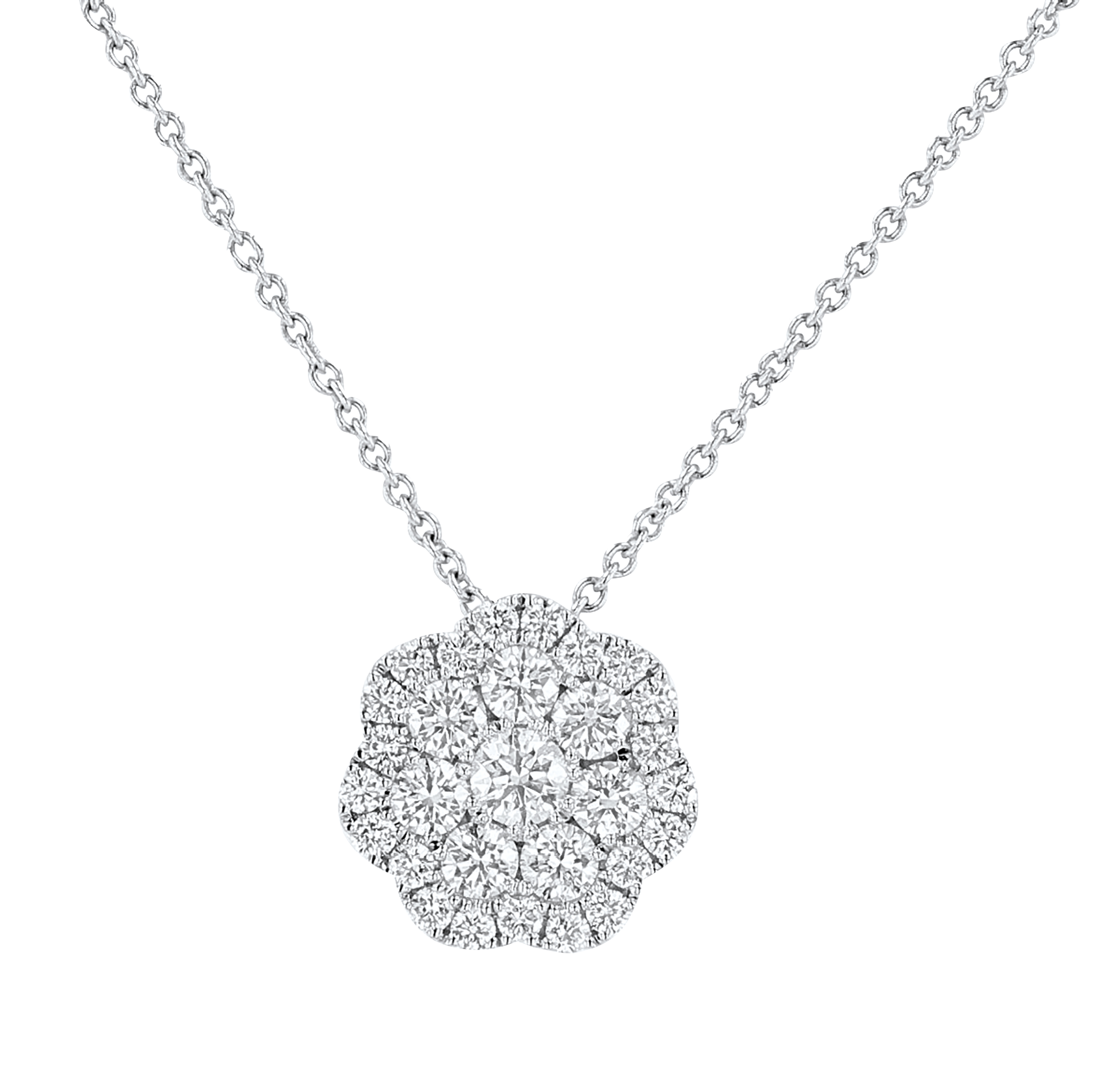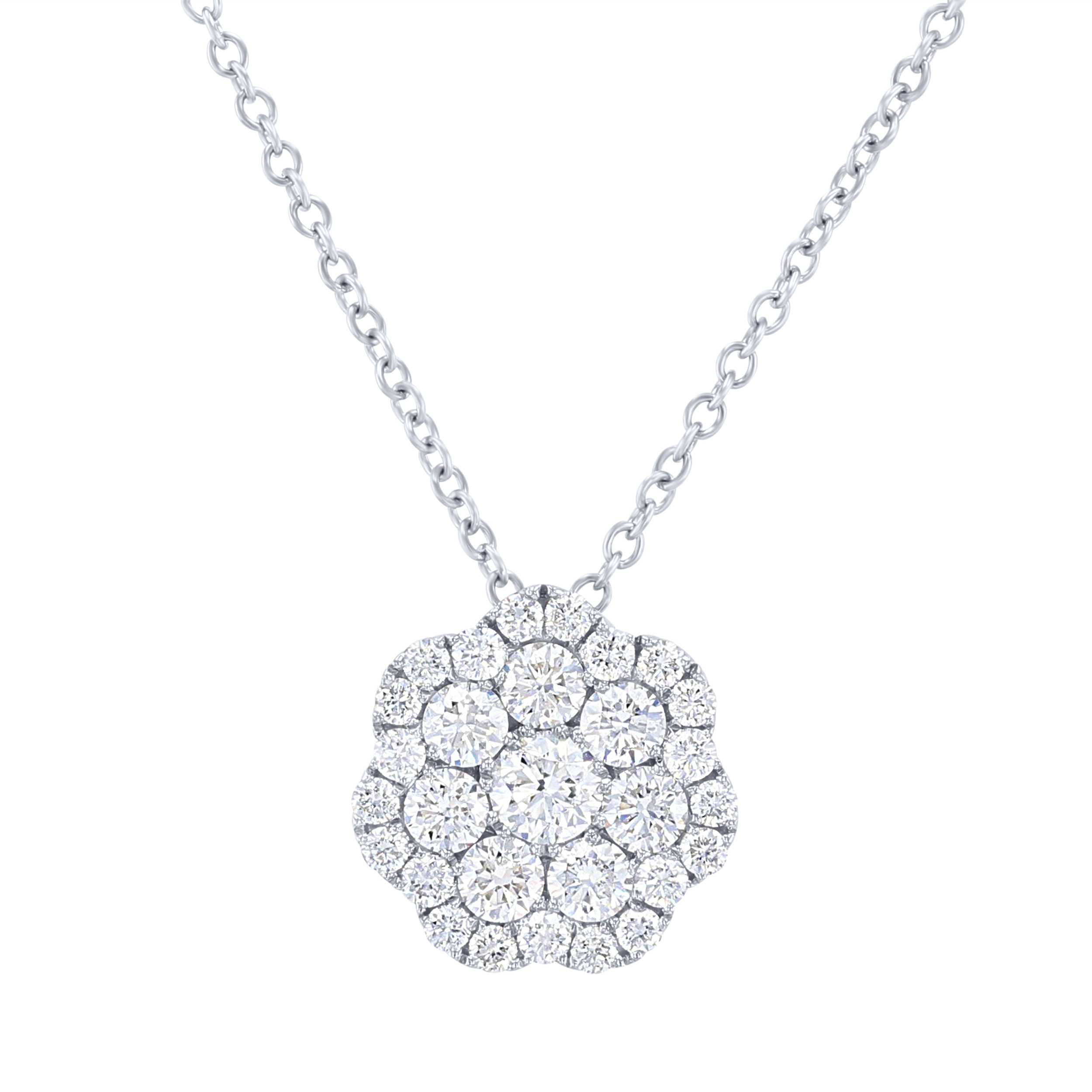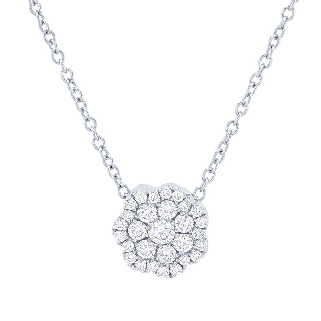 Product Description A cluster of round brilliant cut diamonds crafted in a floral design. Other Details Necklace Type: Fashion Disable Reason: None Pendant Type: Floral Gemstone Type: Diamond Style: Contemporary Type: Necklace Metal Color: White Gold