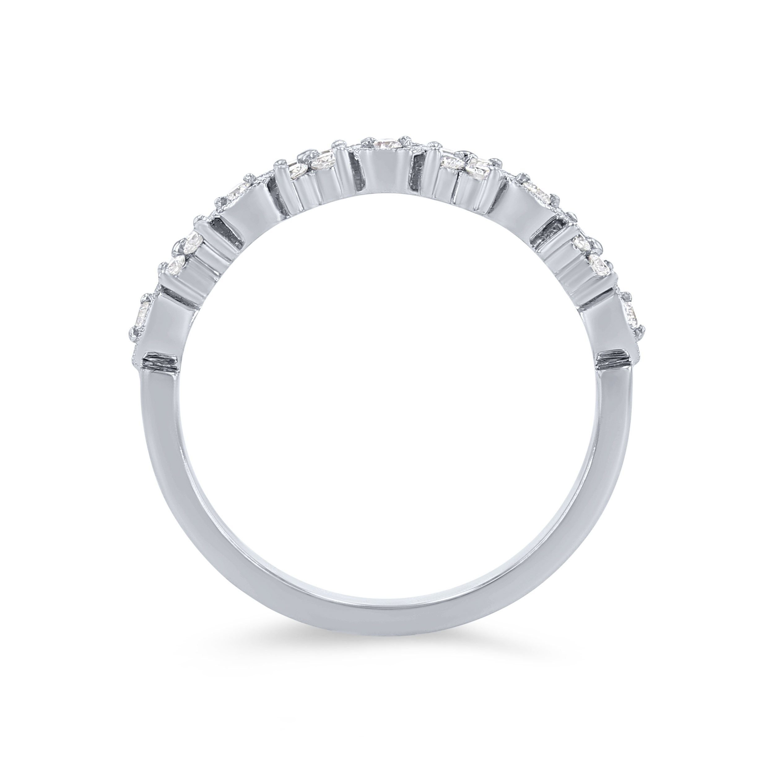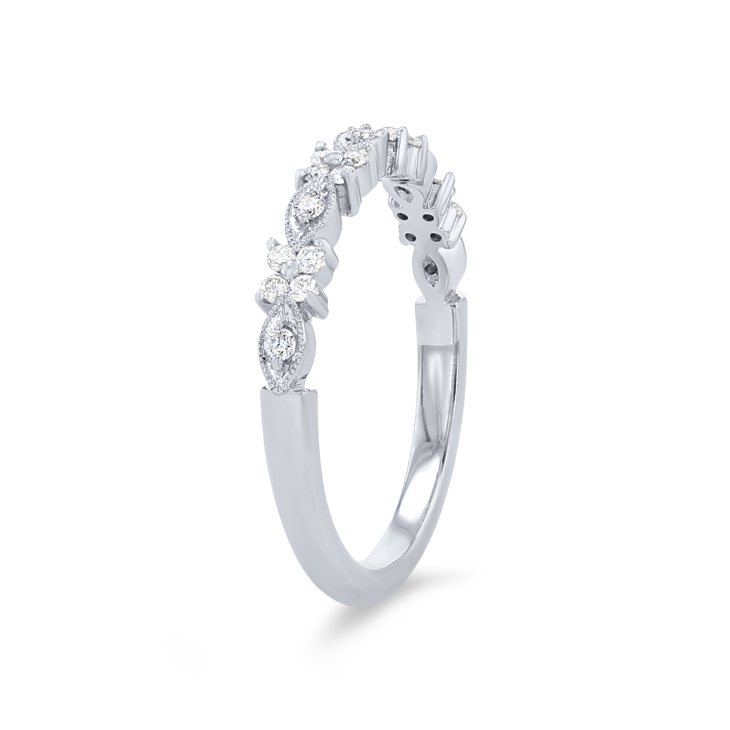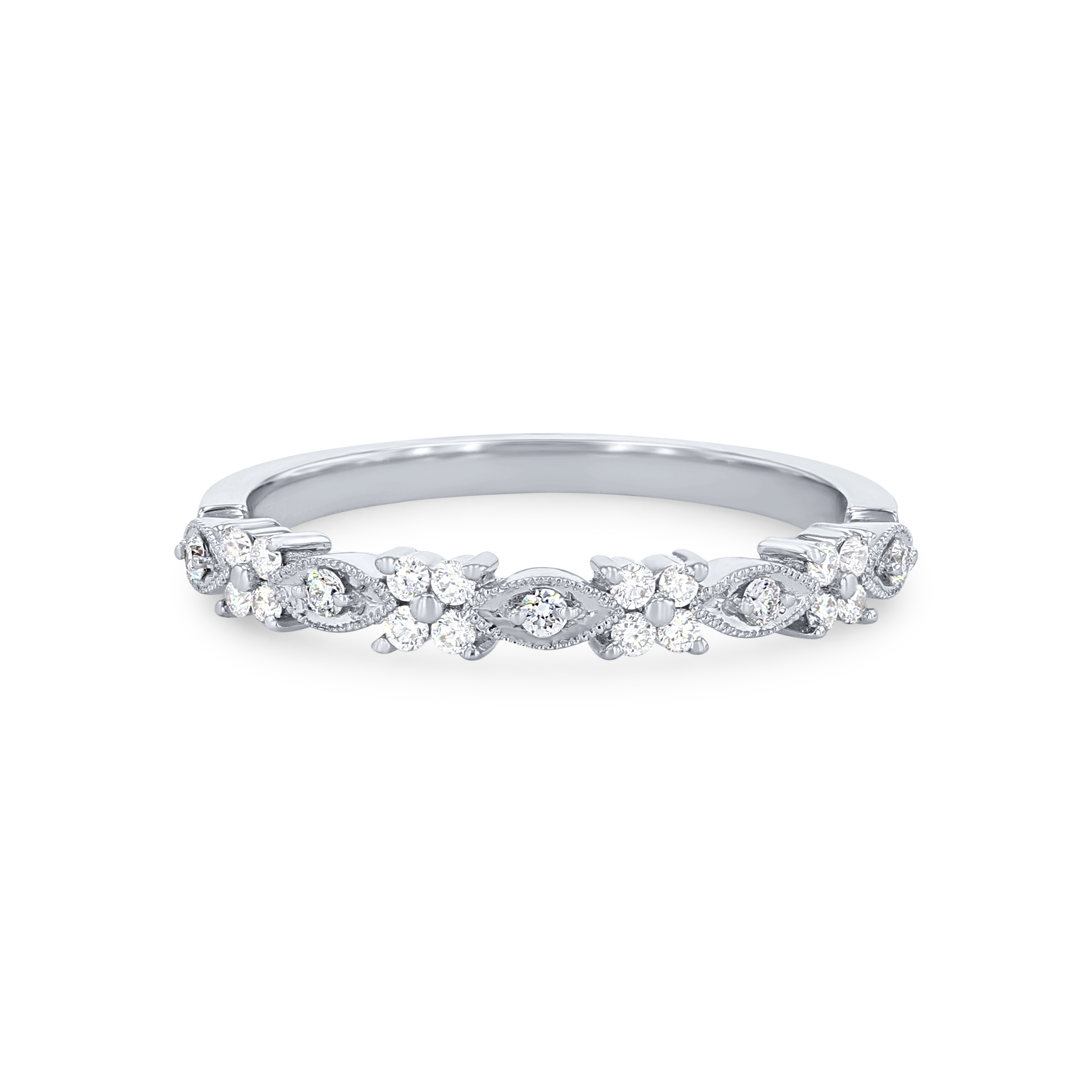 Product Description Beautifully ornate, this wedding band features 0.17 carats of round brilliant cut diamonds in alternating floral and marquise shapes accented by milgrain beading. Other Details Metal Color: White Gold Metal Color: Platinum Metal Color: Rose Gold Type: Ladies Wedding Band Diamond: Stackable Metal Color: Yellow Gold Wedding Band Type: Vintage Total Setting Diamond Carat Weight: 0.17TW Disable Reason: None Gemstone Type: Diamond