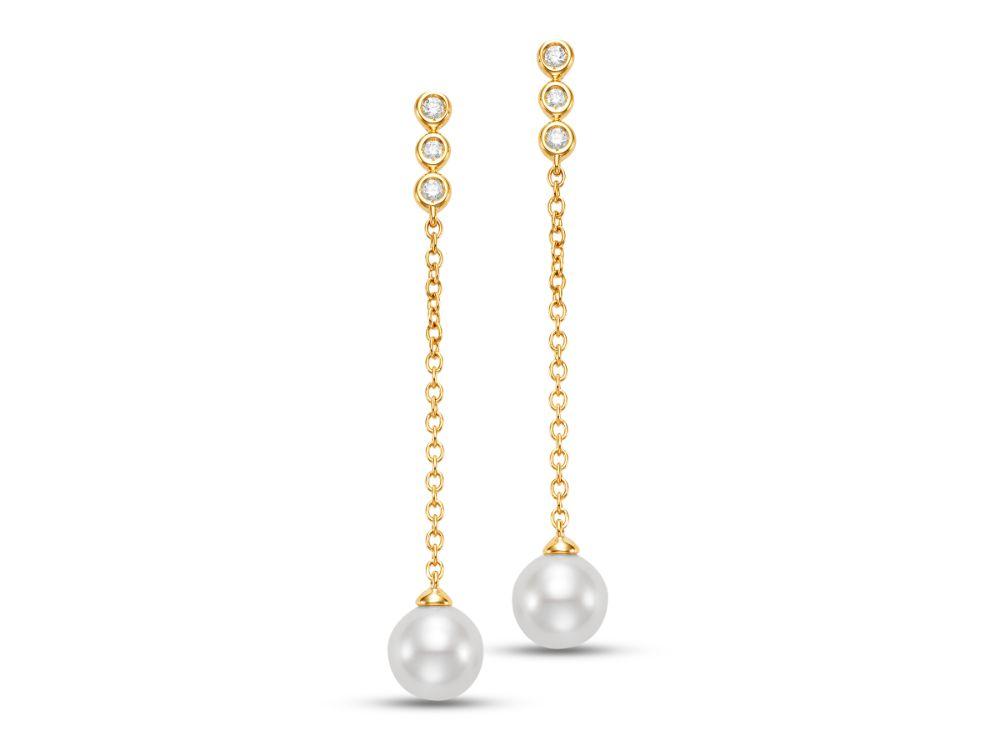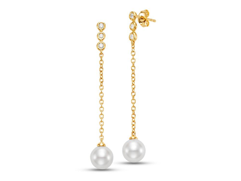Product Description Modern and elegant, these drop style earrings feature two freshwater pearls measuring 6.0-7.5 millimeters and round brilliant cut diamonds totaling 0.03 carats. Other Details Type: Earrings Earring Type: Gemstones Gemstone Type: Pearl Style: Contemporary Women Wedding Band Type: Gemstone Metal Color: Yellow Gold Disable Reason: None Total Setting Diamond Carat Weight: 0.03TW